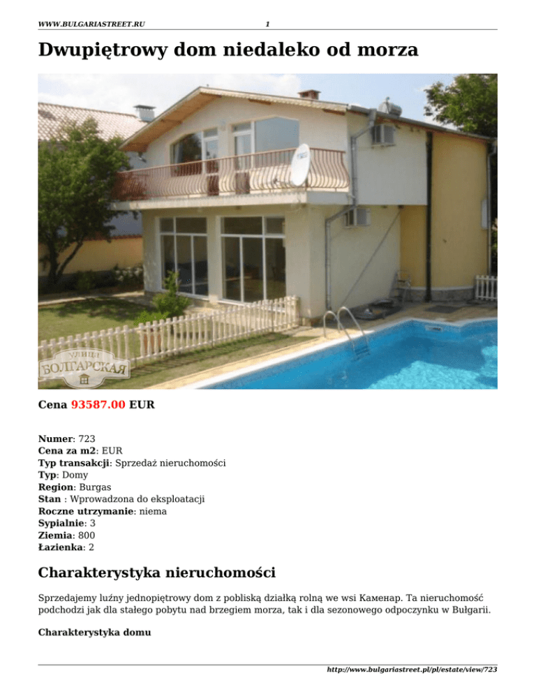 WWW.BULGARIASTREET.RU 1 Dwupiętrowy dom niedaleko od morza Cena 93587.00 EUR Numer: 723 Cena za m2: EUR Typ transakcji: Sprzedaż nieruchomości Typ: Domy Region: Burgas Stan : Wprowadzona do eksploatacji Roczne utrzymanie: niema Sypialnie: 3 Ziemia: 800 Łazienka: 2 Charakterystyka nieruchomości Sprzedajemy luźny jednopiętrowy dom z pobliską działką rolną we wsi Каменар. Ta nieruchomość podchodzi jak dla stałego pobytu nad brzegiem morza, tak i dla sezonowego odpoczynku w Bułgarii. Charakterystyka domu http://www.bulgariastreet.pl/pl/estate/view/723 WWW.BULGARIASTREET.RU 2 Dom jest rozmieszczony w pięknej bułgarskiej wsi Kamenar. Odległość do znanego balneologicznego miasta-kurortu Pomorie składa zaledwie 5 km, a do Burgasa - 15 Miejscowość słynie tamtą, że tu czyste powietrze, woda, a obok nie ma szkodliwych przemysłowych produkcji. Ostatnimi rokami mnóstwo cudzoziemców kupiły w Kamenar w domu dla stałego pobytu w wiejskiej miejscowości. Dużą wygodą jest bliski rozkład międzynarodowego portu lotniczego Sarafowo - zaledwie 10 km Dom, proponowany dla sprzedaży, był zbiorczy w 2005 roku. Podczas budownictwa wykorzystywały się gatunkowe budowlane materiały czołowych europejskich i bułgarskich producentów. Teraz dom znajduje się w przypilnowanym stanie. Plac domu składa 160 кв.м. Dom ma rzetelnie przemyślane funkcjonalne planowanie: trzy izolowane sypialnie(po 12 mkw., 13 mkw. i 14 кв.м), dwa kąpielowe pokoje z toaletami, duży gościnny pokój, kuchnia, dwie spiżarnie i dwa balkony. W domu ustalone ciepła poła, a także klimatyzator i słoneczne baterie. Doprowadzono kablową telewizję, telefoniczną linię i sygnalizację. Do domu przylega działka rolna placem 4,6 setki. Na działce rosną owocowe drzewa, jest altana dla odpoczynku, a także parkowanie na 2 samochody. Dodatkowo na działce jest basen placem 64 кв.м. Ustalone kolektory dla podgrzewania wody. Dom sprzedaje się z wewnętrzną obróbką "pod klucz" i cząstkowym umeblowaniem. Główne akcenty: ● ● ● Jakościowe budownictwo. Podchodzi dla stałego pobytu. Korzystna cena. Nie bierzemy komisję do naszych klientów! Infrastruktura ● ● ● ● ● ● ● ● Miejsca parkingowe Basen odkryty Elektrczność Woda Okna PVC Meble Przypilnowane terytorium Barbecue Informacje o regionie Burgas - to największe miasto w Południowo-wschodniej Bułgarii i czwarty po ilości ludności po Sofii, Warny i Plowdywa. Miasto - centrum jednoimiennego zarządu miasta i obwodu. Międzynarodowy port lotniczy znajduje się na odległości mniej 5 km od miasta. Burgas jest rozmieszczony w najgłębszej zachodniej części Burgaskiej zatoki i znajduje się do 390 km na wschód od bułgarskiej stolicy - r. Sofia. Odległość do Warny - 133 km, a do Plowdywu - 267 km Klimat http://www.bulgariastreet.pl/pl/estate/view/723 WWW.BULGARIASTREET.RU 3 Klimat w Burgasie jest subtropikalny i wilgotny. Temperatura powietrza latem składa 22,7 stopniów Celsjusza, a w zimie temperatura 2,1 stopni Celsjusza. Infrastruktura Miasto Burgas ma opracowaną infrastrukturę europejskiego poziomu. Po pierwsze, miasto jest dużym kolejowym centrum i morskim portem. Tu znajdują się kilka dworców autobusowych i międzynarodowego portu lotniczego. Aktywnie rozwija się spożywczy, elektronowy przemysł, budowa maszyn i do obróbki metali. Gospodarka rolna, leśny przemysł, budownictwo i turyzm najważniejsze branże, co przynosi stabilny dochód i miejsca pracy. Miasto ma w rozporządzeniu doskonałą infrastrukturę, konieczną dla stałego pobytu : sadki, szkoły, sklepy, rynki, polikliniki, apteki, banki, restauracje, kawiarnie, bary, bistro, duża ilość parkowych i stref odpoczynku. Słynny Nadmorski park i pobliska plaża jest zwłaszcza ulubiony mieszkańcami miasta i gośćmi miasta. Kontakty Agencja "Ulica Bułgarska" (Bulgaria Street Ltd) Bułgaria m. Burgas, 8000 ul. Mitropolit Simeon 3 Strona: www.bulgariastreet.ru http://www.bulgariastreet.pl/pl/estate/view/723 WWW.BULGARIASTREET.RU 4 Tel: + 359 894 51 50 51 Tel: + 48 223 906 334 Mail: [email protected] Mail: [email protected] Skype: bulstreet http://www.bulgariastreet.pl/pl/estate/view/723