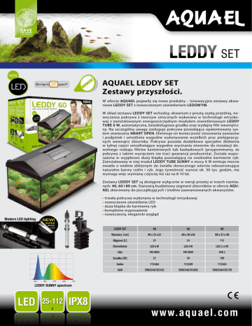 LEDDY SET NEW AQUAEL LEDDY SET Zestawy przyszłości. W ofercie AQUAEL pojawiły się nowe produkty – innowacyjne zestawy akwariowe LEDDY SET z nowoczesnym oświetleniem LEDOWYM. W skład zestawu LEDDY SET wchodzą: akwarium z prostą szybą przednią, nowoczesna pokrywa z tworzyw sztucznych wykonana w technologii wtryskowej z zainstalowanym energooszczędnym modułem oświetleniowym LEDDY TUBE 6 W, automatyczna, bezobsługowa grzałka oraz wydajny filtr wewnętrzny. Na szczególną uwagę zasługuje pokrywa posiadająca opatentowany system otwierania SMART OPEN. Eliminuje on konieczność stosowania zawiasów i podpórek i umożliwia wygodne wykonywanie wszelkich prac pielęgnacyjnych wewnątrz zbiornika. Pokrywa posiada dodatkowo specjalne żłobienia w tylnej części umożliwiające wygodne wycinanie otworów do instalacji dowolnego rodzaju filtrów kanistrowych lub kaskadowych (przypominamy, że pokrywa z takimi wycięciami nie traci gwarancji producenta). Została wyposażona w wyjątkowo dużą klapkę pozwalającą na swobodne karmienie ryb. Zainstalowany w niej moduł LEDDY TUBE SUNNY o mocy 6 W emituje mocne światło o widmie zbliżonym do światła słonecznego wiernie odwzorowujące naturalne barwy roślin i ryb. Jego żywotność wynosi ok. 50 tys. godzin, nie wymaga więc wymiany częściej niż raz na 8-10 lat. Zestawy LEDDY SET są dostępne wyłącznie w wersji prostej w trzech rozmiarach: 40, 60 i 80 cm. Stanowią budżetowy segment zbiorników w ofercie AQUAEL skierowany do początkujących i średnio zaawansowanych akwarystów. • trwała pokrywa wykonana w technologii wtryskowej • nowoczesne oświetlenie LED • duża klapka do karmienia ryb • kompletne wyposażenie • nowoczesny, elegancki wygląd Modern LED lighting 425 500 575 650 LEDDY SET 40 60 80 Wymiary [cm] 40 x 25 x25 60 x 30 x30 80 x 35 x 40 Objętość [L] 25 54 112 Oświetlenie LED 6 W LED 6 W LED 2 x 6 W Filtr PAT MINI PAT MINI FAN 2 Grzałka [W] 25 50 100 Index 113264 113249 113265 EAN 5905546192163 5905546191692 5905546192170 725 LeDDY Sunny spectrum LED 25-112 L IPX8 w w w.a q u a el .com