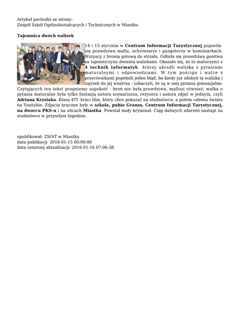 Artykuł pochodzi ze strony: Zespół Szkół Ogólnokształcących i Technicznych w Miastku Tajemnica dwóch walizek 14 i 15 stycznia w Centrum Informacji Turystycznej pojawiła się prawdziwa mafia, ochroniarze i gangsterzy w kominiarkach. Wszyscy z bronią gotową do strzału. Odbyła się prawdziwa gonitwa za tajemniczymi dwiema walizkami. Okazało się, że to maturzyści z 4 technik informatyk którzy ukradli walizkę z pytaniami maturalnymi i odpowiedziami. W tym pościgu i walce z przeciwnikami popełnili jeden błąd, bo kiedy już zdobyli tę walizkę i zajrzeli do jej wnętrza - zobaczyli, że są w niej pytania gimnazjalne. Czytających ten tekst pragniemy uspokoić - broń nie była prawdziwa, mafiozi również, walka o pytania maturalne była tylko fantazją autora scenariusza, reżysera i autora zdjęć w jednym, czyli Adriana Krysiaka. Klasa 4TI kręci film, który chce pokazać na studniówce, a potem całemu światu na Youtubie. Zdjęcia kręcone były w szkole, pubie Granss, Centrum Informacji Turystycznej, na dworcu PKS-u i na ulicach Miastka. Powstał mały kryminał. Ciąg dalszych zdarzeń nastapi na studniówce w przyszłym tygodniu. opublikował: ZSOiT w Miastku data publikacji: 2016-01-15 00:00:00 data ostatniej aktualizacji: 2016-01-16 07:06:38