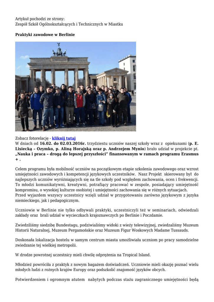 Artykuł pochodzi ze strony: Zespół Szkół Ogólnokształcących i Technicznych w Miastku Praktyki zawodowe w Berlinie Zobacz fotorelację - kliknij tutaj W dniach od 16.02. do 02.03.2016r. trzydziestu uczniów naszej szkoły wraz z opiekunami (p. E. Lisiecką – Ozymko, p. Aliną Horajską oraz p. Andrzejem Mynio) brało udział w projekcie pt. „Nauka i praca – drogą do lepszej przyszłości” finansowanym w ramach programu Erasmus +. Celem programu była mobilność uczniów na początkowym etapie szkolenia zawodowego oraz wzrost umiejętności zawodowych i kompetencji językowych uczestników. Nasz Projekt skierowany był do najlepszych uczniów wyróżniających się na tle szkoły pod względem zachowania, ocen i frekwencji. To młodzi komunikatywni, kreatywni, potrafiący pracować w zespole, posiadający umiejętność kompromisu, o wysokiej kulturze osobistej i umiejętności zachowania się w różnych sytuacjach. Przed wyjazdem wszyscy uczestnicy wzięli udział w przygotowaniu zarówno językowym z języka niemieckiego, jak i pedagogicznym. Uczniowie w Berlinie nie tylko odbywali praktyki, uczestniczyli też w seminariach, odwiedzali zakłady oraz brali udział w wycieczkach krajoznawczych po Berlinie i Poczdamie. Zwiedziliśmy siedzibę Bundestagu, podziwialiśmy widoki z wieży telewizyjnej, zwiedzaliśmy Muzeum Historii Naturalnej, Muzeum Pergamońskie oraz Muzeum Figur Woskowych Madame Tussauds. Doskonała lokalizacja hostelu w samym centrum miasta umożliwiała uczniom po pracy samodzielne zwiedzanie tej wielkiej metropolii. W drodze powrotnej uczestnicy mieli chwilę odprężenia na Tropical Island. Młodzież powróciła z praktyk z nowym bagażem doświadczeń. Uczniowie mieli okazję poznać wielu młodych ludzi z rożnych krajów Europy oraz podszkolić znajomość języków obcych. Potwierdzeniem i ogromnym atutem nabytych podczas stażu zagranicznego umiejętności będą certyfikaty wydane przez zagranicznych pracodawców przez organizację przyjmującą BERLINK. Dodatkowo wszyscy uczestnicy otrzymają Europass Mobilność uznawany w całej Unii Europejskiej, który niewątpliwie wpłynie na ich atrakcyjność w oczach przyszłego pracodawcy. A.Horajska – koordynator projektu opublikował: ZSOiT w Miastku data publikacji: 2016-03-07 00:00:00 data ostatniej aktualizacji: 2016-03-07 20:25:50