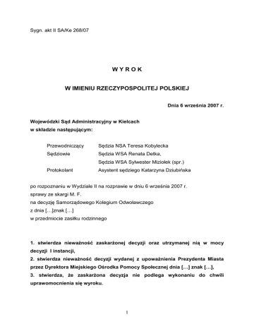Sygn. akt II SA/Ke 268/07 WYROK W IMIENIU RZECZYPOSPOLITEJ POLSKIEJ Dnia 6 września 2007 r. Wojewódzki Sąd Administracyjny w Kielcach w składzie następującym: Przewodniczący Sędzia NSA Teresa Kobylecka Sędziowie Sędzia WSA Renata Detka, Sędzia WSA Sylwester Miziołek (spr.) Protokolant Asystent sędziego Katarzyna Dziubińska po rozpoznaniu w Wydziale II na rozprawie w dniu 6 września 2007 r. sprawy ze skargi M. F. na decyzję Samorządowego Kolegium Odwoławczego z dnia […]znak […] w przedmiocie zasiłku rodzinnego 1. stwierdza niewaŜność zaskarŜonej decyzji oraz utrzymanej nią w mocy decyzji I instancji, 2. stwierdza niewaŜność decyzji wydanej z upowaŜnienia Prezydenta Miasta przez Dyrektora Miejskiego Ośrodka Pomocy Społecznej dnia […] znak […], 3. stwierdza, Ŝe zaskarŜona decyzja nie podlega wykonaniu do chwili uprawomocnienia się wyroku. 1 Sygn. akt II SA/Ke 268/07 UZASADNIENIE Decyzją z dnia […], podjętą w wyniku rozpatrzenia wniosku M. F. działający z upowaŜnienia Prezydenta Miasta Dyrektor Miejskiego Ośrodka Pomocy Społecznej przyznał wnioskodawczyni świadczenia rodzinne w postaci zasiłków rodzinnych wraz z dodatkami na czworo dzieci tj. A. F., D. F., K. F. i M. F. na okres zasiłkowy 2006 –2007. Postanowieniem z dnia […] organ I instancji na podstawie art. 149 § 1 kpa wznowił z urzędu postępowanie, zakończone decyzją z dnia […] wskazując jako podstawę prawną art. 145 § 1 pkt 5 kpa, z uwagi na fakt, iŜ wyszły na jaw istotne dla sprawy nowe okoliczności faktyczne lub nowe dowody istniejące w dniu wydania decyzji nieznane organowi, który wydał decyzję, polegające na tym, Ŝe wyszło na jaw, Ŝe małoletni A. F. począwszy od 11 maja 2006 r. przebywa w placówce opiekuńczo-wychowawczej, która zapewnia mu całodobowe utrzymanie ( początkowo w placówce w S. – K., a od dnia 12 października 2006 r. w MłodzieŜowym Ośrodku Wychowawczym w Ł.). M. F. zataiła fakt pobytu syna w tych placówkach i wnioskowała o świadczenie rodzinne na niego. We wznowionym postępowaniu organ I instancji –Dyrektor Miejskiego Ośrodka Pomocy Społecznej działając z upowaŜnienia Prezydenta Miasta (Nr […] z dnia […]) - wydał dwie decyzje: - z dnia […], nr […], w której powołując się na przepis art. 151 § 1 kpa postanowił uchylić w całości z dniem 1 września 2006 r. decyzję z dnia […], przyznającą zasiłek rodzinny i dodatki do zasiłku rodzinnego, - z dnia […] nr […], w której na podstawie art. 4 ust 2, art. 5, art. 6, art. 12a, art. 14, art. 24 ust. 1 ustawy z dnia 28 listopada 2003 r. o świadczeniach rodzinnych orzekł o - przyznaniu M. F. świadczenia w formie zasiłku rodzinnego na dzieci D. F., K. F., M. F. w kwotach po […] zł miesięcznie na okres od 1 września 2006 r do 31 sierpnia 2007 r. oraz dodatków do zasiłku 2 rodzinnego z tytułu rozpoczęcie roku szkolnego przyznanego na rzecz dzieci D., K. i M. w kwotach po […]zł jednorazowo, a takŜe dodatku do zasiłku rodzinnego z tytułu wychowywania dziecka w rodzinie wielodzietnej przyznany na M. F. w kwocie […] zł miesięcznie na okres od 1 września 2006 r do 31 sierpnia 2007 r., a takŜe o - odmowie świadczenia w formie zasiłku rodzinnego i dodatku z tytułu rozpoczęcia roku szkolnego wnioskowanych na rzecz A. F. i dodatku z tytułu wychowywania dziecka w rodzinie wielodzietnej, wnioskowanego na rzecz K. F. M. F. wniosła odwołanie jedynie od decyzji z dnia […], nr […]. Samorządowe Kolegium Odwoławcze rozpoznając powyŜsze odwołanie decyzją z dnia […], na podstawie art. 138 § 1 pkt 1 kpa utrzymało w mocy zaskarŜoną decyzję. W uzasadnieniu organ odwoławczy wskazał, Ŝe poniewaŜ juŜ w dacie wydawania decyzji, czyli w dniu […] oraz w dniu […], od którego przyznano świadczenie rodzinne nowa sytuacja rodzinna M. F. polegająca na pobycie syna A. w placówce opiekuńczo-wychowaczej istniała, a jedynie nie była znana organowi wydającemu decyzję - organ I instancji prawidłowo wyeliminował z obrotu prawnego ostateczną decyzję przyznającą stronie świadczenie rodzinne na czworo dzieci, w tym A. F., a następnie odrębną decyzją, równieŜ dnia […] przyznał świadczenia rodzinne na troje dzieci, z wyłączeniem A. F. Organ odwoławczy zauwaŜył, Ŝe wprawdzie w doktrynie i w orzecznictwie utrwalone zostało, Ŝe w wykonaniu dyspozycji art. 151 kpa organ wydaje jedną decyzję, mocą której uchyla decyzję ostateczną i na nowo orzeka co do istoty sprawy, jednakŜe niefortunne brzmienie tych przepisów spowodowało, Ŝe organ I instancji przyjmując te przepisy literalnie, dwiema decyzjami: uchylił własną decyzję ostateczną z dnia [...] i orzekł co do istoty sprawy przyznając świadczenie na troje dzieci z wyłączeniem A. F. Skargę do Wojewódzkiego Sądu Administracyjnego na decyzję Samorządowego Kolegium Odwoławczego z dnia […] wniosła M. F. wskazując, Ŝe niesłusznie została pozbawiona prawa do świadczeń rodzinnych i zaliczki alimentacyjnej na rzecz syna A. F., poniewaŜ w tej dacie, zgodnie z orzeczeniem Sądu Rejonowego syn powinien przebywać w domu rodzinnym. Ponadto skarŜąca 3 zarzuciła, Ŝe organ wadliwie przyjął, Ŝe placówka opiekuńczo-wychowawcza zapewnia całodobowe utrzymanie na koszt Skarbu Państwa oraz Ŝe pobyt jej syna w placówce w Ł. jest stały. W odpowiedzi na skargę organ wniósł o jej oddalenie i podtrzymał argumenty zawarte w uzasadnieniu decyzji. Wojewódzki Sąd Administracyjny zwaŜył, co następuje: Skarga podlega uwzględnieniu, aczkolwiek przyczyny jej uwzględnienia nie są toŜsame z przedstawionymi przez skarŜącą. Zgodnie z art. 1 ustawy z dnia 25 lipca 2002 r. Prawo o ustroju sądów administracyjnych (Dz. U. Nr 153, poz. 1269) sądy administracyjne kontrolują działalność administracji publicznej pod względem zgodności z prawem. Sąd rozstrzyga w granicach danej sprawy, nie będąc jednak związany zarzutami i wnio