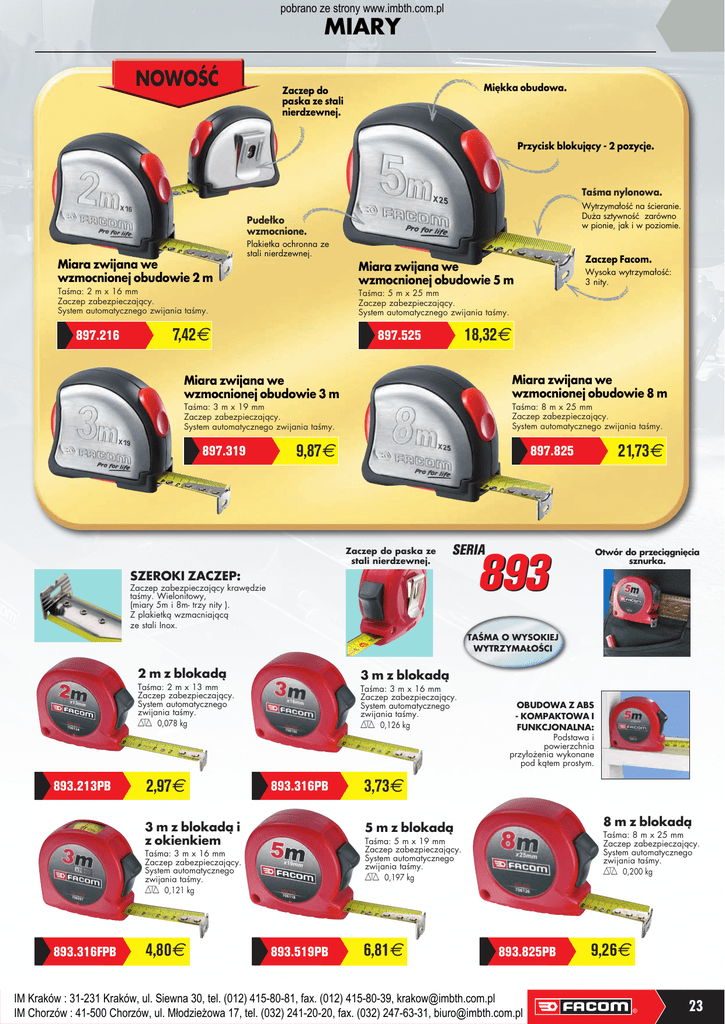 pobrano ze strony www.imbth.com.pl MIARY Nowość Miękka obudowa. Zaczep do paska ze stali nierdzewnej. Przycisk blokujący - 2 pozycje. Taśma nylonowa. Wytrzymałość na ścieranie. Duża sztywność zarówno w pionie, jak i w poziomie. Pudełko wzmocnione. Miara zwijana we wzmocnionej obudowie 2 m Plakietka ochronna ze stali nierdzewnej. Taśma: 2 m x 16 mm Zaczep zabezpieczający. System automatycznego zwijania taśmy. 897.216 Wysoka wytrzymałość: 3 nity. Taśma: 5 m x 25 mm Zaczep zabezpieczający. System automatycznego zwijania taśmy. 7,42e 18,32e 897.525 Miara zwijana we wzmocnionej obudowie 8 m Miara zwijana we wzmocnionej obudowie 3 m Taśma: 8 m x 25 mm Zaczep zabezpieczający. System automatycznego zwijania taśmy. Taśma: 3 m x 19 mm Zaczep zabezpieczający. System automatycznego zwijania taśmy. 897.319 Zaczep Facom. Miara zwijana we wzmocnionej obudowie 5 m 9,87e 21,73e 897.825 Zaczep do paska ze stali nierdzewnej. SEriA SZEROKI ZACZEP: Zaczep zabezpieczający krawędzie taśmy. Wielonitowy, (miary 5m i 8m- trzy nity ). Z plakietką wzmacniającą ze stali Inox. 893 Otwór do przeciągnięcia sznurka. TAŚMA O WYSOKIEJ WYTRZYMAŁOŚCI 2 m z blokadą 3 m z blokadą Taśma: 2 m x 13 mm Zaczep zabezpieczający. System automatycznego zwijania taśmy. D 0,078 kg 893.213PB 2,97e Taśma: 3 m x 16 mm Zaczep zabezpieczający. System automatycznego zwijania taśmy. D 0,126 kg 893.316PB 3 m z blokadą i z okienkiem 4,80e 3,73e 8 m z blokadą 5 m z blokadą Taśma: 8 m x 25 mm Zaczep zabezpieczający. System automatycznego zwijania taśmy. D 0,200 kg Taśma: 5 m x 19 mm Zaczep zabezpieczający. System automatycznego zwijania taśmy. D 0,197 kg Taśma: 3 m x 16 mm Zaczep zabezpieczający. System automatycznego zwijania taśmy. D 0,121 kg 893.316FPB OBUDOWA Z ABS - KOMPAKTOWA I FUNKCJONALNA: Podstawa i powierzchnia przyłożenia wykonane pod kątem prostym. 893.519PB 6,81e 893.825PB IM Kraków : 31-231 Kraków, ul. Siewna 30, tel. (012) 415-80-81, fax. (012) 415-80-39, [email protected] www.facom.pl IM Chorzów : 41-500 Chorzów, ul. Młodzieżowa 17, tel. (032) 241-20-20, fax. (032) 247-63-31, [email protected] 9,26e ® 23