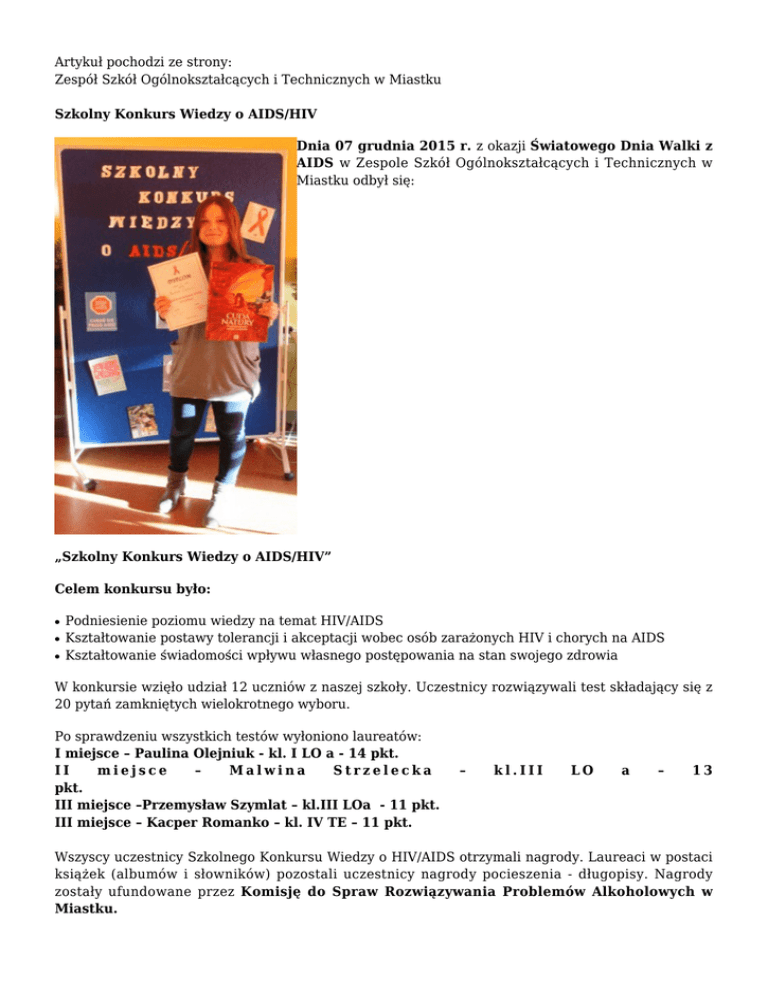 Artykuł pochodzi ze strony: Zespół Szkół Ogólnokształcących i Technicznych w Miastku Szkolny Konkurs Wiedzy o AIDS/HIV Dnia 07 grudnia 2015 r. z okazji Światowego Dnia Walki z AIDS w Zespole Szkół Ogólnokształcących i Technicznych w Miastku odbył się: „Szkolny Konkurs Wiedzy o AIDS/HIV” Celem konkursu było: ● ● ● Podniesienie poziomu wiedzy na temat HIV/AIDS Kształtowanie postawy tolerancji i akceptacji wobec osób zarażonych HIV i chorych na AIDS Kształtowanie świadomości wpływu własnego postępowania na stan swojego zdrowia W konkursie wzięło udział 12 uczniów z naszej szkoły. Uczestnicy rozwiązywali test składający się z 20 pytań zamkniętych wielokrotnego wyboru. Po sprawdzeniu wszystkich testów wyłoniono laureatów: I miejsce – Paulina Olejniuk - kl. I LO a - 14 pkt. II miejsce – Malwina Strzelecka pkt. III miejsce –Przemysław Szymlat – kl.III LOa - 11 pkt. III miejsce – Kacper Romanko – kl. IV TE – 11 pkt. – kl.III LO a – 13 Wszyscy uczestnicy Szkolnego Konkursu Wiedzy o HIV/AIDS otrzymali nagrody. Laureaci w postaci książek (albumów i słowników) pozostali uczestnicy nagrody pocieszenia - długopisy. Nagrody zostały ufundowane przez Komisję do Spraw Rozwiązywania Problemów Alkoholowych w Miastku. opublikował: ZSOiT w Miastku data publikacji: 2015-12-07 19:02:09 data ostatniej aktualizacji: 2015-12-07 19:05:10