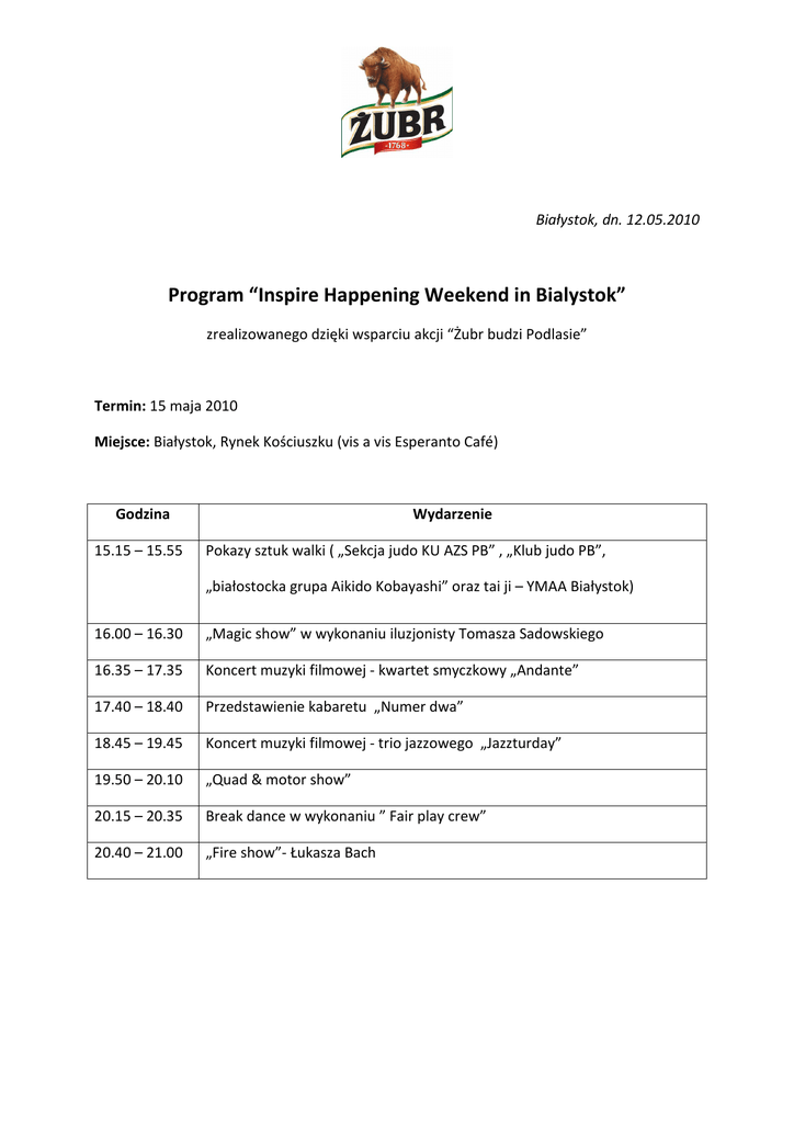 Białystok, dn. 12.05.2010 Program “Inspire Happening Weekend in Bialystok” zrealizowanego dzięki wsparciu akcji “Żubr budzi Podlasie” Termin: 15 maja 2010 Miejsce: Białystok, Rynek Kościuszku (vis a vis Esperanto Café) Godzina 15.15 – 15.55 Wydarzenie Pokazy sztuk walki ( „Sekcja judo KU AZS PB” , „Klub judo PB”, „białostocka grupa Aikido Kobayashi” oraz tai ji – YMAA Białystok) 16.00 – 16.30 „Magic show” w wykonaniu iluzjonisty Tomasza Sadowskiego 16.35 – 17.35 Koncert muzyki filmowej - kwartet smyczkowy „Andante” 17.40 – 18.40 Przedstawienie kabaretu „Numer dwa” 18.45 – 19.45 Koncert muzyki filmowej - trio jazzowego „Jazzturday” 19.50 – 20.10 „Quad & motor show” 20.15 – 20.35 Break dance w wykonaniu ” Fair play crew” 20.40 – 21.00 „Fire show”- Łukasza Bach Termin: 16 maja 2010 Miejsce: Białystok, Planty (przy głównej fontannie) Godzina Wydarzenie 13.40 – 14.10 Pokaz tresowanych psów - „osppieczurki” 14.15 – 15.15 Pokaz ogromnej wielkości baniek mydlanych- „Mały teatrzyk” 15.20 – 16.00 „Magic show”- iluzjonista Łukasza Granta 16.05 – 17.05 Występ mimów - „Mały teatrzyk” 17.10 – 18.10 „Smooth jazz” w wykonaniu trio jazzowego „Jazzturday” 18.15 – 19.15 Przedstawienie kabaretu „Inaczej” 19.20 – 20.20 Koncert muzyki klasycznej - kwartet smyczkowy „Primavera” 20.25 – 20.45 „Capoeira show” – „Abada Białystok” 20.50 – 21.10 „Fire show” - grupa „Czupakabra” Happeningi towarzyszące: akademia golfa, nauka gry i rozgrywanie partii towarzyskich w szachy, a także Inspiring before - Fiesta Latina - Klub Kontakt start 21 00 (12.05)