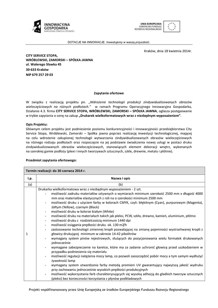 DOTACJE NA INNOWACJE. Inwestujemy w waszą przyszłość. Kraków, dnia 18 kwietnia 2014r. CITY SERVICE STOPA, WRÓBLEWSKI, ZAMORSKI – SPÓŁKA JAWNA ul. Walerego Sławka 45 30-633 Kraków NIP 679 257 29 03 Zapytanie ofertowe W związku z realizacją projektu pn. „Wdrożenie technologii produkcji zindywidualizowanych obrazów wieloczęściowych na różnych podłożach.” w ramach Programu Operacyjnego Innowacyjna Gospodarka, Działanie 4.3. firma CITY SERVICE STOPA, WRÓBLEWSKI, ZAMORSKI – SPÓŁKA JAWNA, ogłasza postępowanie w trybie zapytania o cenę na zakup „Drukarek wielkoformatowych wraz z niezbędnym wyposażeniem”. Opis Projektu: Głównym celem projektu jest podniesienie poziomu konkurencyjności i innowacyjności przedsiębiorstwa City Service Stopa, Wróblewski, Zamorski – Spółka jawna poprzez realizację inwestycji technologicznej, mającej na celu wdrożenie zakupionej technologii wytwarzania zindywidualizowanych obrazów wieloczęściowych na różnego rodzaju podłożach oraz rozpoczęcie na jej podstawie świadczenia nowej usługi w postaci druku zindywidualizowanych obrazów wieloczęściowych, stanowiących element dekoracji wnętrz, wykonanych na szerokiej gamie podłoży (plexi i innych tworzywach sztucznych, szkle, drewnie, metalu i płótnie). Przedmiot zapytania ofertowego: Termin realizacji: do 30 czerwca 2014 r. l.p. Nazwa i opis (a) (b) Drukarka wielkoformatowa wraz z niezbędnym wyposażeniem - 2 szt. - możliwość zadruku materiałów sztywnych o wymiarach minimum szerokość 2500 mm x długość 4000 mm oraz materiałów elastycznych z roli na o szerokości minimum 2500 mm - możliwość druku z użyciem farby w kolorach CMYK, czyli: błękitnym (Cyan), purpurowym (Magenta), żółtym (Yellow), czarnym (Black) - możliwość druku w kolorze białym (White) - możliwość druku na materiałach takich jak pleksi, PCW, szkło, drewno, kamień, aluminium, płótno - możliwość druku z rozdzielczością minimum 1440 dpi - możliwość osiągania prędkości druku ok. 130 m2/h - zastosowanie technologii zmiennej kropli pozwalającej na zmianę pojemności wystrzeliwanej kropli z głowicy drukującej minimum w zakresie 14-42 pikolitrów - wymagany system pinów rejestrowych, służących do pozycjonowania wielu formatek drukowanych jednocześnie - wymagane zabezpieczenie na karetce, które ma za zadanie uchronić głowicę przed uszkodzeniem w przypadku podniesienia się materiału - możliwość regulacji natężenia mocy lamp, co pozwoli zaoszczędzić pobór mocy a tym samym wydłużyć żywotność lamp - wymagany system utwardzania farby metodą promieni UV gwarantujący najwyższą jakość wydruku przy zachowaniu jednocześnie wysokich prędkości produkcyjnych - możliwość wykorzystania farb charakteryzujących się wysoką adhezją do gładkich tworzyw sztucznych (pleksi) bez konieczności korzystania z płynów podkładowych 1 Projekt współfinansowany przez Unię Europejską ze środków Europejskiego Funduszu Rozwoju Regionalnego DOTACJE NA INNOWACJE. Inwestujemy w waszą przyszłość. - wymagane urządzenie jonizujące powietrze wymagany automatyczny system przesuwu sztywnych materiałów o długości większej niż 1500 mm wymagana niska awaryjność wymagane niskie koszty eksploatacji Nie istnieje możliwość składania ofert częściowych. Oferty niekompletne nie będą rozpatrywane. Zamawiający dopuszcza podpisanie oddzielnych umów na realizację powyższych zakupów. Kryteria wyboru ofert: 1. obligatoryjne: Ważność oferty: min 60 dni Złożenie oferty na formularzu ofertowym. Wypełnienie formularza danymi pozwalającymi ocenić ofertę oraz złożenie oświadczeń Oferta powinna być opatrzona datą sporządzenia, danymi Oferenta (nazwa i adres, telefon) 2. punktowe: Kryteria wyboru Cena netto obliczana wg wzoru: C min A n = ----------------- x 100x70% Cr C min – cena minimalna w zbiorze C r – cena oferty rozpatrywanej A n – ilość punktów przyznana ofercie Gwarancja na sprzęt 15% Punktacja: Gwarancja: 12 miesięcy i mniej – 5 pkt. Gwarancja: powyżej 12 miesięcy do miesięcy włącznie – 10 pkt. Gwarancja: powyżej 24 miesięcy – 15 pkt. 24 Dostępność serwisu Znaczenie 70% 15% Punktacja: Reakcja serwisu: w ciągu 12 godzin – 15 pkt. Reakcja serwisu: powyżej 12 godzin do 24 godzin włącznie – 10 pkt. Reakcja serwisu: powyżej 24 godzin –5 pkt. Miejsce składania ofert: Oferty należy dostarczać osobiście bądź przesyłać pocztą tradycyjną lub elektroniczną na adres: Projekt współfinansowany przez Unię Europejską ze środków Europejskiego Funduszu Rozwoju Regionalnego DOTACJE NA INNOWACJE. Inwestujemy w waszą przyszłość. CITY SERVICE STOPA, WRÓBLEWSKI, ZAMORSKI – SPÓŁKA JAWNA ul. Walerego Sławka 45 30-633 Kraków e-mail: [email protected] Termin dostarczenia ofert upływa w dniu : 07 maja 2014 r. Zastrzeżenia Niniejsze zapytanie ofertowe nie zobowiązuje firmy CITY SERVICE STOPA, WRÓBLEWSKA, ZAMORSKI-SPÓŁKA JAWNA do żadnego określonego działania. Wydanie niniejszego zapytania ofertowego nie zobowiązuje firmy CITY SERVICE STOPA, WRÓBLEWSKA, ZAMORSKI-SPÓŁKA JAWNA do akceptacji oferty, w całości lub części i nie zobowiązuje firmy CITY SERVICE STOPA, WRÓBLEWSKA, ZAMORSKI-SPÓŁKA JAWNA do składania wyjaśnień czy powodów akceptacji lub odrzucenia oferty. CITY SERVICE STOPA, WRÓBLEWSKA, ZAMORSKI-SPÓŁKA JAWNA nie może być pociągana do odpowiedzialności za jakiekolwiek koszty czy wydatki poniesione przez oferentów w związku z przygotowaniem i dostarczeniem oferty. CITY SERVICE STOPA, WRÓBLEWSKA, ZAMORSKI-SPÓŁKA JAWNA zastrzega sobie prawo w każdej chwili do zmian całości lub części zapytania ofertowego. .............................. podpis i pieczęć firmy Projekt współfinansowany przez Unię Europejską ze środków Europejskiego Funduszu Rozwoju Regionalnego DOTACJE NA INNOWACJE. Inwestujemy w waszą przyszłość. Formularz ofertowy 