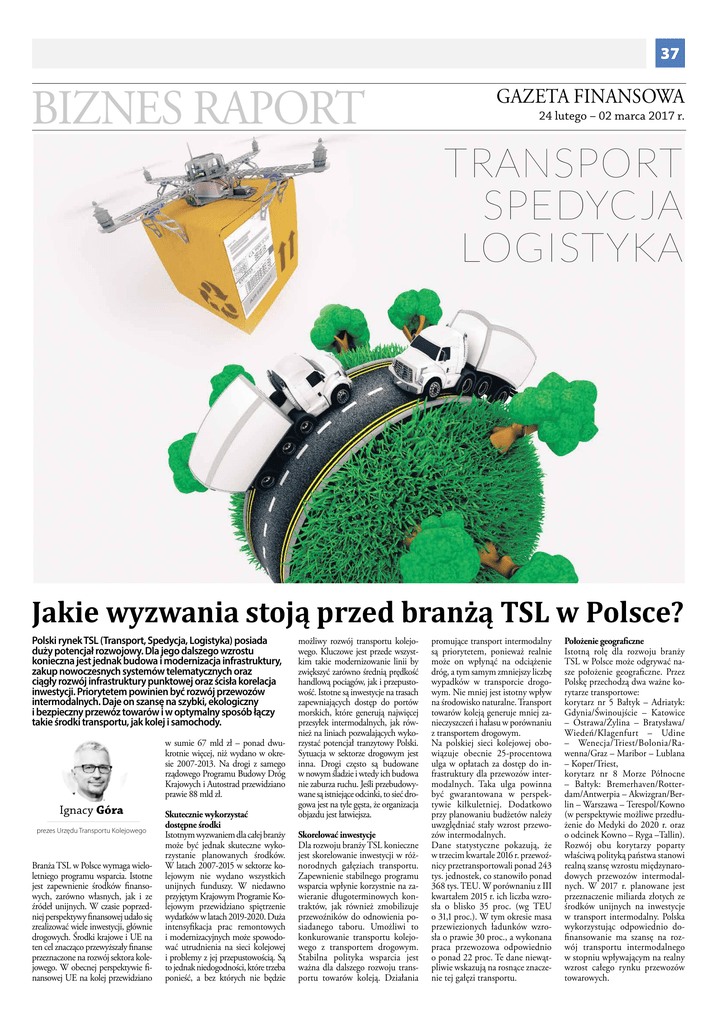 37 BIZNES RAPORT GAZETA FINANSOWA 24 lutego – 02 marca 2017 r. TRANSPORT SPEDYCJA LOGISTYKA Jakie wyzwania stoją przed branżą TSL w Polsce? Polski rynek TSL (Transport, Spedycja, Logistyka) posiada duży potencjał rozwojowy. Dla jego dalszego wzrostu konieczna jest jednak budowa i modernizacja infrastruktury, zakup nowoczesnych systemów telematycznych oraz ciągły rozwój infrastruktury punktowej oraz ścisła korelacja inwestycji. Priorytetem powinien być rozwój przewozów intermodalnych. Daje on szansę na szybki, ekologiczny i bezpieczny przewóz towarów i w optymalny sposób łączy takie środki transportu, jak kolej i samochody. w sumie 67 mld zł – ponad dwukrotnie więcej, niż wydano w okresie 2007-2013. Na drogi z samego rządowego Programu Budowy Dróg Krajowych i Autostrad przewidziano prawie 88 mld zł. Ignacy Góra prezes Urzędu Transportu Kolejowego Branża TSL w Polsce wymaga wieloletniego programu wsparcia. Istotne jest zapewnienie środków finansowych, zarówno własnych, jak i ze źródeł unijnych. W czasie poprzedniej perspektywy finansowej udało się zrealizować wiele inwestycji, głównie drogowych. Środki krajowe i UE na ten cel znacząco przewyższały finanse przeznaczone na rozwój sektora kolejowego. W obecnej perspektywie finansowej UE na kolej przewidziano Skutecznie wykorzystać dostępne środki Istotnym wyzwaniem dla całej branży może być jednak skuteczne wykorzystanie planowanych środków. W latach 2007-2015 w sektorze kolejowym nie wydano wszystkich unijnych funduszy. W niedawno przyjętym Krajowym Programie Kolejowym przewidziano spiętrzenie wydatków w latach 2019-2020. Duża intensyfikacja prac remontowych i modernizacyjnych może spowodować utrudnienia na sieci kolejowej i problemy z jej przepustowością. Są to jednak niedogodności, które trzeba ponieść, a bez których nie będzie możliwy rozwój transportu kolejowego. Kluczowe jest przede wszystkim takie modernizowanie linii by zwiększyć zarówno średnią prędkość handlową pociągów, jak i przepustowość. Istotne są inwestycje na trasach zapewniających dostęp do portów morskich, które generują najwięcej przesyłek intermodalnych, jak również na liniach pozwalających wykorzystać potencjał tranzytowy Polski. Sytuacja w sektorze drogowym jest inna. Drogi często są budowane w nowym śladzie i wtedy ich budowa nie zaburza ruchu. Jeśli przebudowywane są istniejące odcinki, to sieć drogowa jest na tyle gęsta, że organizacja objazdu jest łatwiejsza. Skorelować inwestycje Dla rozwoju branży TSL konieczne jest skorelowanie inwestycji w różnorodnych gałęziach transportu. Zapewnienie stabilnego programu wsparcia wpłynie korzystnie na zawieranie długoterminowych kontraktów, jak również zmobilizuje przewoźników do odnowienia posiadanego taboru. Umożliwi to konkurowanie transportu kolejowego z transportem drogowym. Stabilna polityka wsparcia jest ważna dla dalszego rozwoju transportu towarów koleją. Działania promujące transport intermodalny są priorytetem, ponieważ realnie może on wpłynąć na odciążenie dróg, a tym samym zmniejszy liczbę wypadków w transporcie drogowym. Nie mniej jest istotny wpływ na środowisko naturalne. Transport towarów koleją generuje mniej zanieczyszczeń i hałasu w porównaniu z transportem drogowym. Na polskiej sieci kolejowej obowiązuje obecnie 25-procentowa ulga w opłatach za dostęp do infrastruktury dla przewozów intermodalnych. Taka ulga powinna być gwarantowana w perspektywie kilkuletniej. Dodatkowo przy planowaniu budżetów należy uwzględniać stały wzrost przewozów intermodalnych. Dane statystyczne pokazują, że w trzecim kwartale 2016 r. przewoźnicy przetransportowali ponad 243 tys. jednostek, co stanowiło ponad 368 tys. TEU. W porównaniu z III kwartałem 2015 r. ich liczba wzrosła o blisko 35 proc. (wg TEU o 31,1 proc.). W tym okresie masa przewiezionych ładunków wzrosła o prawie 30 proc., a wykonana praca przewozowa odpowiednio o ponad 22 proc. Te dane niewątpliwie wskazują na rosnące znaczenie tej gałęzi transportu. Położenie geograficzne Istotną rolę dla rozwoju branży TSL w Polsce może odgrywać nasze położenie geograficzne. Przez Polskę przechodzą dwa ważne korytarze transportowe: korytarz nr 5 Bałtyk – Adriatyk: Gdynia/Świnoujście – Katowice – Ostrawa/Żylina – Bratysława/ Wiedeń/Klagenfurt – Udine – Wenecja/Triest/Bolonia/Rawenna/Graz – Maribor – Lublana – Koper/Triest, korytarz nr 8 Morze Północne – Bałtyk: Bremerhaven/Rotterdam/Antwerpia – Akwizgran/Berlin – Warszawa – Terespol/Kowno (w perspektywie możliwe przedłużenie do Medyki do 2020 r. oraz o odcinek Kowno – Ryga –Tallin). Rozwój obu korytarzy poparty właściwą polityką państwa stanowi realną szansę wzrostu międzynarodowych przewozów intermodalnych. W 2017 r. planowane jest przeznaczenie miliarda złotych ze środków unijnych na inwestycje w transport intermodalny. Polska wykorzystując odpowiednio dofinansowanie ma szansę na rozwój transportu intermodalnego w stopniu wpływającym na realny wzrost całego rynku przewozów towarowych. 38 RYNEK TSL W POLSCE GAZETA FINANSOWA 24 lutego – 02 marca 2017 r. BIZNES RAPORT Co można powierzyć firmom TSL, czyli bezpieczeństwo w drodze Biorąc pod uwagę aktualny potencjał rynku transportowego, ciężko jest znaleźć rzecz, która nie mogłaby zostać przetransportowana. Nieważne, czy jest to tramwaj, żywe zwierzęta czy elementy wiatraka. Operatorów logistycznych ogranicza najczęściej brak odpowiedniego taboru oraz możliwości przeładunkowych. Marcin Dudek key account manager DTW Logistics Na rynku występują więc zarówno przewoźnicy specjalizujący się w transporcie różnego rodzaju przesyłek, na przykład farmaceutyki, przesyłki ponadnormatywne, czy wymagające temperatury kontrolowanej, jak i podmioty, które starają się zaspokoić jak najwięcej potrzeb swoich klient