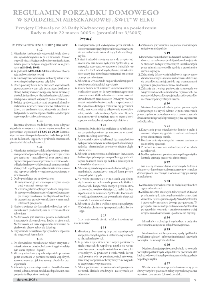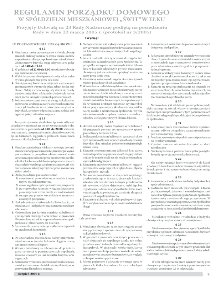 REGULAMIN PORZĄDKU DOMOWEGO W SPÓŁDZIELNI MIESZKANIOWEJ „ŚWIT”W EŁKU Przyjęty Uchwałą nr 23 Rady Nadzorczej podjętą na posiedzeniu Rady w dniu 22 marca 2005 r. (protokół nr 3/2005) (Wyciąg) IV POSTANOWIENIA PORZĄDKOWE § 12 1. Mieszkańcy i osoby przebywające w ich lokalu obowiązani są do zachowywania się na terenie osiedla i domów w sposób nie zakłócający spokoju innym mieszkańcom. Głośne prace w budynku mogą odbywać się w godzinach od 8.00 do 19.00. 2. W godzinach od 22.00 do 6.00 mieszkańców obowiązuje zachowanie ciszy nocnej. 3. W dni świąteczne obowiązuje całkowity zakaz wykonywania głośnych prac przez całą dobę. 4. Dzieci powinny bawić się w miejscach wydzielonych, przeznaczonych w tym celu (place zabaw, boiska osiedlowe). Należy zwracać uwagę, aby dzieci nie bawiły się obok śmietników, w klatkach schodowych, korytarzach piwnic i innych wspólnych pomieszczeniach. 5. Rodzice są obowiązani zwracać uwagę na kulturalne zachowanie się dzieci; za niewłaściwe zachowanie się dzieci, jak brudzenie ścian, niszczenie urządzeń w budynkach, zieleńców odpowiedzialni są rodzice pod rygorem pokrycia kosztów naprawy. § 13 Trzepanie dywanów, chodników itp. może odbywać się jedynie w miejscach na ten cel wyznaczonych w dni powszednie, w godzinach od 8.00 do 20.00. Zabrania się czyszczenia i trzepania dywanów, chodników, pościeli, itp. na balkonach, loggiach, w pralniach, suszarniach, piwnicach i klatkach schodowych. § 14 1. Mieszkańcy posiadający w lokalach zwierzęta powinni im zapewnić odpowiednią opiekę, przestrzegać wymogów sanitarno – porządkowych oraz usuwać zanieczyszczenia spowodowane przez nie na terenie osiedla i w klatkach schodowych lub w innych pomieszczeniach służących do wspólnego użytku mieszkańców, jak również naprawiać szkody wyrządzone przez zwierzęta w zieleni osiedla. 2. Osoby posiadające psa są obowiązane: 1) zarejestrować go we właściwym urzędzie i zaopatrzyć w znaczek rejestracyjny, 2) wnosić regularnie opłaty przewidziane przepisami, 3) psa wyprowadzać na smyczy i w kagańcu (spuszczanie psa ze smyczy na terenie osiedla jest niedozwolone), 4) szczepić psa przeciw wściekliźnie w terminach ustalonych przepisami. 3. Hodowla zwierząt użytkowych (królików, kur itp.) w mieszkaniach (budynkach) oraz na terenie osiedli jest zabroniona. 4. Niedozwolone jest karmienie ptaków na balkonach i parapetach okiennych oraz kotów w piwnicach. Niedozwolone jest także wyprowadzanie zwierząt do piaskownic, placów zabaw dla dzieci itp. 5. Pożywienie dla zwierząt może być wykładane w odpowiednio urządzonych karmnikach. § 15 1. Do obowiązków mieszkańców należy utrzymanie mieszkania oraz tarasów, balkonów i loggii w należytym stanie czystości i higieny. 2. Wszyscy mieszkańcy są zobowiązani do przestrzegania czystości w pomieszczeniach wspólnych, zarówno wewnątrz jak i na zewnątrz budynku oraz w garażach. 3. Zabrania się wyrzucania przez okna i drzwi balkonowe resztek jedzenia, śmieci, butelek, niedopałków itp. oraz pożywienia dla ptaków i zwierząt. sierpień 2005 r. 4. Niedopuszczalne jest wykonywanie przez mieszkańców czynności mogących spowodować zanieczyszczenie lub uszkodzenie miejsc służących do wspólnego użytku. 5. Śmieci i odpadki należy wynosić do zsypów lub śmietników zainstalowanych przez Spółdzielnię. W przypadku rozsypania wynoszonych śmieci lub rozlania w klatkach schodowych płynów, mieszkaniec obowiązany jest niezwłocznie uprzątnąć zanieczyszczony przez siebie teren. 6. Zabrania się wrzucania do zsypów i kanalizacji przedmiotów powodujących ich zapychanie. 7. W razie dostaw mebli lub innych towarów, mieszkaniec lokalu zobowiązany jest do natychmiastowego oczyszczenia terenu i klatki schodowej z zanieczyszczeń spowodowanych przez dostawcę. Dotyczy to również resztek materiałów budowlanych, transportowanych dla wykonania drobnych remontów czy przeróbek lokalu, przy czym miejsce składowania materiałów należy ustalić z administracją Spółdzielni. Wywóz zdemontowanych urządzeń, resztek materiałów i odpadów wielkogabarytowych obciąża lokatora. § 16 1. Skrzynki na kwiaty i donice znajdujące się na balkonach lub parapetach powinny być umocowane w sposób gwarantujący bezpieczeństwo. 2. Podlewanie kwiatów na balkonach i parapetach okiennych powinno odbywać się w ten sposób, aby elewacja budynku i okna mieszkań położonych niżej nie uległy zalaniu wodą. 3. Zabrania się umieszczania na balkonach krat, zasłon, drabinek i podpór na pnącza w sposób mogący ułatwić wejście do innych lokali, np. do lokali położonych na wyższych kondygnacjach. 4. Zabrania się przechowywania na balkonach i loggiach przedmiotów oszpecających wygląd domu, płynów łatwopalnych i żrących. 5. Nie wolno pozostawiać w miejscach wspólnego użytkowania, np. w bramach, piwnicach, klatkach schodowych, korytarzach żadnych przedmiotów, jak: rowerów, wózków dziecięcych, mebli itp. bez uzgodnienia z administracją Spółdzielni, która może wyrazić zgodę na powyższe, po uzyskaniu akceptacji pozostałych współmieszkańców. 6. Zabrania się układania wykładzin podłogowych typu PCV, winylem, lentexem, itp. na posadzkach balkonów i loggi. § 17 Drzwi wejściowe do piwnic i wózkarni powinny być stale zamykane. § 18 1. Mieszkańcy obowiązani są do przestrzegania przepisów p-pożarowych zgodnie z instrukcją wywieszoną na klatkach schodowych. 2. W garażach i piwnicach oraz innych pomieszczeniach służących do wspólnego użytku nie wolno przechowywać żadnych materiałów opałowych i łatwopalnych. W piwnicach i wózkarniach, korytarzach piwnicznych itp. pomieszczeniach nie wolno przechowywać pojazdów benzynowych, ze względu na bezpieczeństwo p-pożarowe. 3. Palenie papierosów i używanie otwartego ognia w piwnicach, klatkach schodowych i na strychach jest zabroni