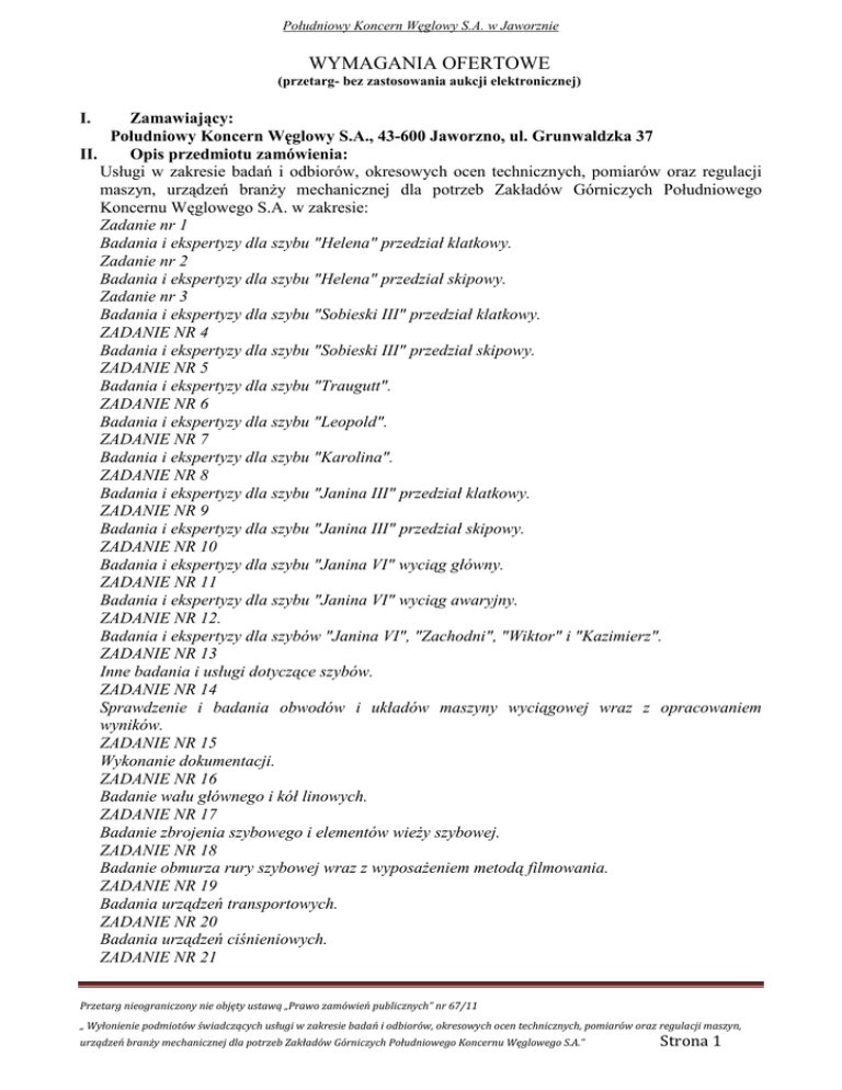 Południowy Koncern Węglowy S.A. w Jaworznie WYMAGANIA OFERTOWE (przetarg- bez zastosowania aukcji elektronicznej) I. Zamawiający: Południowy Koncern Węglowy S.A., 43-600 Jaworzno, ul. Grunwaldzka 37 II. Opis przedmiotu zamówienia: Usługi w zakresie badań i odbiorów, okresowych ocen technicznych, pomiarów oraz regulacji maszyn, urządzeń branŜy mechanicznej dla potrzeb Zakładów Górniczych Południowego Koncernu Węglowego S.A. w zakresie: Zadanie nr 1 Badania i ekspertyzy dla szybu "Helena" przedział klatkowy. Zadanie nr 2 Badania i ekspertyzy dla szybu "Helena" przedział skipowy. Zadanie nr 3 Badania i ekspertyzy dla szybu "Sobieski III" przedział klatkowy. ZADANIE NR 4 Badania i ekspertyzy dla szybu "Sobieski III" przedział skipowy. ZADANIE NR 5 Badania i ekspertyzy dla szybu "Traugutt". ZADANIE NR 6 Badania i ekspertyzy dla szybu "Leopold". ZADANIE NR 7 Badania i ekspertyzy dla szybu "Karolina". ZADANIE NR 8 Badania i ekspertyzy dla szybu "Janina III" przedział klatkowy. ZADANIE NR 9 Badania i ekspertyzy dla szybu "Janina III" przedział skipowy. ZADANIE NR 10 Badania i ekspertyzy dla szybu "Janina VI" wyciąg główny. ZADANIE NR 11 Badania i ekspertyzy dla szybu "Janina VI" wyciąg awaryjny. ZADANIE NR 12. Badania i ekspertyzy dla szybów "Janina VI", "Zachodni", "Wiktor" i "Kazimierz". ZADANIE NR 13 Inne badania i usługi dotyczące szybów. ZADANIE NR 14 Sprawdzenie i badania obwodów i układów maszyny wyciągowej wraz z opracowaniem wyników. ZADANIE NR 15 Wykonanie dokumentacji. ZADANIE NR 16 Badanie wału głównego i kół linowych. ZADANIE NR 17 Badanie zbrojenia szybowego i elementów wieŜy szybowej. ZADANIE NR 18 Badanie obmurza rury szybowej wraz z wyposaŜeniem metodą filmowania. ZADANIE NR 19 Badania urządzeń transportowych. ZADANIE NR 20 Badania urządzeń ciśnieniowych. ZADANIE NR 21 Przetarg nieograniczony nie objęty ustawą „Prawo zamówień publicznych” nr 67/11 „ Wyłonienie podmiotów świadczących usługi w zakresie badań i odbiorów, okresowych ocen technicznych, pomiarów oraz regulacji maszyn, urządzeń branży mechanicznej dla potrzeb Zakładów Górniczych Południowego Koncernu Węglowego S.A.” Strona 1 Południowy Koncern Węglowy S.A. w Jaworznie Badania nieniszczące. ZADANIE NR 22 Badanie lin. ZADANIE NR 23 Badania oddziaływań urządzenia wyciągowego. ZADANIE NR 24 Analiza produktów naftowych, emulsji wodno-olejowych i wody. Szczegółowy zakres rzeczowy przedmiotu zamówienia, w tym wymagania techniczne i organizacyjne, określa załącznik nr 1. III. Opis przygotowania oferty 1. Oferta musi być sporządzona w języku polskim, pismem czytelnym i posiadać datę jej sporządzenia. 2. KaŜdy oferent moŜe złoŜyć w konkretnym przetargu tylko jedną ofertę. 3. Wszystkie zapisane strony oferty oraz wszystkie zapisane strony wymaganych załączników muszą być podpisane przez osoby upowaŜnione do reprezentowania oferenta, z zastrzeŜeniem ppkt 7. 4. W przypadku, gdy dany oferent dołącza do oferty jako załącznik kopię dokumentu, kopia ta winna być poświadczona za zgodność z oryginałem na kaŜdej zapisanej stronie przez osoby upowaŜnione do reprezentowania oferenta. 5. W sytuacji, gdy udzielono pełnomocnictw, oferta winna zawierać oryginały lub kserokopie udzielonych pełnomocnictw. 6. Kilku oferentów moŜe złoŜyć ofertę wspólną; w tym przypadku oferenci ponoszą solidarną odpowiedzialność za niewykonanie lub nienaleŜyte wykonanie przedmiotu Zamówienia. 7. W przypadku złoŜenia oferty wspólnej przez kilku oferentów, oferenci ustanawiają pełnomocnika do reprezentowania ich w postępowaniu. W takim przypadku wszystkie zapisane strony oferty oraz wszystkie zapisane strony wymaganych załączników muszą być podpisane przez tego pełnomocnika jako osobę upowaŜnioną do reprezentowania oferentów w postępowaniu. JeŜeli dany oferent dołącza do oferty jako załącznik kopię dokumentu, wówczas kopia ta winna być poświadczona za zgodność z oryginałem na kaŜdej zapisanej stronie przez osoby upowaŜnione do reprezentowania tego oferenta i jednocześnie winna być podpisana przez pełnomocnika ustanowionego przez działających wspólnie oferentów. 8. Wszystkie korekty i poprawki treści oferty mogą być nanoszone jedynie przez przekreślenie błędnego zapisu i wstawienie obok poprawnego czytelnego zapisu. Wymaga się, aby wszelkie korekty i poprawki były opatrzone datą ich dokonania oraz podpisami osób, które podpisały ofertę. 9. Ofertę naleŜy sporządzić w dwóch odrębnych częściach: technicznej i handlowej i złoŜyć w jednym, nieprzejrzystym, zaklejonym opakowaniu (kopercie), opisanym w sposób określony w wymaganiach ofertowych. 10. KaŜda z części oferty wraz z odpowiednimi dla niej załącznikami ułoŜona w kolejności zgodnie z wzorem odpowiedniego formularza oferty powinna być trwale spięta lub zszyta w sposób uniemoŜliwiający dekompletację zawartości danej części oferty. 11. KaŜda z części oferty musi zawierać spis treści. 12. Wszystkie strony kaŜdej z części oferty, zawierające jakiekolwiek teksty, znaki czy rysunki, muszą być oddzielnie ponumerowane kolejnymi numerami stron. 13. Część techniczna oferty musi zawierać: a) nazwę i siedzibę oferenta; b) datę sporządzenia oferty; c) przedmiot oferty – w przypadku ofert częściowych naleŜy podać numer i nazwę części przedmiotu zamówienia; Przetarg nieograniczony nie objęty ustawą „Prawo zamówień publicznych” nr 67/11 „ Wyłonienie podmiotów świadczących usługi w zakresie badań i odbiorów, okresowych ocen technicznych, pomiarów oraz regulacji maszyn, urządzeń branży mechanicznej dla potrzeb Zakładów Górniczych Południowego Koncernu Węglowego S.A.” Strona 2 Południowy Koncern Węglowy S.A. w Jaworznie d) termin wykonania przedmiotu zamówienia i termin realizacji poszczególnego zlecenia (okres obowiązywania umowy - 12 miesięcy od dnia z
