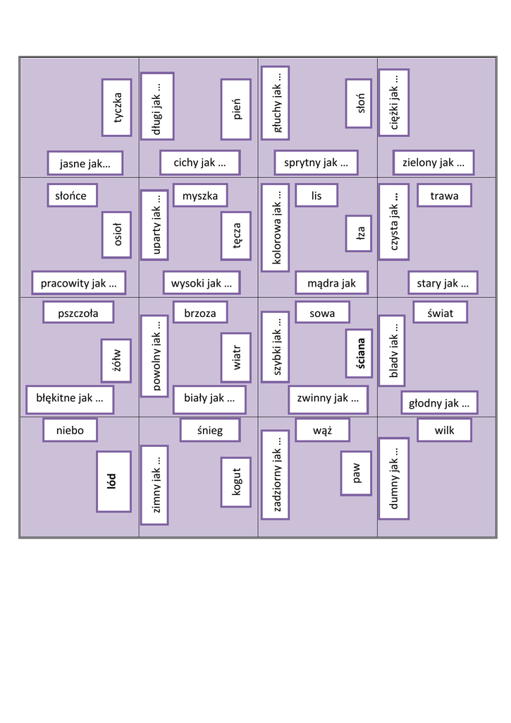niebo śnieg ciężki jak … czysta jak … stary jak … świat zwinny jak … głodny jak … dumny jak … wilk paw zadziorny jak … wąż kogut trawa blady jak … wiatr biały jak … zimny jak … błękitne jak … mądra jak … sowa ściana brzoza szybki jak … pszczoła powolny jak … wysoki jak … żółw słoń lis zielony jak … łza myszka pracowity jak … lód głuchy jak … sprytny jak … kolorowa jak … cichy jak … tęcza uparty jak … osioł słońce pień długi jak … tyczka jasne jak…