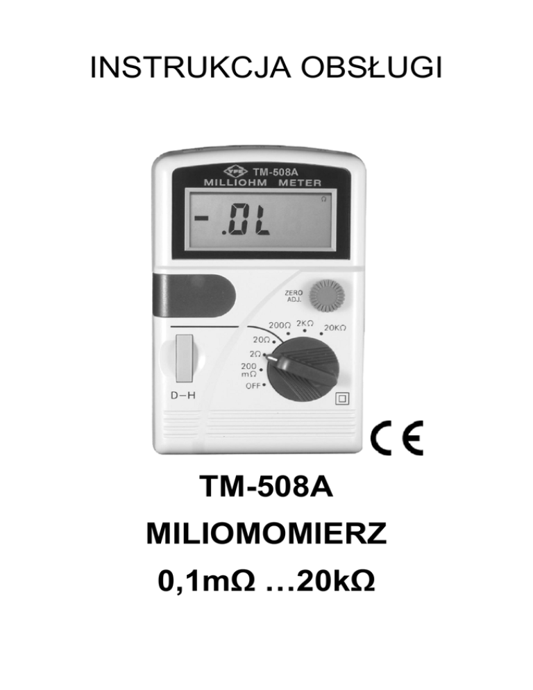 INSTRUKCJA OBSŁUGI TM-508A MILIOMOMIERZ 0,1mΩ …20kΩ Cechy miernika 1. Pomiar bardzo małych rezystancji metodą 4-ro przewodową przy pomocy 2-ch par przewodów pomiarowych z klipsami. 2. Bezpiecznik 0,5A/250V chroniący miernik 3. Zastosowanie w dokładnych pomiarach rezystancji uzwojenia silników, transformatorów, ścieżek obwodów drukowanych 4. Dokładne pomiary rezystancji przewodników, uzwojeń generatorów oraz punktów lutowniczych. 5. Szeroki zakres pomiarowy od 0,1mΩ do 20kΩ w 6 zakresach 6. Funkcja zamrożenia bieżącego odczytu na wyświetlaczu LCD 1. Specyfikacja ogólna Wyświetlacz: 3 ½ cyfry, maks. odczyt 1999 z wyświetlaniem wartości dziesiętnych i jednostek pomiaru Przekroczenie zakresu: wskazanie „OL” Kalibracja zera: pokrętło regulacji zera Wskaźnik zużycia baterii: symbol na wyświetlaczu Szybkość próbkowania: 2,5 razy sekundę Dopuszczalna wysokość pracy: do 2000 m n.p.m. Warunki środowiskowe: do użytku wewnątrz budynków, stopień zanieczyszczenia 2 Temperatura i wilgotność: 5˚C do 40 ˚C, do 85% wilgotności względnej Warunki przechowywania: -10 ˚C do 60 ˚C, do 75% wilgotności względnej Zasilanie: 9V, 6 baterii 1,5V typu LR03/AA Zasilacz: zasilany z sieci 100-240V AC/ 0,3A 50/60 Hz, Napięcie wyjściowe 9V DC (dop. 8~11V DC ) Prąd wyjściowy > 0,5A DC Wymiary i masa: 160x100x52 mm, ok. 500g Akcesoria: zestaw przewodów z klipsami, zasilacz, instrukcja obsługi Bezpiecznik: 0,5A/250V, Ø5x20 mm, szybkozwłoczny 2 2. Opis miernika 1. Gniazda Rx, Lo i Hi 2. Wyświetlacz LCD 3. 4. 5. 6. Wejścia do pomiaru rezystancji Wskazania wartości pomiaru i jednostki Do regulacji zera Wybór zakresu miernika Zamrożenie wyniku pomiarów Do podłączenia zasilacza AC, napięcie wyjściowe 9V DC ( dop. 8 ~11 V DC) Potencjometr kalibracji zera Włącznik zasilania i wyboru funkcji D-H Gniazdo zasilania DC Rys. 1 3 3. Informacje przed wykonywaniem pomiarów Nie wolno podłączać do gniazd wejściowych Lo, Rx, Rx, Hi żadnego napięcia, aby nie uszkodzić obwodów wewnętrznych miernika. 4. Specyfikacja elektryczna Przy (23˚C ± 5 ˚C, 80% wilgotności względnej lub mniejszej) Dokładność: ± (% ww+ cyfry) ww – wartość wskazywana cyfry – wartość najmniej znaczących cyfr na danym zakresie pomiarowym Zakres Rozdzielczość Prąd pomiarowy 200mΩ 0,1mΩ 100mA 2Ω 1mΩ 10mA 10mΩ 10mA 200Ω 0,1Ω 1mA 2kΩ 1Ω 1mA 20kΩ 10Ω 100μA 20Ω Dokładność ± (0,3%+4cyfry) Napięcie jałowe ok. 4,8V DC 5. Pomiary metodą 4-ro przewodową przy pomocy 2-ch par przewodów pomiarowych z klipsami. Aby zagwarantować wyższą dokładność pomiarów omomierza cyfrowego , dokładny pomiar rezystancji w szerokim zakresie oraz aby wyeliminować zakłócenia różnego pochodzenia, szczególnie efekt rezystancji przewodów pomiarowych, powinna być zachowana poniższa procedura przeprowadzania pomiarów: 4 Rys. 2 1. Odnosząc się do tabeli powyżej, prąd pomiarowy IS przepływa w wielkości zależnej od zakresu pomiarowego (od gniazda Hi do gniazda Lo).poprzez rezystancję o nieznanej wartości RX. 2. Napięcie Vx jest jednocześnie mierzone na gniazdach wejściowych Rx1 i Rx2 Vx Rx * IS , stąd Rx Vx IS 3. Nieznana wartość rezystancji może zostać określona na podstawie pomiaru napięcia Vx. 4. Tak uzyskany wynik pomiaru rezystancji Rx zawiera jednak w sobie sumę rezystancji przewodów pomiarowych, podłączonych do rezystora badanego (od Rx do Rx1 oraz od Rx do Rx2). 6.Precyzyjny pomiar rezystancji 1. Podłączyć jeden czerwony przewód pomiarowy do gniazda Hi miernika, a drugi czerwony przewód do sąsiedniego gniazda Rx. Jeden czarny przewód pomiarowy należy podłączyć do gniazda Lo miernika, a drugi czarny przewód – do sąsiedniego gniazda Rx. 2. Obrotowy przełącznik funkcji należy ustawić w pozycji 200mΩ. 3. Zewrzeć klipsy przewodów pomiarowych i w razie potrzeby za pomocą pokrętła regulacji zera (3) wyregulować odczyt tak, aby na wyświetlaczu wskazywał wartość ”000”. 5 4. Przy każdej zmianie zakresu pokrętłem obrotowym należy ponownie dokonać regulacji zera. 5. Aby zmierzyć wartość nieznanego rezystora RX należy dokonać podłączenia tak, jak to przedstawiono na rys.3 Rys. 3 Pomiar rezystancji ścieżki na płytce drukowanej przy użyciu dwupunktowej metody pomiaru (rys. 4) Rys. 4 6. Zmierzona wartość zostanie pokazana na wyświetlaczu LCD. 6 7. Wymiana baterii Miernik jest zasilany z 6 baterii 1,5V (LR06/AA). Aby wymienić baterie należy: UWAGA: Wymiana baterii powinna mieć miejsce natychmiast, gdy na wyświetlaczu pojawi się symbol . 1. Przełącznik obrotowy należy ustawić w pozycji OFF. 2. Używając wkrętaka należy odkręcić wkręty pokrywy baterii oraz zdjąć pokrywę. 3. Wyjąć zużyte baterie i w ich miejsce włożyć komplet nowych baterii, zwracając uwagę na odpowiednią polaryzację. 4. Założyć pokrywę baterii i skręcić obudowę za pomocą wkrętów. 8. Wymiana bezpiecznika W celu ochrony obwodów elektrycznych miernika podczas wymiany bezpiecznika należy zastąpić go nowym o parametrach 0,5A/250V, Ø5x20mm, bezzwłocznym, o prądzie zwarciowym 1500A. 1. Przełącznik obrotowy należy ustawić w pozycji OFF. Odkręcić dolną pokrywę miernika przy użyciu wkrętaka. 2. Wyciągnąć przepalony bezpiecznik i zastąpić go nowym. 3. Zamknąć dolną pokrywę miernika i skręcić ją wkrętakiem. 9. Konserwacja i czyszczenie 1. Wszystkie czynności konserwacyjne, które nie zostały wymienione w tej instrukcji powinny być wykonywane jedynie przez odpowiednio przeszkolony personel. 2. Miernik ten jest precyzyjnym urządzeniem , więc podczas używania czy przechowywania nie należy przekraczać wartości pomiarowych podanych w tej instrukcji, aby uniknąć uszkodzenia miernika lub obrażenia w trakcie jego używania. 3. Do czyszczenia nie używać silnych i agresywnych detergentów , wody lub mokrego materiału. Urządzenie może być czyszczone jedynie suchą ściereczk