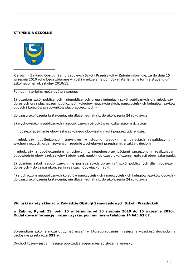 STYPENDIA SZKOLNE Kierownik Zakładu Obsługi Samorządowych Szkół i Przedszkoli w Żabnie informuje, że do dnia 15 września 2010 roku będą zbierane wnioski o udzielenie pomocy materialnej w formie stypendium szkolnego na rok szkolny 2010/11. Pomoc materialna może być przyznana: 1) uczniom szkół publicznych i niepublicznych o uprawnieniach szkół publicznych dla młodzieży i dorosłych oraz słuchaczom publicznych kolegiów nauczycielskich, nauczycielskich kolegiów języków obcych i kolegiów pracowników służb społecznych – do czasu ukończenia kształcenia, nie dłużej jednak niż do ukończenia 24 roku życia. 2) wychowankom publicznych i niepublicznych ośrodków umożliwiającym dzieciom i młodzieży spełnianie obowiązku szkolnego obowiązku nauki poprzez udział dzieci i młodzieży upośledzonych umysłowo w stopniu głębokim w zajęciach rewalidacyjno wychowawczych, organizowanych zgodnie z odrębnymi przepisami, a także dzieciom – i młodzieży z upośledzeniem umysłowym z niepełnosprawnościami sprzężonymi realizującym odpowiednio obowiązek szkolny i obowiązek nauki – do czasu ukończenia realizacji obowiązku nauki, 3) uczniom szkół niepublicznych nie posiadających uprawnień szkół publicznych dla młodzieży i dorosłych – do czasu ukończenia realizacji obowiązku nauki, 4) słuchaczom niepublicznych kolegiów nauczycielskich i nauczycielskich kolegiów języków obcych – do czasu ukończenia kształcenia, nie dłużej jednak niż do ukończenia 24 roku życia. Wnioski należy składać w Zakładzie Obsługi Samorządowych Szkół i Przedszkoli w Żabnie, Rynek 29, pok. 15 w terminie od 30 sierpnia 2010 do 15 września 2010r. Dodatkowe informację można uzyskać pod numerem telefonu 14 645 63 87. Stypendium szkolne może otrzymać uczeń, w którego rodzinie miesięczna wysokość dochodu na osobę nie przekracza 351 zł. Dochód liczony jest z miesiąca poprzedzającego miesiąc złożenia wniosku. 1/2 Do wniosku należy dołączyć zaświadczenia potwierdzające wysokość dochodu: 1. Zaświadczenie o dochodach z zakładu pracy ( dochód netto) 2. Zaświadczenie z OPS o wysokości pobieranych świadczeń ( zasiłek rodzinny wraz z dodatkami, zasiłek pielęgnacyjny) 3. Odcinek renty lub emerytury, 4. Zaświadczenie z Urzędu Pracy 5. Zaświadczenie z Urzędu Skarbowego prowadzących własną działalność gospodarczą, 6. Nakaz płatniczy lub zaświadczenia potwierdzające posiadanie lub nie posiadanie gospodarstwa rolnego. Dochód z 1 hektara przeliczeniowego wynosi 207 zł. WNIOSEK cz.1 WNIOSEK cz.2 2/2 Powered by TCPDF (www.tcpdf.org)