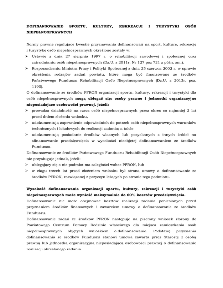 DOFINANSOWANIE SPORTU, KULTURY, REKREACJI I TURYSTYKI OSÓB NIEPEŁNOSPRAWNYCH Normy prawne regulujące kwestie przyznawania dofinansowań na sport, kulturę, rekreację i turystykę osób niepełnosprawnych określone zostały w: Ustawie z dnia 27 sierpnia 1997 r. o rehabilitacji zawodowej i społecznej oraz zatrudnianiu osób niepełnosprawnych (Dz.U. z 2011r. Nr 127 poz 721 z późn. zm.). Rozporządzeniu Ministra Pracy i Polityki Społecznej z dnia 25 czerwca 2002 r. w sprawie określenia rodzajów zadań powiatu, które mogą być finansowane ze środków Państwowego Funduszu Rehabilitacji Osób Niepełnosprawnych (Dz.U. z 2013r. poz. 1190). O dofinansowanie ze środków PFRON organizacji sportu, kultury, rekreacji i turystyki dla osób niepełnosprawnych mogą ubiegać się: osoby prawne i jednostki organizacyjne nieposiadające osobowości prawnej, jeżeli: prowadzą działalność na rzecz osób niepełnosprawnych przez okres co najmniej 2 lat przed dniem złożenia wniosku, udokumentują zapewnienie odpowiednich do potrzeb osób niepełnosprawnych warunków technicznych i lokalowych do realizacji zadania; a także udokumentują posiadanie środków własnych lub pozyskanych z innych źródeł na sfinansowanie przedsięwzięcia w wysokości nieobjętej dofinansowaniem ze środków Funduszu. Dofinansowanie ze środków Państwowego Funduszu Rehabilitacji Osób Niepełnosprawnych nie przysługuje jednak, jeżeli: ubiegający się o nie podmiot ma zaległości wobec PFRON, lub w ciągu trzech lat przed złożeniem wniosku był stroną umowy o dofinansowanie ze środków PFRON, rozwiązanej z przyczyn leżących po stronie tego podmiotu. Wysokość dofinansowania organizacji sportu, kultury, rekreacji i turystyki osób niepełnosprawnych może wynieść maksymalnie do 60% kosztów przedsięwzięcia. Dofinansowanie nie może obejmować kosztów realizacji zadania poniesionych przed przyznaniem środków finansowych i zawarciem umowy o dofinansowanie ze środków Funduszu. Dofinansowanie zadań ze środków PFRON następuje na pisemny wniosek złożony do Powiatowego Centrum Pomocy Rodzinie właściwego dla miejsca zamieszkania osób niepełnosprawnych objętych wnioskiem o dofinansowanie. Podstawę przyznania dofinansowania ze środków Funduszu stanowi umowa zawarta przez Starostę z osobą prawną lub jednostką organizacyjną nieposiadającą osobowości prawnej o dofinansowanie realizacji określonego zadania. Wnioski o dofinansowanie ze środków PFRON sportu, kultury, rekreacji i turystyki osób niepełnosprawnych należy składać do 30 listopada roku poprzedzającego realizację tego zadania.