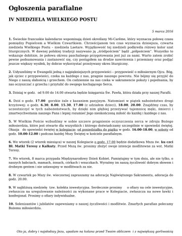 Ogłoszenia parafialne IV NIEDZIELA WIELKIEGO POSTU 5 marca 2016 1. Świeckie francuskie kalendarze wspominają dzień określany Mi-Carême, który wyznacza połowę czasu pomiędzy Popielcem a Wielkim Czwartkiem. Chrześcijanom ten czas wyznacza dzisiejsza, czwarta niedziela Wielkiego Postu – niedziela Laetare. Wyjątkowość tej niedzieli podkreśla różowy kolor szat liturgicznych. W dawnej polskiej tradycji nazywano ją „śródpościem” bądź „półpościem”. Wszystko to wskazuje dobitnie, że połowa okresu paschalnego przygotowania jest już za nami. Warto zatem zrobić pewne podsumowania i zastanowić się, czy postąpiłem na drodze nawrócenia i przemiany oraz podjąć jeszcze większy wysiłek, by dobrze wykorzystać przeżywany okres liturgiczny. 2. Usłyszeliśmy w Ewangelii jedną z najpiękniejszych przypowieści – przypowieść o miłosiernym Ojcu. Bóg, jak ojciec z przypowieści, czeka na każdego z nas, pragnie naszego powrotu. Nie bójmy się przyjść do Niego z naszą słabością i grzechem. On codziennie na nas czeka w sakramencie pokuty i pojednania, by nas oczyszczać z grzechu i przytulić do swojego kochającego Serca. 3. Dzisiaj w godz. od 9.00 do 14.00 otwarta będzie księgarnia Św. Pawła, która działa przy naszej Parafii. 4. Dziś o godz. 17.00 gorzkie żale z kazaniem pasyjnym. Natomiast w piątek nabożeństwo drogi krzyżowej: o godz. 6.30, 8.00, 15.30, 17.00 (z udziałem dzieci), 18.00, 20.00. Znajdźmy czas, by uczestniczyć w tych nabożeństwach, by dzięki nim głębiej przeżywać tajemnicę męki, śmierci i zmartwychwstania naszego Pana i lepiej rozumieć Jego nieskończoną miłość do każdej i każdego z nas. 5. W Wielkim Poście wzbudźmy w sobie szczere pragnienie oczyszczenia serca w zdroju Bożego miłosierdzia, które jest otwarte dla wszystkich i którego doświadczamy szczególnie w spowiedzi świętej. Okazja do spowiedzi świętej w kolegiacie: od poniedziałku do piątku w godz. 16.00-18.00, w soboty od godz. 10.00-12.00 i podczas każdej Mszy Świętej w kościele parafialnym. 6. We wtorek (2 wtorek miesiąca) w naszej Kolegiacie o godz. 17.00 będzie dodatkowa Msza św. ku czci Bł. Matki Teresy z Kalkuty. Przed Mszą św. prosimy złożyć swoje intencje modlitewne za wst. Matki Teresy. 7. We wtorek, 8 marca przypada Międzynarodowy Dzień Kobiet. Pamiętajmy w tym dniu, ale nie tylko, o naszych babciach, mamach, żonach, córkach i wnuczkach. Wyraźmy im naszą życzliwość dobrym słowem i drobnym gestem i nie ustawajmy w modlitwach za nie. 8. W czwartek po Mszy św. wieczornej zapraszamy na adorację Najświętszego Sakramentu, adoracja do godz. 20.00. 9. W najbliższą niedzielę tzw. kolekta inwestycyjna. Serdecznie prosimy o ofiary na cele inwestycyjne, zwłaszcza na uregulowanie należności za wykonane prace w Kolegiacie, zwłaszcza na nowe ławki i konfesjonał. Prosimy o ofiary indywidualne. 10. Solenizantów i jubilatów zapewniamy o naszej życzliwości i modlitwie. Zmarłych parafian polecamy Bożemu miłosierdziu. Oto ja, dobry i najsłodszy Jezu, upadam na kolana przed Twoim obliczem i z największą gorliwością ducha proszę Cię i błagam, abyś wszczepił w moje serce najżywsze uczucia wiary, nadziei i miłości oraz prawdziwą skruchę za moje grzechy i silną wolę poprawy. Oto z sercem przepełnionym wielkim uczuciem i z boleścią oglądam w duchu Twoje pięć ran i myślą się w nich zatapiam, pamiętając o tym, dobry Jezu, co już prorok Dawid włożył w Twoje usta: „Przebodli ręce moje i nogi, policzyli wszystkie kości moje” (Ps 22,17).