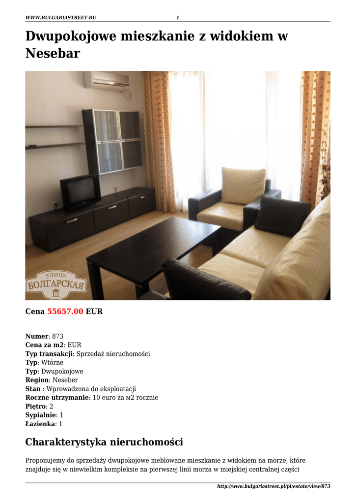 WWW.BULGARIASTREET.RU 1 Dwupokojowe mieszkanie z widokiem w Nesebar Cena 55657.00 EUR Numer: 873 Cena za m2: EUR Typ transakcji: Sprzedaż nieruchomości Typ: Wtórne Typ: Dwupokojowe Region: Neseber Stan : Wprowadzona do eksploatacji Roczne utrzymanie: 10 euro za м2 rocznie Piętro: 2 Sypialnie: 1 Łazienka: 1 Charakterystyka nieruchomości Proponujemy do sprzedaży dwupokojowe meblowane mieszkanie z widokiem na morze, które znajduje się w niewielkim kompleksie na pierwszej linii morza w miejskiej centralnej części http://www.bulgariastreet.pl/pl/estate/view/873 WWW.BULGARIASTREET.RU 2 bułgarskiego miasta Nesebar. Zdrojowa nieruchomość, która może wykorzystywać się i w jakości mieszkania dla stałego pobytu. Luźne mieszkanie z jedną sypialnią jest rozmieszczone na drugiej kondygnacji kompleksu i włącza przedpokój, pokój gościnny z aneksem kuchennym, sypialnię, lazienkę, łączącą się z sanitarnym węzłem i taras. Mieszkanie w całości jest meblowane i wyposażone we współczesne domowe urządzenie. Kompleks Miraż, jeden ze znanych pięciogwiazdkowych kompleksów, zbudowanych na terytorium miasta Nesebar. W parze minutach chodu od kompleksu znajduje się centralna piesza aleja miasta, merostwo, szkoła, supermarket, apteki... Główne akcenty: ● ● ● ● ● Doskonała cena; Pierwsza linia; Widok na morze; Centralna część miasta; Rozwinięta infrastruktura; Infrastruktura ● ● ● ● ● ● ● ● ● ● ● ● ● ● ● ● ● ● ● ● ● ● Miejsca parkingowe Placyk dla dzieci Klimatyzacja Winda Telefon Recepcja Sklep Centrum SPA Restauracja Silownia Bar Basen odkryty Ochrona Internet Telewizja kablowa Gabinet medyczny Elektrczność Woda Okna PVC Meble Przypilnowane terytorium Z widok na morze Informacje o regionie Neseber - perła bułgarskiego nadbrzeża! To jedno z najdawniejszych miast Europy, które corocznie jak magnes przyciąga tysiące turystów z całego świata. Miasto dzieli się na dwie części: nową i starą. Miasto jest rozmieszczone do 37 km od Burgasa, 3 km od Słonecznego Brzegu http://www.bulgariastreet.pl/pl/estate/view/873 WWW.BULGARIASTREET.RU 3 Stary Neseber Dawna część miasta Neseber, co jest prawdziwym muzeum prosto nieba, jest rozmieszczona na skalistym półwyspie długością 850 m i szerokością 300 m. Miasto zjednoczone z lądem wąskim międzymorzem, długość którego składa zaledwie 400 m. Arcydzieło architektury - dawny Neseber jest włączony do spisu światowej kulturalnej spuścizny i z 1983 roku znajduje się pod egidą. Niepowtarzalną atmosferę stwarzają cerkwie, co brukuje się brukowcem przytulne uliczki, na których są rozmieszczone oszałamiające prastare domy z wykuszami. Wszystkiego w mieście 40 cerkwi, każda z których przedstawia prawdziwe dzieło sztuki. Nowy Neseber Nowa część Neseber jest współczesnym miastem, w którym stale mieszka miejscowa ludność. W mieście jest stworzona pierwszorzędna wewnętrzna infrastruktura, co włącza dziecięce przedszkolne instytucje, szkoły, medyczne centra, apteki, sklepy, restauracje, bistro, nocne kluby, kawiarnie, oddziały banków, poczta, policja i inna. Miasto wyróżnia dużą ilość terytoriów, co zadrzewia, ze strefami odpoczynku. Obok znajduje się аква-парк, do którego chodzi bezpłatny autobus. Klimat Klimat w mieście Несебр jest umiarkowany, przechodzący do śródziemnomorskiego. Latem temperatura powietrza osiąga + 28-30 stopniów Celsjusza, a woda nagrzewa się do notatki równą 26 stopniów Celsjusza. Plaże Plaże kurortu Neseber nie tylko czyste, ale i mają wygodny pochyły zachód w wodę, że tak ważnie dla dzieci i ludzi, co nie powinny pływać. Na plażach dyżurują ratownicy, ustalone parasole i szezlongi. Tu że opodal pracują kawiarnie, proponują napoje orzeźwiające i lekkie zakąski. http://www.bulgariastreet.pl/pl/estate/view/873 WWW.BULGARIASTREET.RU 4 http://www.bulgariastreet.pl/pl/estate/view/873 WWW.BULGARIASTREET.RU 5 http://www.bulgariastreet.pl/pl/estate/view/873 WWW.BULGARIASTREET.RU 6 Kontakty Agencja "Ulica Bułgarska" (Bulgaria Street Ltd) Bułgaria m. Burgas, 8000 ul. Mitropolit Simeon 3 Strona: www.bulgariastreet.ru Tel: + 359 894 51 50 51 Tel: + 48 223 906 334 Mail: [email protected] Mail: [email protected] Skype: bulstreet http://www.bulgariastreet.pl/pl/estate/view/873