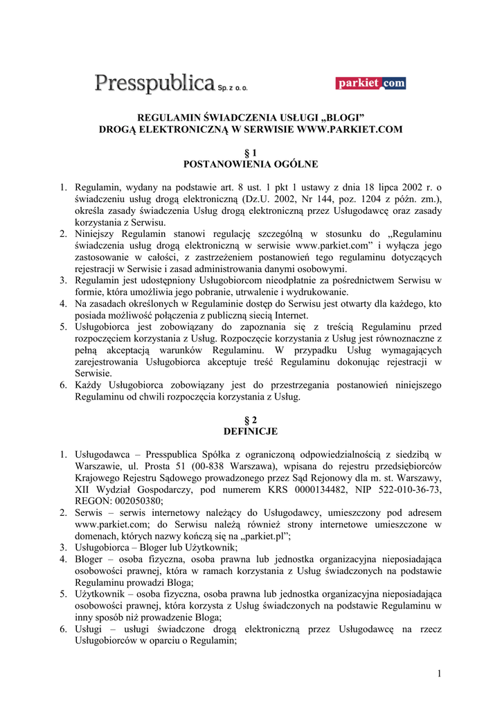 REGULAMIN ŚWIADCZENIA USŁUGI „BLOGI” DROGĄ ELEKTRONICZNĄ W SERWISIE WWW.PARKIET.COM §1 POSTANOWIENIA OGÓLNE 1. Regulamin, wydany na podstawie art. 8 ust. 1 pkt 1 ustawy z dnia 18 lipca 2002 r. o świadczeniu usług drogą elektroniczną (Dz.U. 2002, Nr 144, poz. 1204 z późn. zm.), określa zasady świadczenia Usług drogą elektroniczną przez Usługodawcę oraz zasady korzystania z Serwisu. 2. Niniejszy Regulamin stanowi regulację szczególną w stosunku do „Regulaminu świadczenia usług drogą elektroniczną w serwisie www.parkiet.com” i wyłącza jego zastosowanie w całości, z zastrzeżeniem postanowień tego regulaminu dotyczących rejestracji w Serwisie i zasad administrowania danymi osobowymi. 3. Regulamin jest udostępniony Usługobiorcom nieodpłatnie za pośrednictwem Serwisu w formie, która umożliwia jego pobranie, utrwalenie i wydrukowanie. 4. Na zasadach określonych w Regulaminie dostęp do Serwisu jest otwarty dla każdego, kto posiada możliwość połączenia z publiczną siecią Internet. 5. Usługobiorca jest zobowiązany do zapoznania się z treścią Regulaminu przed rozpoczęciem korzystania z Usług. Rozpoczęcie korzystania z Usług jest równoznaczne z pełną akceptacją warunków Regulaminu. W przypadku Usług wymagających zarejestrowania Usługobiorca akceptuje treść Regulaminu dokonując rejestracji w Serwisie. 6. Każdy Usługobiorca zobowiązany jest do przestrzegania postanowień niniejszego Regulaminu od chwili rozpoczęcia korzystania z Usług. §2 DEFINICJE 1. Usługodawca – Presspublica Spółka z ograniczoną odpowiedzialnością z siedzibą w Warszawie, ul. Prosta 51 (00-838 Warszawa), wpisana do rejestru przedsiębiorców Krajowego Rejestru Sądowego prowadzonego przez Sąd Rejonowy dla m. st. Warszawy, XII Wydział Gospodarczy, pod numerem KRS 0000134482, NIP 522-010-36-73, REGON: 002050380; 2. Serwis – serwis internetowy należący do Usługodawcy, umieszczony pod adresem www.parkiet.com; do Serwisu należą również strony internetowe umieszczone w domenach, których nazwy kończą się na „parkiet.pl”; 3. Usługobiorca – Bloger lub Użytkownik; 4. Bloger – osoba fizyczna, osoba prawna lub jednostka organizacyjna nieposiadająca osobowości prawnej, która w ramach korzystania z Usług świadczonych na podstawie Regulaminu prowadzi Bloga; 5. Użytkownik – osoba fizyczna, osoba prawna lub jednostka organizacyjna nieposiadająca osobowości prawnej, która korzysta z Usług świadczonych na podstawie Regulaminu w inny sposób niż prowadzenie Bloga; 6. Usługi – usługi świadczone drogą elektroniczną przez Usługodawcę na rzecz Usługobiorców w oparciu o Regulamin; 1 7. Regulamin – niniejszy Regulamin; 8. Blog – część Serwisu, w której Bloger umieszcza datowane wpisy; 9. Blog Zwykły – Blog, prowadzony przez Blogera, który nie jest upoważniony do umieszczania reklam i materiałów promocyjnych na Blogu; 10. Blog Komercyjny – Blog, prowadzony przez Blogera, który jest upoważniony przez Usługodawcę do umieszczania reklam i materiałów promocyjnych; 11. Komentarz – wszelkie treści publikowane na stronach Blogów przez Użytkowników. §3 PRZEDMIOT UMÓW (ZAKRES USŁUG) 1. Przedmiotem umowy zawieranej przez Usługodawcę z Usługobiorcą jest: 1) udostępnianie Blogerom zasobów systemu teleinformatycznego w celu przechowywania treści składających się na Bloga (zwanych dalej „Wpisami”) i wyświetlanie Wpisów w Serwisie; 2) udostępnianie Użytkownikom zasobów systemu teleinformatycznego w celu przechowywania treści składających się na Komentarze i ich wyświetlanie w Serwisie; 3) udostępnianie Użytkownikom możliwości bezpłatnego przeglądania i odczytywania treści Wpisów i Komentarzy. 2. Przedmiotem umowy, o której mowa w ust. 1 pkt 1) lub 2) powyżej jest również licencja udzielona Usługodawcy przez Usługobiorców na korzystanie z majątkowych praw autorskich do Wpisów lub Komentarzy. 3. Wyświetlanie Komentarzy będzie trwało nie dłużej niż wyświetlanie Wpisu, którego Komentarz dotyczy. 4. Oferta świadczenia Usług za pośrednictwem Serwisu jest ważna do czasu zawieszenia lub zaprzestania ich świadczenia przez Usługodawcę. Usługodawca uprawniony jest do zawieszenia lub zaprzestania świadczenia Usług bez uprzedniego zawiadamiania Usługobiorców. §4 ZAWARCIE UMOWY 1. W przypadku Usług niewymagających zarejestrowania się w Serwisie zawarcie umowy z Usługodawcą następuje w momencie dokonania przez Usługobiorcę jakiejkolwiek czynności w Serwisie. 2. Zawarcie umowy o świadczenie Usługi zamieszczania Wpisów i Komentarzy w Serwisie wymaga zarejestrowania się w Serwisie. Zawarcie umowy o świadczenie tych Usług następuje w momencie wysłania Wpisu lub Komentarza do Usługodawcy w celu umieszczenia go w Serwisie. 3. W przypadku Usługi polegającej na prowadzeniu Bloga Komercyjnego konieczne jest zawarcie między Usługodawcą a Blogerem odrębnej umowy w formie pisemnej. §5 WYMAGANIA TECHNICZNE 1. Usługi świadczone są Usługobiorcom, którzy spełniają następujące wymagania techniczne: 1) dysponują urządzeniem mającym dostęp do sieci Internet; 2) przeglądarką Mozilla Firefox wersja 3 lub wyższą, albo oprogramowaniem o podobnych parametrach. 2 2. Korzystanie z innych przeglądarek internetowych niż Mozilla Firefox wersja 3 lub wyższej nie gwarantuje poprawnego działania wszystkich funkcji Serwisu. 3. Korzystanie ze wszystkich aplikacji Serwisu może być uzależnione od instalacji oprogramowania typu Java, Java Script lub Flash oraz akceptacji cookies. §6 PRAWA I OBOWIĄZKI USŁUGODAWCY 1. Usługodawca zobowiązuje się do świadczenia Usług drogą elektroniczną. 2. Usługodawca dołoży starań, żeby Usługi świadczyć w sposób ciągły. Usługodawca zastrzega, że w świadczeniu Usług mogą wystąpić przerwy w celu aktualizacji danych, naprawienia błędów i dokonania innych prac konserwacyjnych. Usługodawc