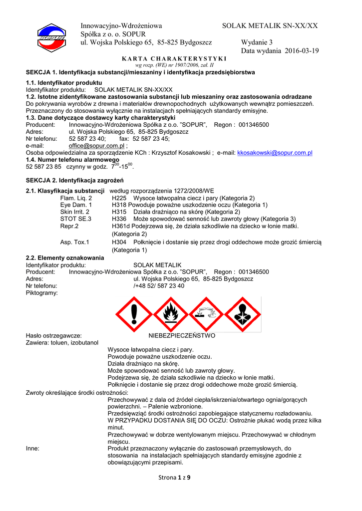 Innowacyjno-Wdrożeniowa Spółka z o. o. SOPUR ul. Wojska Polskiego 65, 85-825 Bydgoszcz SOLAK METALIK SN-XX/XX Wydanie 3 Data wydania 2016-03-19 KARTA CHARAKTERYSTYK I wg rozp. (WE) nr 1907/2006, zał. II SEKCJA 1. Identyfikacja substancji/mieszaniny i identyfikacja przedsiębiorstwa 1.1. Identyfikator produktu Identyfikator produktu: SOLAK METALIK SN-XX/XX 1.2. Istotne zidentyfikowane zastosowania substancji lub mieszaniny oraz zastosowania odradzane Do pokrywania wyrobów z drewna i materiałów drewnopochodnych użytkowanych wewnątrz pomieszczeń. Przeznaczony do stosowania wyłącznie na instalacjach spełniających standardy emisyjne. 1.3. Dane dotyczące dostawcy karty charakterystyki Producent: Innowacyjno-Wdrożeniowa Spółka z o.o. ”SOPUR”, Regon : 001346500 Adres: ul. Wojska Polskiego 65, 85-825 Bydgoszcz Nr telefonu: 52 587 23 40; fax: 52 587 23 45; e-mail: [email protected] ; Osoba odpowiedzialna za sporządzenie KCh : Krzysztof Kosakowski ; e-mail: [email protected] 1.4. Numer telefonu alarmowego 00 00 52 587 23 85 czynny w godz. 7 -15 . SEKCJA 2. Identyfikacja zagrożeń 2.1. Klasyfikacja substancji według rozporządzenia 1272/2008/WE Flam. Liq. 2 H225 Wysoce łatwopalna ciecz i pary (Kategoria 2) Eye Dam. 1 H318 Powoduje poważne uszkodzenie oczu (Kategoria 1) Skin Irrit. 2 H315 Działa drażniąco na skórę (Kategoria 2) STOT SE.3 H336 Może spowodować senność lub zawroty głowy (Kategoria 3) Repr.2 H361d Podejrzewa się, że działa szkodliwie na dziecko w łonie matki. (Kategoria 2) Asp. Tox.1 H304 Połknięcie i dostanie się przez drogi oddechowe może grozić śmiercią (Kategoria 1) 2.2. Elementy oznakowania Identyfikator produktu: SOLAK METALIK Producent: Innowacyjno-Wdrożeniowa Spółka z o.o. ”SOPUR”, Regon : 001346500 Adres: ul. Wojska Polskiego 65, 85-825 Bydgoszcz Nr telefonu: /+48 52/ 587 23 40 Piktogramy: Hasło ostrzegawcze: Zawiera: toluen, izobutanol NIEBEZPIECZEŃSTWO Wysoce łatwopalna ciecz i pary. Powoduje poważne uszkodzenie oczu. Działa drażniąco na skórę. Może spowodować senność lub zawroty głowy. Podejrzewa się, że działa szkodliwie na dziecko w łonie matki. Połknięcie i dostanie się przez drogi oddechowe może grozić śmiercią. Zwroty określające środki ostrożności: Przechowywać z dala od źródeł ciepła/iskrzenia/otwartego ognia/gorących powierzchni. – Palenie wzbronione. Przedsięwziąć środki ostrożności zapobiegające statycznemu rozładowaniu. W PRZYPADKU DOSTANIA SIĘ DO OCZU: Ostrożnie płukać wodą przez kilka minut. Przechowywać w dobrze wentylowanym miejscu. Przechowywać w chłodnym miejscu. Inne: Produkt przeznaczony wyłącznie do zastosowań przemysłowych, do stosowania na instalacjach spełniających standardy emisyjne zgodnie z obowiązującymi przepisami. Strona 1 z 9 Innowacyjno-Wdrożeniowa Spółka z o. o. SOPUR ul. Wojska Polskiego 65, 85-825 Bydgoszcz SOLAK METALIK SN-XX/XX Wydanie 3 Data wydania 2016-03-19 KARTA CHARAKTERYSTYK I wg rozp. (WE) nr 1907/2006, zał. II Powtarzające się narażenie może powodować wysuszanie lub pękanie skóry. SEKCJA 3: Skład/informacja o składnikach 3.1. Substancje Nie dotyczy - produkt jest mieszaniną. 3.2. Mieszaniny Nazwa chemiczna Zawartość % octan butylu do 45 aceton do 21 67-64-1 200-662-2 01-211947133049-xxxx 606-001-00-8 izobutanol do 12 78-83-1 201-148-0 01-211948460923-xxxx 603-108-00-1 cellulose nitrate do 10 proszek aluminiowy do 10 9004-70-0 7429-90-5 231-072-3 nie wymaga rejestracji 01-211952924345-xxxx Numer CAS Numer rejestracji Numer WE REACH 123-86-4 01-2119485493204-658-1 29-xxxx Numer indeksowy 607-025-00-1 Klasyfikacja substancji Flam. Liq. 3 H226 STOT SE 3 H336 Flam. Liq. 2 H225 Eye Irrit. 2 H319 STOT SE 3 H336 Flam. Liq. 3 H226 STOT SE 3 H335 Skin Irrit. 2 H315 Eye Dam. 1 H318 STOT SE 3 H336 603-037-00-6 Expl. 1,1 H201uwaga T - Flam. Sol. 1 H228 toluen do 9,9 108-88-3 203-625-9 01-211947131051-xxxx 601-021-00-3- propan-2-ol do 5 67-63-0 200-661-7 01-211945755825-xxxx 603-117-00-0 benzyna lakiernicza odaromatyzowana do 5 919-857-5 01-211946325833-xxxx - Flam. Liq. 2 H225 Repr. 2 H361d Asp. Tox. 1 H304 STOT RE 2 H373 Skin Irrit. 2 H315 STOT SE 3 H336 Flam. Liq. 2 H225 Eye Irrit. 2 H319 STOT SE 3 H336 Flam. Liq. 3 H226; Asp. Tox. 1 H304; STOT SE 3 H336 *Pełen tekst zwrotów H w sekcji 16. SEKCJA 4: Środki pierwszej pomocy 4.1. Opis środków pierwszej pomocy Wskazówki ogólne: W przypadku wystąpienia objawów takich jak: utrata przytomności, wymioty wezwać natychmiast lekarza lub odwieźć poszkodowanego do szpitala, pokazać etykietę lub opakowanie. Nie podawać nic doustnie osobie nieprzytomnej. Wdychanie: Wyprowadzić poszkodowaną osobę na wolne powietrze, zadbać o utrzymanie ciepłoty ciała. Jeżeli oddychanie jest nieregularne lub nastąpi utrata przytomności zastosować sztuczne oddychanie. Nie podawać nic doustnie. Jeżeli osoba jest nieprzytomna należy położyć ją w odpowiedniej pozycji i natychmiast udzielić pomocy lekarskiej. Kontakt z oczami: Przemywać oczy przez 15 minut obficie czystą, chłodną wodą, kierując strumień wody do góry w kierunku powiek. Usunąć szkła kontaktowe o ile są i można je łatwo usunąć. Udzielić pomocy lekarskiej. Kontakt ze skórą: Zdjąć zanieczyszczone ubranie. Umyć dokładnie skórę wodą z mydłem lub odpowiednim środkiem do mycia. Nie używać rozpuszczalników ani rozcieńczalników. Strona 2 z 9 Innowacyjno-Wdrożeniowa Spółka z o. o. SOPUR ul. Wojska Polskiego 65, 85-825 Bydgoszcz SOLAK METALIK SN-XX/XX Wydanie 3 Data wydania 2016-03-19 KARTA CHARAKTERYSTYK I wg rozp. (WE) nr 1907/2006, zał. II Spożycie: W przypadku spożycia zawiadomić natychmiast lekarza. Zapewnić odpoczynek. Nie powodować wymiotów. 4.2. Najważniejsze ostre i opóźnione objawy oraz skutki narażenia Kontakt produktu ze skórą może powodować jej podrażnienie i wysuszenie, objawy nie muszą wystąpić natychmiast po kontakcie z produktem. 4.3. Wskaza