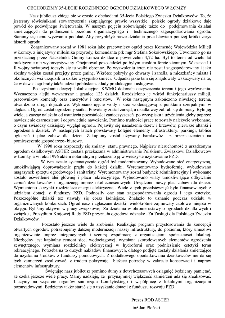 OBCHODZIMY 35-LECIE RODZINNEGO OGRODU DZIAŁKOWEGO W ŁOMŻY Nasz jubileusz zbiega się w czasie z obchodami 35-lecia Polskiego Związku Działkowców. To, że jesteśmy rówieśnikami stowarzyszenia skupiającego prawie wszystkie polskie ogrody działkowe daje powód do podwójnego świętowania. W naszym pojęciu zobowiązuje także do podejmowania działań zmierzających do podnoszenia poziomu organizacyjnego i technicznego zagospodarowania ogrodu. Staramy się temu wyzwaniu podołać. Aby przybliżyć nasze działania przedstawiam poniżej krótki zarys historii ogrodu. Zorganizowany został w 1981 roku jako pracowniczy ogród przez Komendę Wojewódzką Milicji w Łomży, z inicjatywy miłośnika przyrody, komendanta płk mgr Stefana Sokołowskiego. Utworzono go na przekazanej przez Naczelnika Gminy Łomża działce o powierzchni 4,72 ha. Był to teren od wielu lat praktycznie nie wykorzystywany. Obejmował pozostałości po byłym carskim forcie ziemnym. W czasie I i II wojny światowej toczyły się tu walki obronne. Po wyzwoleniu teren nie został zagospodarowany i jako zbędny wojsku został przejęty przez gminę. Wkrótce pokryły go chwasty i zarośla, a mieszkańcy miasta i okolicznych wsi urządzili tu dzikie wysypisko śmieci. Odpadki jakie tam się znajdowały wskazywały na to, że w dewastacji brały także udział pobliskie zakłady produkcyjne i usługowe. Po uzyskaniu decyzji lokalizacyjnej KWMO dokonała oczyszczenia terenu i jego wyrównania. Wyznaczono alejki wewnętrzne i granice 123 działek. Rozdzielono je wśród funkcjonariuszy milicji, pracowników komendy oraz emerytów i rencistów. W roku następnym zakończono niwelację terenu, utwardzono drogi dojazdowe. Wykonano ujęcie wody i sieć wodociągową z punktami czerpalnymi w alejkach. Ogród został ogrodzony siatką. Powołany został zarząd, a działkowcy zabrali się do pracy. Było jej wiele, a zacząć należało od usunięcia pozostałości zanieczyszczeń po wysypisku i użyźnienia gleby poprzez nawiezienie czarnoziemu i odpowiednie nawożenie. Pomimo trudności prace te zostały należycie wykonane, o czym świadczy dzisiejszy wygląd ogrodu. Pojawiły się nasadzenia drzew i krzewów, pierwsze altanki i ogrodzenia działek. W następnych latach powstawały kolejne elementy infrastruktury: parkingi, tablice ogłoszeń i plac zabaw dla dzieci. Zakupiony został używany barakowóz z przeznaczeniem na pomieszczenie gospodarczo- biurowe. W 1990 roku rozpoczęły się zmiany stanu prawnego. Najpierw nieruchomość z urządzonym ogrodem działkowym ASTER została przekazana w administrowanie Polskiemu Związkowi Działkowców w Łomży, a w roku 1996 aktem notarialnym przekazano ją w wieczyste użytkowanie PZD. W tym czasie systematycznie ogród był modernizowany. Wybudowano sieć energetyczną, umożliwiającą doprowadzenie prądu do każdej działki. Wyremontowano hydrofornię, wybudowano magazynek sprzętu ogrodowego i sanitariaty. Wyremontowany został budynek administracyjny i wykonane zostało oświetlenie alei głównej i placu rekreacyjnego. Wybudowano wiaty umożliwiające odbywanie zebrań działkowców i organizację imprez okolicznościowych. Urządzono nowy plac zabaw dla dzieci. Wymieniono skrzynki rozdzielcze energii elektrycznej. Wiele z tych przedsięwzięć było finansowanych z udziałem dotacji z funduszy PZD. Podnosiły one stan zagospodarowania ogrodu i jego estetykę. Poszczególne działki też stawały się coraz ładniejsze. Znalazło to uznanie podczas udziału w organizowanych konkursach. Ogród nasz i zgłaszane działki wielokrotnie zajmowały czołowe miejsca w okręgu. Byliśmy aktywni w pracy związkowej. Za działania w obronie ustawy o ogrodach działkowych i związku , Prezydium Krajowej Rady PZD przyznała ogrodowi odznakę „Za Zasługi dla Polskiego Związku Działkowców.” Pozostało jeszcze wiele do zrobienia. Realizując program przystosowania do koncepcji otwartych ogrodów potrzebujemy dalszej modernizacji naszej infrastruktury, do poziomu, który umożliwi organizowanie imprez integracyjnych i szerszą współpracę z organizacjami społeczności lokalnej. Niezbędny jest kapitalny remont sieci wodociągowej, wymiana skorodowanych elementów ogrodzenia zewnętrznego, wymiana rozdzielnicy elektrycznej w hydroforni oraz podniesienie estetyki ternu rekreacyjnego. Potrzeba na to dużych nakładów finansowych, dlatego podjęte zostały działania zmierzające do uzyskania środków z funduszy pomocowych. Z dodatkowego opodatkowania działkowców nie da się tych zamierzeń zrealizować, z trudem pokrywają bieżące potrzeby w zakresie konserwacji i napraw elementów infrastruktury. Świętując nasz jubileusz pomimo dumy z dotychczasowych osiągnięć będziemy pamiętać, że czeka jeszcze wiele pracy. Mamy nadzieję, że przynajmniej większość zamierzeń uda się zrealizować. Liczymy na wsparcie organów samorządu Łomżyńskiego i współpracę z lokalnymi organizacjami pozarządowymi. Będziemy także starać się o uzyskanie dotacji z funduszu rozwoju PZD. Prezes ROD ASTER inż Jan Płoński