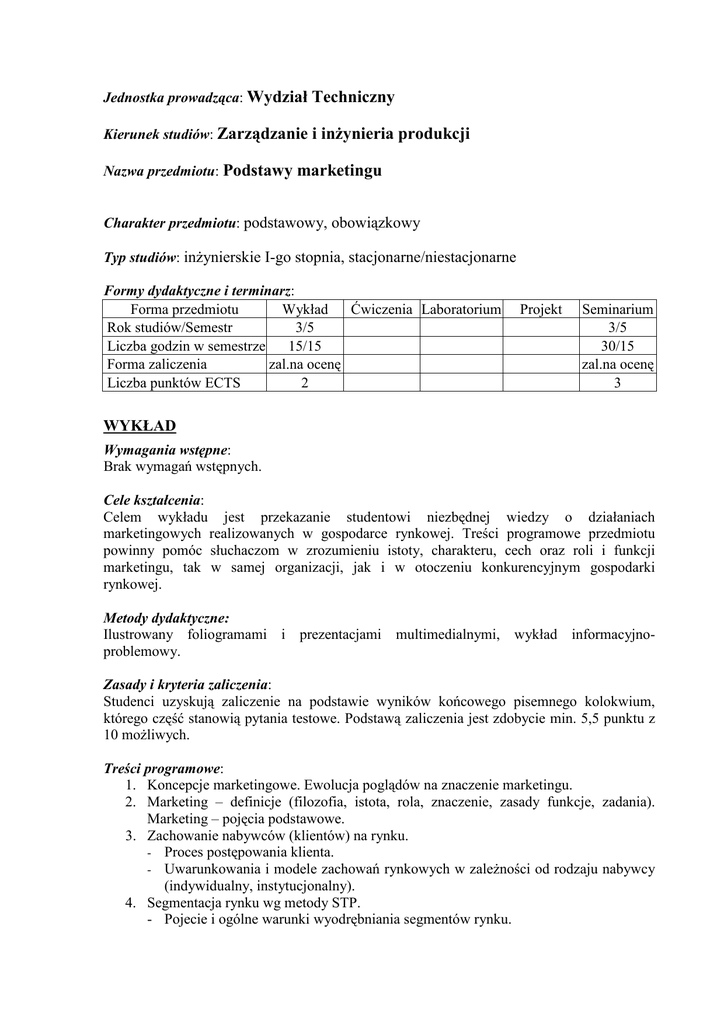 Jednostka prowadząca: Wydział Techniczny Kierunek studiów: Zarządzanie i inŜynieria produkcji Nazwa przedmiotu: Podstawy marketingu Charakter przedmiotu: podstawowy, obowiązkowy Typ studiów: inŜynierskie I-go stopnia, stacjonarne/niestacjonarne Formy dydaktyczne i terminarz: Ćwiczenia Laboratorium Forma przedmiotu Wykład Rok studiów/Semestr 3/5 Liczba godzin w semestrze 15/15 Forma zaliczenia zal.na ocenę Liczba punktów ECTS 2 Projekt Seminarium 3/5 30/15 zal.na ocenę 3 WYKŁAD Wymagania wstępne: Brak wymagań wstępnych. Cele kształcenia: Celem wykładu jest przekazanie studentowi niezbędnej wiedzy o działaniach marketingowych realizowanych w gospodarce rynkowej. Treści programowe przedmiotu powinny pomóc słuchaczom w zrozumieniu istoty, charakteru, cech oraz roli i funkcji marketingu, tak w samej organizacji, jak i w otoczeniu konkurencyjnym gospodarki rynkowej. Metody dydaktyczne: Ilustrowany foliogramami i prezentacjami multimedialnymi, wykład informacyjnoproblemowy. Zasady i kryteria zaliczenia: Studenci uzyskują zaliczenie na podstawie wyników końcowego pisemnego kolokwium, którego część stanowią pytania testowe. Podstawą zaliczenia jest zdobycie min. 5,5 punktu z 10 moŜliwych. Treści programowe: 1. Koncepcje marketingowe. Ewolucja poglądów na znaczenie marketingu. 2. Marketing – definicje (filozofia, istota, rola, znaczenie, zasady funkcje, zadania). Marketing – pojęcia podstawowe. 3. Zachowanie nabywców (klientów) na rynku. - Proces postępowania klienta. - Uwarunkowania i modele zachowań rynkowych w zaleŜności od rodzaju nabywcy (indywidualny, instytucjonalny). 4. Segmentacja rynku wg metody STP. - Pojecie i ogólne warunki wyodrębniania segmentów rynku. 5. 6. 7. 8. - Wybór rynków docelowych i pozycjonowanie oferty. System informacji marketingowej. - Badania marketingowe (rola, zakres badań, procedura, narzędzia oraz metody badań i wnioskowania). Koncepcja marketing-mixu 4P (product, price, promotion, place) i jej rozwinięcie do 5P, 6P i 7P. Instrumenty marketingu partnerskiego - 4C. Instrumenty markering-mix’u 4P. - Produkt (istota, rodzaje, funkcje, filozofia produktu poszerzonego, linia, asortyment, cykl Ŝycia produktu, marka- istota i znaczenie). - Cena (istota i funkcje ceny, procedura i wybrane metody ustalania cen, strategie cenowe, polityka upustów i rabatów). - Promocja (promocja jako proces komunikacji, koncepcja promotion-mix’u narzędzia, public relations, sponsoring, product placement). - Dystrybucja (pojęcie, kanały dystrybucji, rodzaje formy, zadania). Elementy zarządzania marketingowego - podstawowe decyzje strategiczne. Literatura podstawowa: 1. Jendrzejczak E., Tomczak A. Podstawy marketingu dla inŜynierów. Oficyna Wydawnicza PW, Warszawa 2003. 2. Cheverton P., Kluczowe umiejętności marketingowe Strategie, techniki i narzędzia sukcesu rynkowego. Wydawnictwo ONE Press, Warszawa 2006. 3. Kotler Ph., Marketing. Analiza, planowanie, wdraŜanie i kontrola. Wydawnictwo Felberg SJA, Warszawa 2001 (i nowsze). 4. Kotler Ph., Marketing. Uaktualnione, zmienione i uzupełnione wydanie biblii marketingu. Wydawnictwo Rebis, Warszawa 2005. 5. Altktorn J. (red.), Podstawy marketingu. Wydanie 4 zmienione i poszerzone. Instytut Marketingu, Kraków 2006. Literatura uzupełniająca: 1. Kall J., Kłeczek R., Sagan A., Zarządzanie marką, Wydawnictwo Oficyna Ekonomiczna, Warszawa 2005. 2. Światowy G., Zachowania konsumentów. PWE, Warszawa 2006. 3. Duliniec E. Badania marketingowe w zarządzaniu przedsiębiorstwem. PWN, Warszawa 1998. 4. Kłeczek R., Kowal W., Woźniczka J., Strategiczne planowanie marketingowe. PWE, Warszawa 1997. 5. Porter M., Strategie konkurencji. Metody analizy sektorów i konkurentów. PWE, Warszawa 1995 Efekty kształcenia: Student po zakończeniu kursu powinien m.in. rozumieć problematykę obejmującą organizację marketingu w przedsiębiorstwie, być przygotowanym do realizacji zadań marketingowych, umieć posługiwać się podstawowymi metodami i technikami marketingowymi, umieć analizować rynek, być przygotowanym do samodzielnego prowadzenia badań i wielu róŜnorodnych analiz marketingowych i umieć je zastosować w przypadku prowadzenia działalności gospodarczej na własny rachunek Język wykładowy: polski SEMINARIUM Wymagania wstępne: Brak wymagań wstępnych. Cele kształcenia: Celem zajęć jest przygotowanie studentów do podejmowania decyzji związanych z działalnością marketingową. Istotą seminariów jest połączenie teorii z praktyką oraz pogłębienie, weryfikacja wiedzy studenta w praktycznym rozwiązywaniu rzeczywistych problemów z zakresu marketingu dla firm działających w róŜnych branŜach, w oparciu o opracowywane indywidualne projekty lub studia marketingowych przypadków. Metody dydaktyczne: Metody aktywizujące oparte o pracę własną studenta a takŜe - analizy przypadków, dyskusja moderowana i gry symulacyjne. Zasady i kryteria zaliczenia: Student otrzymuje zaliczenie po spełnieniu (łącznie) następujących warunków: - otrzymanie pozytywnej oceny z opracowania i prezentacji referatu, - min. 80% obecności na zajęciach i pozytywna ocena jego aktywności na spotkaniach, - otrzymanie pozytywnych ocen z krótkich, wyrywkowych sprawdzianów. Treści programowe: Tematy opracowywanych przez studentów referatów wybieranie z listy podanej przez prowadzącego. Lista zawiera stałe pozycje tematyczne będące rozwinięciem zagadnień omawianych na wykładzie, które naleŜy opracować indywidualnie lub w grupie, w odniesieniu do wirtualnego przedsiębiorstwa „Przedsiębiorstwa” utworzonego na pierwszym spotkaniu seminaryjnym, w tym: 1. Zdefiniowanie strategii marketingowych na podstawie analizy SWOT „Przedsiębiorstwa”. 2. Analiza portfelowa. Modele – Ansoff i BCG. Wybór metody i przeprowadzenie analizy dla „Przedsiębiorstwa”. 3. Konkurencja – rodzaje i jej rynkowy wymiar. Benchmarking – cele i zasady. Zastosowanie benchmarkin