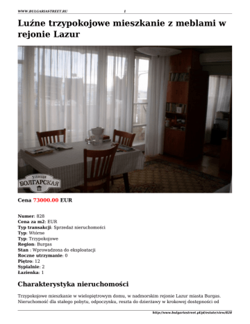 WWW.BULGARIASTREET.RU 1 Luźne trzypokojowe mieszkanie z meblami w rejonie Lazur Cena 73000.00 EUR Numer: 828 Cena za m2: EUR Typ transakcji: Sprzedaż nieruchomości Typ: Wtórne Typ: Trzypokojowe Region: Burgas Stan : Wprowadzona do eksploatacji Roczne utrzymanie: 0 Piętro: 12 Sypialnie: 2 Łazienka: 1 Charakterystyka nieruchomości Trzypokojowe mieszkanie w wielopiętrowym domu, w nadmorskim rejonie Lazur miasta Burgas. Nieruchomość dla stałego pobytu, odpoczynku, reszta do dzierżawy w krokowej dostępności od http://www.bulgariastreet.pl/pl/estate/view/828 WWW.BULGARIASTREET.RU 2 nadmorskiego parku i morza. Charakterystyka mieszkania Mieszkanie znajduje się na 12 kondygnacji budowli i składa się z dużego przedpokoju z spiżarnią, dwóch sypialni, gościnnego pokoju, oddzielnej kuchni, kąpielowego pokoju, węzła sanitarnego, dwóch tarasów. Okna mieszkania wychodzą na południowy zachód. Jest cząstkowy wygląd nad morze. W suterenie jest spiżarnia. Mieszkanie sprzedaje się z meblami. Пола - parkiet, kuchnia, kąpielowy pokój - tabliczka. Drewniane ramy i drzwi. Charakterystyka rejonu Zagospodarowany nadmorski rejon - w 2 хв. chód supermarket, apteki, zatrzymanie się, dziecięcy sadek, szkoła, obok nadmorski park i plaża. Duże parkowanie pod domem. Główne akcenty ● ● ● ● Szybki dostęp do morza i parku Rozwinięta infrastruktura Centralny nadmorski rejon. Adekwatna cena Dodatkowo prowizja agencji! Infrastruktura ● ● ● ● ● ● ● ● ● ● ● ● ● ● ● Miejsca parkingowe Placyk dla dzieci Klimatyzacja Winda Restauracja Supermarket Bar Bankomat Internet Telewizja kablowa Bank Elektrczność Woda Meble Przypilnowane terytorium Informacje o regionie Burgas - to największe miasto w Południowo-wschodniej Bułgarii i czwarty po ilości ludności po Sofii, Warny i Plowdywa. Miasto - centrum jednoimiennego zarządu miasta i obwodu. Międzynarodowy port lotniczy znajduje się na odległości mniej 5 km od miasta. Burgas jest rozmieszczony w najgłębszej zachodniej części Burgaskiej zatoki i znajduje się do 390 km na wschód od bułgarskiej stolicy - r. Sofia. Odległość do Warny - 133 km, a do Plowdywu - 267 km Klimat Klimat w Burgasie jest subtropikalny i wilgotny. Temperatura powietrza latem składa 22,7 stopniów http://www.bulgariastreet.pl/pl/estate/view/828 WWW.BULGARIASTREET.RU 3 Celsjusza, a w zimie temperatura 2,1 stopni Celsjusza. Infrastruktura Miasto Burgas ma opracowaną infrastrukturę europejskiego poziomu. Po pierwsze, miasto jest dużym kolejowym centrum i morskim portem. Tu znajdują się kilka dworców autobusowych i międzynarodowego portu lotniczego. Aktywnie rozwija się spożywczy, elektronowy przemysł, budowa maszyn i do obróbki metali. Gospodarka rolna, leśny przemysł, budownictwo i turyzm najważniejsze branże, co przynosi stabilny dochód i miejsca pracy. Miasto ma w rozporządzeniu doskonałą infrastrukturę, konieczną dla stałego pobytu : sadki, szkoły, sklepy, rynki, polikliniki, apteki, banki, restauracje, kawiarnie, bary, bistro, duża ilość parkowych i stref odpoczynku. Słynny Nadmorski park i pobliska plaża jest zwłaszcza ulubiony mieszkańcami miasta i gośćmi miasta. http://www.bulgariastreet.pl/pl/estate/view/828 WWW.BULGARIASTREET.RU 4 http://www.bulgariastreet.pl/pl/estate/view/828 WWW.BULGARIASTREET.RU 5 Kontakty Agencja "Ulica Bułgarska" (Bulgaria Street Ltd) Bułgaria m. Burgas, 8000 ul. Mitropolit Simeon 3 Strona: www.bulgariastreet.ru Tel: + 359 894 51 50 51 Tel: + 48 223 906 334 Mail: [email protected] Mail: [email protected] Skype: bulstreet http://www.bulgariastreet.pl/pl/estate/view/828
