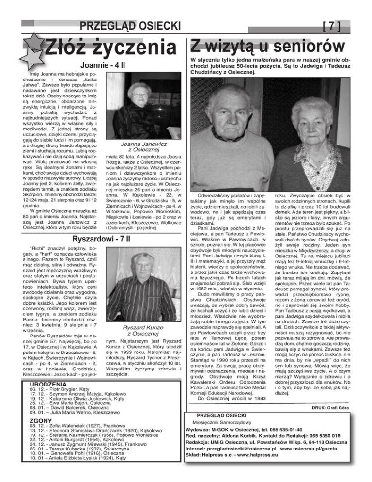 PRZEGLĄD OSIECKI [7] ZłóŜ Ŝyczenia Z wizytą u seniorów Joannie - 4 II Imię Joanna ma hebrajskie pochodzenie i oznacza „łaska Jahwe”. Zawsze było popularne i nadawane jest dziewczynkom także dziś. Osoby noszące to imię są energiczne, obdarzone niezwykłą intuicją i inteligencją. Joanny potrafią wychodzić z najtrudniejszych sytuacji. Ponad wszystko wierzą w własne siły i możliwości. Z jednej strony są uczuciowe, dzięki czemu przyciągają do siebie ludzi i im pomagają, a z drugiej strony twardo stąpają po ziemi i słuchają rozumu. Lubią rozkazywać i nie dają sobą manipulować. Wolą pracować na własną rękę. Są idealnymi żonami i matkami, choć swoje dzieci wychowują w sposób niezwykle surowy. Liczbą Joanny jest 2, kolorem żółty, zwierzęciem termit, a znakiem zodiaku Skorpion. Imieniny obchodzi także: 12 i 24 maja, 21 sierpnia oraz 9 i 12 grudnia. W gminie Osieczna mieszka aż 80 pań o imieniu Joanna. Najstarszą jest Joanna Janowicz z Osiecznej, która w tym roku będzie Joanna Janowicz z Osiecznej miała 82 lata. A najmłodsza Joasia Rózga, także z Osiecznej, w czerwcu skończy 2 latka. Wszystkim paniom i dziewczynkom o imieniu Joanna życzymy radości i uśmiechu na jak najdłuższe życie. W Osiecznej mieszka 26 pań o imieniu Joanna. W Kąkolewie - 22, w Świerczynie - 6, w Grodzisku - 5, w Ziemnicach i Wojnowicach - po 4, w Witosławiu, Popowie Wonieskim, Miąskowie i Łoniewie - po 2 oraz w Jeziorkach, Kleszczewie, Wolkowie i Dobramyśli - po jednej. Ryszardowi - 7 II "Richi" znaczył potężny, bogaty, a "hart" oznacza człowieka silnego. Razem to Ryszard, czyli mąż dzielny, silny i odważny. Ryszard jest mężczyzną wrażliwym oraz stałym w uczuciach i postanowieniach. Bywa typem upartego intelektualisty, który ceni swobodę działania oraz wygodne, spokojne życie. Chętnie czyta dobre książki. Jego kolorem jest czerwony, rośliną wiąz, zwierzęciem tygrys, a znakiem zodiaku Panna. Imieniny obchodzi również: 3 kwietnia, 9 sierpnia i 7 września. Panów Ryszardów żyje w naszej gminie 57. Najwięcej, bo po 17, w Osiecznej i w Kąkolewie. A potem kolejno: w Drzeczkowie - 5, w Kątach, Świerczynie i Wojnowicach - po 4, w Ziemnicach - 2, oraz w Łoniewie, Grodzisku, Kleszczewie i Jeziorkach - po jed- URODZENIA Ryszard Kunze z Osiecznej nym. Najstarszym jest Ryszard Kunze z Osiecznej, który urodził się w 1933 roku. Natomiast najmłodszy, Ryszard Tycner z Kleszczewa, w styczniu skończył 10 lat. Wszystkim życzymy zdrowia i szczęścia. 06. 12. - Piotr Brygier, Kąty 17. 12. - Szymon Andrzej Matyja, Kąkolewo 19. 12. - Katarzyna Oliwia Juskowiak, Kąty 25. 12. - Ewa Maria Bajon, Osieczna 08. 01. – Dawid Balcerek, Osieczna 09. 01. – Julia Maria Werno, Kleszczewo ZGONY W styczniu tylko jedna małżeńska para w naszej gminie obchodzi jubileusz 50-lecia pożycia. Są to Jadwiga i Tadeusz Chudzińscy z Osiecznej. 08. 12. - Zofia Walenciak (1927), Frankowo 13. 12. - Eleonora Stanisława Drańczarek (1920), Kąkolewo 19. 12. - Stefania Kaźmierczak (1956), Popowo Wonieskie 22. 12. - Antoni Burgardt (1954), Kąkolewo 24. 12. - Janusz Zygmunt Milewski (1945), Frankowo 06. 01. - Teresa Kubacka (1932), Świerczyna 10. 01. – Genowefa Pohl (1916), Osieczna 10. 01 – Aniela Elżbieta Łysiak (1924), Kąty Odwiedziliśmy jubilatów i zapytaliśmy jak minęło im wspólne życie, gdzie mieszkali, co robili zawodowo, no i jak spędzają czas teraz, gdy już są emerytami i dziadkami. Pani Jadwiga pochodzi z Maciejewa, a pan Tadeusz z Pawłowic. Właśnie w Pawłowicach, w szkole, poznali się. W tej placówce obydwoje byli młodymi nauczycielami. Pani Jadwiga uczyła klasy IIII i matematyki, a jej przyszły mąż historii, wiedzy o społeczeństwie, a przez jakiś czas także wychowania fizycznego. Po trzech latach znajomości pobrali się. Ślub wzięli w 1962 roku, właśnie w styczniu. Dużo mówiliśmy o pracy państwa Chudzińskich. Obydwoje uważają, że wybrali dobry zawód, że kochali uczyć i że lubili dzieci i młodzież. Właściwie nie wyobrażają sobie innego zajęcia. W tym zawodzie naprawdę się spełniali. A po Pawłowicach uczyli przez trzy lata w Tarnowej Łęce, potem osiemnaście lat w Zielonej Górze i na końcu pani Jadwiga w Świerczynie, a pan Tadeusz w Lesznie. Stamtąd w 1990 roku przeszli na emerytury. Za swoją pracę otrzymywali odznaczenia, medale i nagrody. Obydwoje mają Krzyż Kawalerski Orderu Odrodzenia Polski, a pan Tadeusz także Medal Komisji Edukacji Narodowej. Do Osiecznej wrócili w 1983 PRZEGLĄD OSIECKI Miesięcznik Samorządowy roku. Zwyczajnie chcieli być w swoich rodzinnych stronach. Kupili tu działkę i przez 10 lat budowali domek. A że teren jest piękny, a blisko są jezioro i lasy, innych argumentów nie trzeba było szukać. Po prostu przeprowadzili się już na stałe. Państwo Chudzińscy wychowali dwóch synów. Obydwaj założyli swoje rodziny. Jeden syn mieszka w Międzyrzeczy, a drugi w Osiecznej. Tu na miejscu jubilaci mają też 9-letnią wnuczkę i 6-letniego wnuka. Nie trzeba dodawać, że bardzo ich kochają. Zapytani jak teraz mijają im dni, mówią, że spokojnie. Przez wiele lat pan Tadeusz pomagał synowi, który prowadzi przedsiębiorstwo rybne, razem z żoną uprawiali też ogród, no i zajmowali się swoim hobby. Pan Tadeusz z pasją wędkował, a pani Jadwiga szydełkowała i robiła na drutach. Zawsze też dużo czytali. Dziś oczywiście z takiej aktywności muszą rezygnować, bo nie pozwala na to zdrowie. Ale prowadzą dom, chętnie goszczą rodzinę, bawią się z wnukami. Zawsze też mogą liczyć na pomoc bliskich. nie ma dnia, by nie „wpadli” do nich syn lub synowa. Mówią więc, że mają szczęśliwe życie. A o czym marzą? Wyłącznie o zdrowiu i o dobrej przyszłości dla wnuków. No i o tym, aby byli ze sobą jak najdłużej. DRUK: Grafi Góra Wydawca: M-GOK w Osiecznej, tel. 065 535-01-40 Red. naczelny: Aldona Korbik. Kontakt