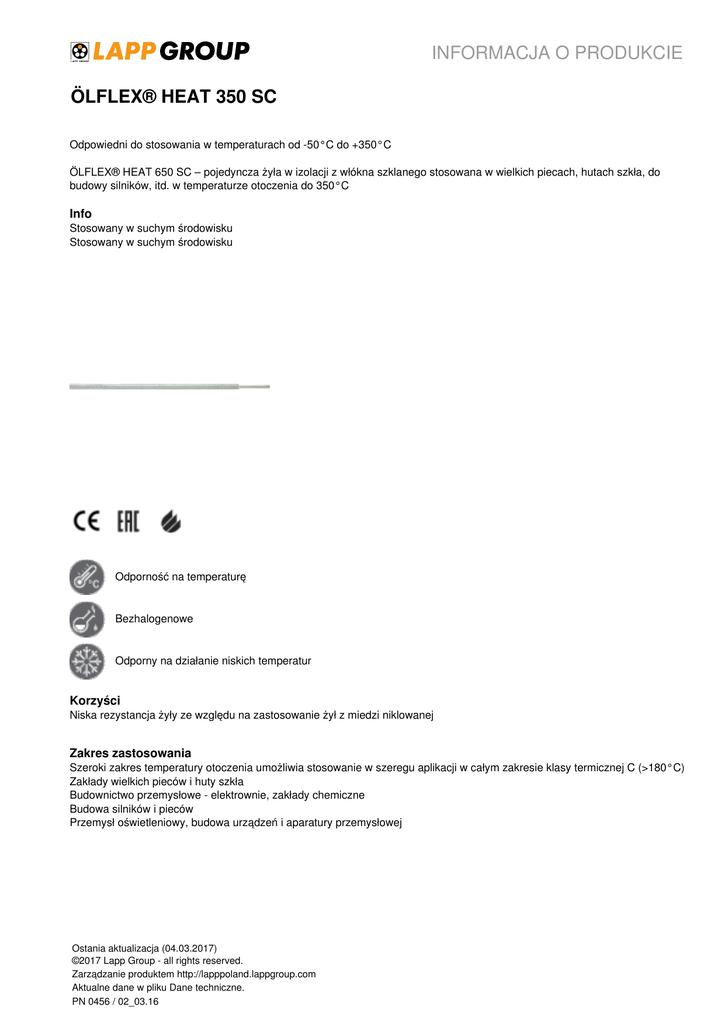 INFORMACJA O PRODUKCIE ÖLFLEX® HEAT 350 SC Odpowiedni do stosowania w temperaturach od -50°C do +350°C ÖLFLEX® HEAT 650 SC – pojedyncza żyła w izolacji z włókna szklanego stosowana w wielkich piecach, hutach szkła, do budowy silników, itd. w temperaturze otoczenia do 350°C Info Stosowany w suchym środowisku Stosowany w suchym środowisku Odporność na temperaturę Bezhalogenowe Odporny na działanie niskich temperatur Korzyści Niska rezystancja żyły ze względu na zastosowanie żył z miedzi niklowanej Zakres zastosowania Szeroki zakres temperatury otoczenia umożliwia stosowanie w szeregu aplikacji w całym zakresie klasy termicznej C (>180°C) Zakłady wielkich pieców i huty szkła Budownictwo przemysłowe - elektrownie, zakłady chemiczne Budowa silników i pieców Przemysł oświetleniowy, budowa urządzeń i aparatury przemysłowej Ostania aktualizacja (04.03.2017) ©2017 Lapp Group - all rights reserved. Zarządzanie produktem http://lapppoland.lappgroup.com Aktualne dane w pliku Dane techniczne. PN 0456 / 02_03.16 INFORMACJA O PRODUKCIE ÖLFLEX® HEAT 350 SC Cechy produktu Niepodtrzymywanie płomieni Bezhalogenowe Przystosowany do użytkowania wyłącznie w warunkach suchych ÖLFLEX® HEAT 650 SC oraz ÖLFLEX® HEAT 1565 SC są polecane do aplikacji, w których temperatura szczytowa może przekroczyć +350°C Budowa produktu Linka z cienkich drucików z miedzi niklowanej Izolacja żyły z obwoju z włókna szklanego i impregnowanego oplotu z włókna szklanego Żyły o przekroju > 16 mm² dodatkowy obwój z taśmy mikowej Kolor izolacji żyły: biały Dane techniczne Klasyfikacja: ETIM 5.0 Class-ID: EC000993 Opis klasy ETIM 5.0: Przewód z żyłą pojedynczą Budowa żyły: Z cienkich drucików zgodnie z VDE 0295 klasa 5/IEC 60228 klasa 5 Minimalny promień gięcia: Połączenie nieruchome: 5 x średnica zewnętrzna Napięcie nominalne: U 0 /U 230/400 V Napięcie próbne: 1500 V Zakres temperatury: Połączenia nieruchome: od -50°C do +350°C (wymagana odpowiednia wentylacja) Wskazówka Wszystkie podane wartości dotyczące produktów są wartościami nominalnymi (o ile nie wskazano inaczej). Inne wartości, takie jak np. tolerancje mogą być przedstawione na zamówienie (jeżeli są dostępne i przeznaczone do publikacji). Standardowe odcinki proszę sprawdzić na: www.lapppolska.pl Rodzaj opakowania: Krążek ≤ 30 kg, w innym przypadku bęben Prosimy określić wielkość opakowania (np. 1 x 500 m bęben lub 5 x 100 m krążek) Fotografie nie mogą być używane do wymiarowania oraz nie stanowią szczegółowego odwzorowania przedstawionych produktów. * Podane ceny to ceny netto bez podatku VAT i dodatkowych opłat. Sprzedaż klientom biznesowym. Ostania aktualizacja (04.03.2017) ©2017 Lapp Group - all rights reserved. Zarządzanie produktem http://lapppoland.lappgroup.com Aktualne dane w pliku Dane techniczne. PN 0456 / 02_03.16 Powered by TCPDF (www.tcpdf.org) Przekrój żyły [mm²] Średnica zewnętrzna [mm] Indeks miedzi [kg/km] Waga [kg/km] 0091350 0,5 2,5 4,8 13 0091351 0,75 3 7,2 15 0091352 1 3,4 9,6 17 0091353 1,5 3,5 14,4 23 0091354 2,5 3,7 24 34 0091355 4 4,2 38,4 54 0091356 6 6,2 57,6 84 0091357 10 7,3 96 120 0091358 16 8 153,6 199 0091359 25 9,5 240 300 0091360 35 10,9 336 399 0091361 50 13,2 480 540 ÖLFLEX® HEAT 350 SC ÖLFLEX® HEAT 350 SC Ostania aktualizacja (04.03.2017) ©2017 Lapp Group - all rights reserved. Zarządzanie produktem http://lapppoland.lappgroup.com Aktualne dane w pliku Dane techniczne. PN 0456 / 02_03.16 INFORMACJA O PRODUKCIE Powered by TCPDF (www.tcpdf.org) Numer katalogowy