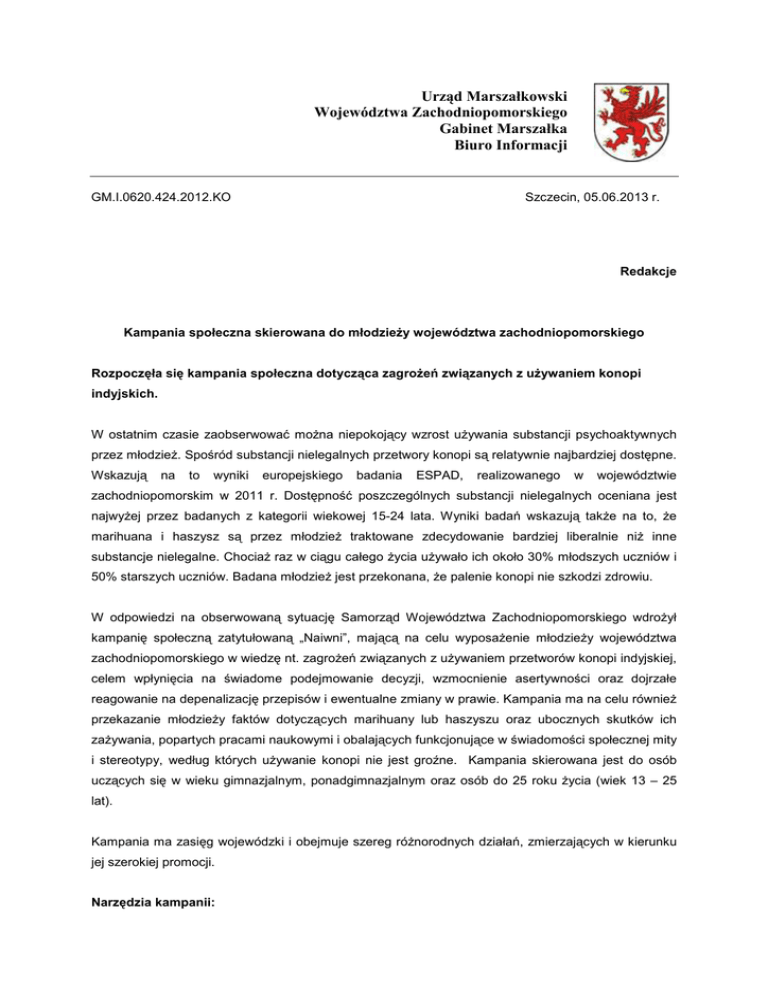 Urząd Marszałkowski Województwa Zachodniopomorskiego Gabinet Marszałka Biuro Informacji GM.I.0620.424.2012.KO Szczecin, 05.06.2013 r. Redakcje Kampania społeczna skierowana do młodzieŜy województwa zachodniopomorskiego Rozpoczęła się kampania społeczna dotycząca zagroŜeń związanych z uŜywaniem konopi indyjskich. W ostatnim czasie zaobserwować moŜna niepokojący wzrost uŜywania substancji psychoaktywnych przez młodzieŜ. Spośród substancji nielegalnych przetwory konopi są relatywnie najbardziej dostępne. Wskazują na to wyniki europejskiego badania ESPAD, realizowanego w województwie zachodniopomorskim w 2011 r. Dostępność poszczególnych substancji nielegalnych oceniana jest najwyŜej przez badanych z kategorii wiekowej 15-24 lata. Wyniki badań wskazują takŜe na to, Ŝe marihuana i haszysz są przez młodzieŜ traktowane zdecydowanie bardziej liberalnie niŜ inne substancje nielegalne. ChociaŜ raz w ciągu całego Ŝycia uŜywało ich około 30% młodszych uczniów i 50% starszych uczniów. Badana młodzieŜ jest przekonana, Ŝe palenie konopi nie szkodzi zdrowiu. W odpowiedzi na obserwowaną sytuację Samorząd Województwa Zachodniopomorskiego wdroŜył kampanię społeczną zatytułowaną „Naiwni”, mającą na celu wyposaŜenie młodzieŜy województwa zachodniopomorskiego w wiedzę nt. zagroŜeń związanych z uŜywaniem przetworów konopi indyjskiej, celem wpłynięcia na świadome podejmowanie decyzji, wzmocnienie asertywności oraz dojrzałe reagowanie na depenalizację przepisów i ewentualne zmiany w prawie. Kampania ma na celu równieŜ przekazanie młodzieŜy faktów dotyczących marihuany lub haszyszu oraz ubocznych skutków ich zaŜywania, popartych pracami naukowymi i obalających funkcjonujące w świadomości społecznej mity i stereotypy, według których uŜywanie konopi nie jest groźne. Kampania skierowana jest do osób uczących się w wieku gimnazjalnym, ponadgimnazjalnym oraz osób do 25 roku Ŝycia (wiek 13 – 25 lat). Kampania ma zasięg wojewódzki i obejmuje szereg róŜnorodnych działań, zmierzających w kierunku jej szerokiej promocji. Narzędzia kampanii: - Strona internetowa www.naiwni.wzp.pl - Fanpage na Facebook www.facebook.pl/naiwni - Klip wideo (do pobrania na stronach kampanii) - Outdoor (billboardy, plakaty) - Ulotki w formie okładek na bilety kolejowe - Ogłoszenia prasowe Biuro Informacji Urząd Marszałkowski Województwa Zachodniopomorskiego 70-540 Szczecin, ul. Korsarzy 34 tel. +48 91 48 07 249 faks +48 91 48 93 987 e-mail: [email protected] www.wzp.pl www.facebook.com/umwzp