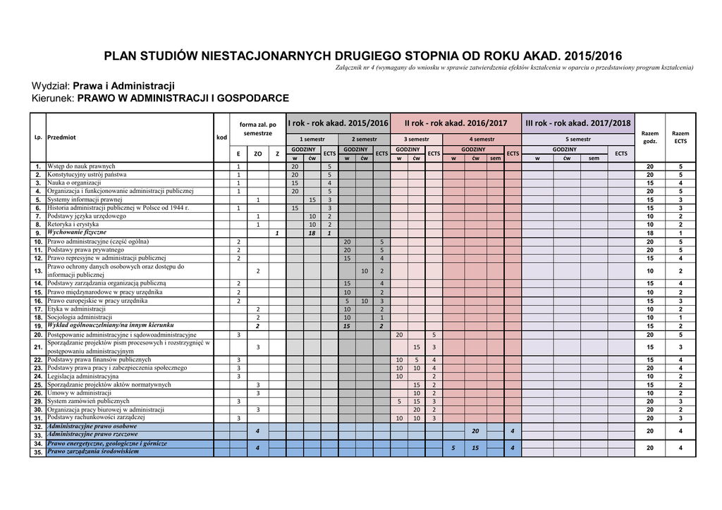 PLAN STUDIÓW NIESTACJONARNYCH DRUGIEGO STOPNIA OD ROKU AKAD. 2015/2016 Załącznik nr 4 (wymagany do wniosku w sprawie zatwierdzenia efektów kształcenia w oparciu o przedstawiony program kształcenia) Wydział: Prawa i Administracji Kierunek: PRAWO W ADMINISTRACJI I GOSPODARCE Lp. Przedmiot kod forma zal. po semestrze 1 semestr E 1. 2. 3. 4. 5. 6. 7. 8. 9. 10. 11. 12. 13. Wstęp do nauk prawnych Konstytucyjny ustrój państwa Nauka o organizacji Organizacja i funkcjonowanie administracji publicznej Systemy informacji prawnej Historia administracji publicznej w Polsce od 1944 r. Podstawy języka urzędowego Retoryka i erystyka Wychowanie fizyczne Prawo administracyjne (część ogólna) Podstawy prawa prywatnego Prawo represyjne w administracji publicznej Prawo ochrony danych osobowych oraz dostępu do informacji publicznej Podstawy zarządzania organizacją publiczną Prawo międzynarodowe w pracy urzędnika Prawo europejskie w pracy urzędnika Etyka w administracji Socjologia administracji Wykład ogólnouczelniany/na innym kierunku 14. 15. 16. 17. 18. 19. 20. Postępowanie administracyjne i sądowoadministracyjne 21. 22. 23. 24. 25. 26. 29. 30. 31. 32. 33. 34. 35. Sporządzanie projektów pism procesowych i rozstrzygnięć w postępowaniu administracyjnym Podstawy prawa finansów publicznych Podstawy prawa pracy i zabezpieczenia społecznego Legislacja administracyjna Sporządzanie projektów aktów normatywnych Umowy w administracji System zamówień publicznych Organizacja pracy biurowej w administracji Podstawy rachunkowości zarządczej Administracyjne prawo osobowe Administracyjne prawo rzeczowe Prawo energetyczne, geologiczne i górnicze Prawo zarządzania środowiskiem I rok - rok akad. 2015/2016 ZO Z 1 1 1 1 GODZINY w ćw 20 20 15 20 1 15 15 1 1 1 1 2 2 2 10 10 18 ECTS GODZINY w ćw 3 Razem ECTS 5 5 4 20 20 15 20 15 15 10 10 18 20 20 15 5 5 4 5 3 3 2 2 1 5 5 4 2 10 2 4 2 3 2 1 2 4 2 3 2 1 2 5 3 semestr ECTS GODZINY w ćw 10 15 10 5 10 10 15 10 10 10 10 3 3 3 5 3 3 ECTS w 10 GODZINY ECTS ćw sem w GODZINY ćw sem ECTS 5 15 3 15 3 5 10 4 4 2 2 2 3 2 3 15 20 10 15 10 20 20 20 4 4 2 2 2 3 2 3 15 10 15 20 10 4 4 5 semestr 15 10 15 10 10 15 20 20 3 3 3 3 4 semestr 5 5 4 5 3 3 2 2 1 2 2 2 2 III rok - rok akad. 2017/2018 Razem godz. 2 semestr 20 20 15 2 2 2 II rok - rok akad. 2016/2017 5 20 4 20 4 15 4 20 4 Lp. Przedmiot kod forma zal. po semestrze 1 semestr E 36. 37. 38. 39. 40. 41. 42. 43. 44. 45. 46. 47. 48. 49. 50. 51. 52. 53. 54. 55. 56. Systemy finansowania projektów w Unii Europejskiej Prawo danin publicznych Egzekucja administracyjna i sądowa Odpowiedzialność administracji publicznej Prawo urzędnicze Statystyka w administracji Oprogramowanie specjalistyczne w administracji Planowanie, programowanie i projekty w administracji publicznej Język obcy Seminarium dyplomowe Publiczne prawo medyczne Prawo telekomunikacyjne i łączności Negocjacje, mediacje i rozwiązywanie konfliktów Zachowania organizacyjne Prawo konkurencji Prywatyzacja zadań publicznych Gospodarka komunalna/spółki komunalne Publiczne prawo morskie Zarządzanie zasobami ludzkimi Przedmiot do wyboru 1 Przedmiot do wyboru 2 ZO Z GODZINY w ćw ECTS II rok - rok akad. 2016/2017 2 semestr GODZINY w ćw 3 semestr ECTS GODZINY w ćw ECTS 4 4 4 w Razem godz. Razem ECTS 3 15 3 3 15 3 2 2 3 10 10 15 2 2 3 5 semestr GODZINY ECTS ćw sem 10 5 10 10 15 4 5 III rok - rok akad. 2017/2018 4 semestr 5 10 5 15 10 4 4 15 3 4, 5 4, 5 18 2 4 15 w GODZINY ćw sem 18 15 ECTS 15 3 2 7 36 30 4 11 5 10 3 15 3 5 15 10 3 15 3 5 5 10 3 15 3 5 5 10 10 10 15 15 2 2 2 3 3 10 10 10 15 15 739 2 2 2 3 3 150 5 5 5 5 5 RAZEM: RAZEM: Przedmioty do wyboru: Wszystkie: Przedmioty do wyboru/ wszystkie Legenda: E - egzamin ZO - zalicznie na ocenę Z - zaliczenie na zal W - wykład ćw - ćwiczenia audytoryjne Sem - seminarium dyplomowe I rok - rok akad. 2015/2016 Wykłady (liczba godzin): ćwiczenia, seminaria itp. (liczba godzin): 90 53 30 120 20 140 30 RAZEM I ROK GODZINY: 283 ECTS: 143 ECTS: ECTS: 30 30 60 138 30 15 153 30 RAZEM II ROK GODZINY: 318 ECTS: 65 100 165 47 150 31% 536 co stanowi 73% wszystkich godzin 203 * Szkolenie BHP przewidziane jest e-learningowo dla wszystkich studentów rozpoczynających naukę na kierunku Prawo w administracji i gospodarce * Szkolenie biblioteczne przewidziane jest e-learningowo dla studentów chcących korzystać z biblioteki 30 30 60 123 15 138 RAZEM III ROK GODZINY: 138 ECTS: 30 30 30