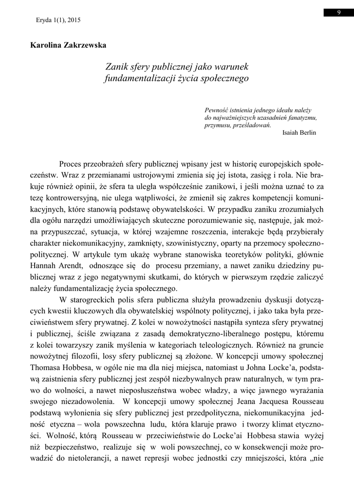 9 Eryda 1(1), 2015 Karolina Zakrzewska Zanik sfery publicznej jako warunek fundamentalizacji życia społecznego Pewność istnienia jednego ideału należy do najważniejszych uzasadnień fanatyzmu, przymusu, prześladowań. Isaiah Berlin Proces przeobrażeń sfery publicznej wpisany jest w historię europejskich społeczeństw. Wraz z przemianami ustrojowymi zmienia się jej istota, zasięg i rola. Nie brakuje również opinii, że sfera ta uległa współcześnie zanikowi, i jeśli można uznać to za tezę kontrowersyjną, nie ulega wątpliwości, że zmienił się zakres kompetencji komunikacyjnych, które stanowią podstawę obywatelskości. W przypadku zaniku zrozumiałych dla ogółu narzędzi umożliwiających skuteczne porozumiewanie się, następuje, jak można przypuszczać, sytuacja, w której wzajemne roszczenia, interakcje będą przybierały charakter niekomunikacyjny, zamknięty, szowinistyczny, oparty na przemocy społecznopolitycznej. W artykule tym ukażę wybrane stanowiska teoretyków polityki, głównie Hannah Arendt, odnoszące się do procesu przemiany, a nawet zaniku dziedziny publicznej wraz z jego negatywnymi skutkami, do których w pierwszym rzędzie zaliczyć należy fundamentalizację życia społecznego. W starogreckich polis sfera publiczna służyła prowadzeniu dyskusji dotyczących kwestii kluczowych dla obywatelskiej wspólnoty politycznej, i jako taka była przeciwieństwem sfery prywatnej. Z kolei w nowożytności nastąpiła synteza sfery prywatnej i publicznej, ściśle związana z zasadą demokratyczno-liberalnego postępu, któremu z kolei towarzyszy zanik myślenia w kategoriach teleologicznych. Również na gruncie nowożytnej filozofii, losy sfery publicznej są złożone. W koncepcji umowy społecznej Thomasa Hobbesa, w ogóle nie ma dla niej miejsca, natomiast u Johna Locke’a, podstawą zaistnienia sfery publicznej jest zespół niezbywalnych praw naturalnych, w tym prawo do wolności, a nawet nieposłuszeństwa wobec władzy, a więc jawnego wyrażania swojego niezadowolenia. W koncepcji umowy społecznej Jeana Jacquesa Rousseau podstawą wyłonienia się sfery publicznej jest przedpolityczna, niekomunikacyjna jedność etyczna – wola powszechna ludu, która klaruje prawo i tworzy klimat etyczności. Wolność, którą Rousseau w przeciwieństwie do Locke’ai Hobbesa stawia wyżej niż bezpieczeństwo, realizuje się w woli powszechnej, co w konsekwencji może prowadzić do nietolerancji, a nawet represji wobec jednostki czy mniejszości, która „nie 10 Eryda 1(1), 2015 rozumie”, „nie wyczuwa” wspólnego dobra, a więc do radykalizmu, na co zwraca uwagę chociażby Jürgen Habermas1. Cytując Marcina Mazurka: „wola powszechna może się mijać z wolą mniejszości lub większości”, gdyż większość może źle rozpoznać swoje dobro, „stąd demokracja może nie tylko wymagać podporządkowania mniejszości decyzjom większości, lecz daje się także doskonale pogodzić z elitaryzmem” 2. Można powiedzieć, że tradycja ta stale konkuruje z Locke’owską – liberalną, w której interes jednostki wyprzedza akt umowy społecznej, tym samym państwo służy jedynie zagwarantowaniu jednostkowych interesów, co może z kolei prowadzić do atomizacji społecznej oraz problemów związanych z legitymizacją władzy. W tym wypadku struktura państwowa, która ma zapewniać miejsce dla istnienia sfery publicznej nie wystarcza, ponieważ społeczeństwu brakuje narzędzi do rozwiązywania problemów natury moralnej, prawnej, czy ekonomicznej, zatem sfera publiczna przestaje być miejscem artykułowania interesów społecznych, na co antidotum we współczesnym, masowym społeczeństwie stara się znaleźć Habermas3. Wracając do starożytności, nie sposób nie wspomnieć o starogreckim pojęciu natury wraz z jego intelektualnymi i politycznymi uwarunkowaniami. W przeciwieństwie do Grecji archaicznej, w której physis była mocą stwarzającą bezpieczny pomost łączący świat bogów i ludzi, w kulturze klasycznej staje się odległą przeszłością. Marek J. Siemek zauważa, że „dawną moc praw <boskich> albo <naturalnych>, których święta, ale tajemna i dla człowieka nieprzenikniona <sprawiedliwość>, dike (δίκη), objawiała się niegdyś we wszechwładzy nadludzkich potęg” wypiera „nomos (νόμoς), suwerenne prawo i prawodawstwo państwowych ustaw” wynikających ze świadomych i wolnych decyzji i czynów. Tym samym rodzący się w jednym miejscu i czasie „filozoficzny logos (λόγος) europejskiej kultury z demokratyczną praktyką politycznego wyrażania i kształtowania się zbiorowej woli rozwiniętą po raz pierwszy w greckiej polis (πόλης) istnieją równoważnie w przestrzeni sankcjonowanego prawa4. W świecie pozbawionym bogów zrozumiałym staje się dążenie do panowania nad naturą i jej siłami poprzez rozwój poiesis – wytwórczości materialnej. Aktywność ludzka staje się celowa, wykracza poza działanie instrumentalne, powołuje do życia istnienia, których nie można sprowadzić do płodu natury. Oczywiście poiesis odbywa się w kontekście logosu i polis. Stąd dla Greków sztuka była pewną techniką tworzenia dzieł (od greckiego poíesis jak sztuka poetycka, tworzenie, wytwórczość). Arystoteles nazyZob. J. Habermas, Obywatelstwo a tożsamość narodowa, przeł. B. Markiewicz, Wydawnictwo IFiS PAN, Warszawa 1993, s. 10-14. Zob. też J. Habermas, Uwzględniając Innego. Studia do teorii politycznej, przeł. A. Romaniuk, J. Kloc-Konkołowicz, WN PWN, Warszawa 2009. 2 M. Mazurek, Zarządzanie bezpieczeństwem jako dysfunkcja systemu władzy, Difin, Warszawa 2014, s. 17. 3 Zob. J. Habermas, Teoria Działania Komunikacyjnego, przeł. A. Kaniowski, M. Siemek, WN PWN, Warszawa 2002. 4 Zob. M. J. Siemek, Wolność, rozum, intersubiektywność, Oficyna Naukowa, Warszawa 2002, s. 5-8. 1 11 Eryda 1(1), 2015 wał to ergon, czyli produkcja czystego świata artefaktów. J
