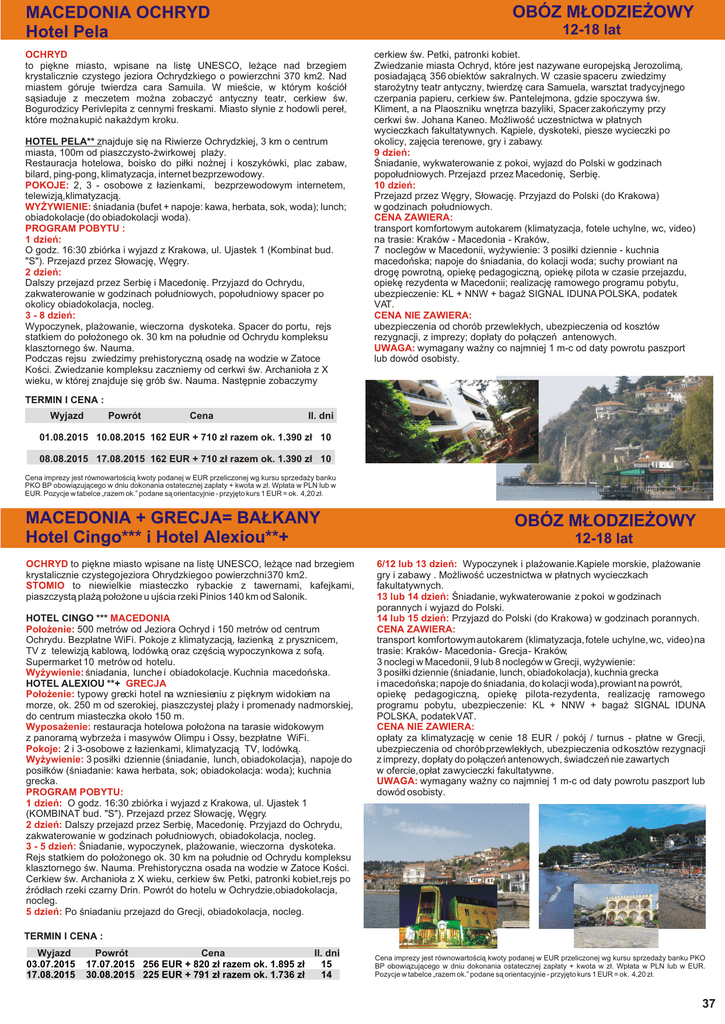 OBÓZ M£ODZIE¯OWY MACEDONIA OCHRYD Hotel Pela 12-18 lat OCHRYD to piêkne miasto, wpisane na listê UNESCO, le¿¹ce nad brzegiem krystalicznie czystego jeziora Ochrydzkiego o powierzchni 370 km2. Nad miastem góruje twierdza cara Samuila. W mieœcie, w którym koœció³ s¹siaduje z meczetem mo¿na zobaczyæ antyczny teatr, cerkiew œw. Bogurodzicy Perivlepita z cennymi freskami. Miasto s³ynie z hodowli pere³, które mo¿na kupiæ na ka¿dym kroku. HOTEL PELA** znajduje siê na Riwierze Ochrydzkiej, 3 km o centrum miasta, 100m od piaszczysto-¿wirkowej pla¿y. Restauracja hotelowa, boisko do pi³ki no¿nej i koszykówki, plac zabaw, bilard, ping-pong, klimatyzacja, internet bezprzewodowy. POKOJE: 2, 3 - osobowe z ³azienkami, bezprzewodowym internetem, telewizj¹,klimatyzacj¹. WY¯YWIENIE: œniadania (bufet + napoje: kawa, herbata, sok, woda); lunch; obiadokolacje (do obiadokolacji woda). PROGRAM POBYTU : 1 dzieñ: O godz. 16:30 zbiórka i wyjazd z Krakowa, ul. Ujastek 1 (Kombinat bud. "S"). Przejazd przez S³owacjê, Wêgry. 2 dzieñ: Dalszy przejazd przez Serbiê i Macedoniê. Przyjazd do Ochrydu, zakwaterowanie w godzinach po³udniowych, popo³udniowy spacer po okolicy obiadokolacja, nocleg. 3 - 8 dzieñ: Wypoczynek, pla¿owanie, wieczorna dyskoteka. Spacer do portu, rejs statkiem do po³o¿onego ok. 30 km na po³udnie od Ochrydu kompleksu klasztornego œw. Nauma. Podczas rejsu zwiedzimy prehistoryczn¹ osadê na wodzie w Zatoce Koœci. Zwiedzanie kompleksu zaczniemy od cerkwi œw. Archanio³a z X wieku, w której znajduje siê grób œw. Nauma. Nastêpnie zobaczymy cerkiew œw. Petki, patronki kobiet. Zwiedzanie miasta Ochryd, które jest nazywane europejsk¹ Jerozolim¹, posiadaj¹c¹ 356 obiektów sakralnych. W czasie spaceru zwiedzimy staro¿ytny teatr antyczny, twierdzê cara Samuela, warsztat tradycyjnego czerpania papieru, cerkiew œw. Pantelejmona, gdzie spoczywa œw. Kliment, a na Plaoszniku wnêtrza bazyliki, Spacer zakoñczymy przy cerkwi œw. Johana Kaneo. Mo¿liwoœæ uczestnictwa w p³atnych wycieczkach fakultatywnych. K¹piele, dyskoteki, piesze wycieczki po okolicy, zajêcia terenowe, gry i zabawy. 9 dzieñ: Œniadanie, wykwaterowanie z pokoi, wyjazd do Polski w godzinach popo³udniowych. Przejazd przez Macedoniê, Serbiê. 10 dzieñ: Przejazd przez Wêgry, S³owacjê. Przyjazd do Polski (do Krakowa) w godzinach po³udniowych. CENA ZAWIERA: transport komfortowym autokarem (klimatyzacja, fotele uchylne, wc, video) na trasie: Kraków - Macedonia - Kraków, 7 noclegów w Macedonii, wy¿ywienie: 3 posi³ki dziennie - kuchnia macedoñska; napoje do œniadania, do kolacji woda; suchy prowiant na drogê powrotn¹, opiekê pedagogiczn¹, opiekê pilota w czasie przejazdu, opiekê rezydenta w Macedonii; realizacjê ramowego programu pobytu, ubezpieczenie: KL + NNW + baga¿ SIGNAL IDUNA POLSKA, podatek VAT. CENA NIE ZAWIERA: ubezpieczenia od chorób przewlek³ych, ubezpieczenia od kosztów rezygnacji, z imprezy; dop³aty do po³¹czeñ antenowych. UWAGA: wymagany wa¿ny co najmniej 1 m-c od daty powrotu paszport lub dowód osobisty. TERMIN I CENA : Wyjazd Powrót Cena Il. dni 01.08.2015 10.08.2015 162 EUR + 710 z³ razem ok. 1.390 z³ 10 08.08.2015 17.08.2015 162 EUR + 710 z³ razem ok. 1.390 z³ 10 Cena imprezy jest równowartoœci¹ kwoty podanej w EUR przeliczonej wg kursu sprzeda¿y banku PKO BP obowi¹zuj¹cego w dniu dokonania ostatecznej zap³aty + kwota w z³. Wp³ata w PLN lub w EUR. Pozycje w tabelce „razem ok.” podane s¹ orientacyjnie - przyjêto kurs 1 EUR = ok. 4,20 z³. MACEDONIA + GRECJA= BA£KANY Hotel Cingo*** i Hotel Alexiou**+ OCHRYD to piêkne miasto wpisane na listê UNESCO, le¿¹ce nad brzegiem krystalicznie czystego jeziora Ohrydzkiego o powierzchni 370 km2. STOMIO to niewielkie miasteczko rybackie z tawernami, kafejkami, piaszczyst¹ pla¿¹ po³o¿one u ujœcia rzeki Pinios 140 km od Salonik. HOTEL CINGO *** MACEDONIA Po³o¿enie: 500 metrów od Jeziora Ochryd i 150 metrów od centrum Ochrydu. Bezp³atne WiFi. Pokoje z klimatyzacj¹, ³azienk¹ z prysznicem, TV z telewizj¹ kablow¹, lodówk¹ oraz czêœci¹ wypoczynkowa z sof¹. Supermarket 10 metrów od hotelu. Wy¿ywienie: œniadania, lunche i obiadokolacje. Kuchnia macedoñska. HOTEL ALEXIOU **+ GRECJA Po³o¿enie: typowy grecki hotel na wzniesieniu z piêknym widokiem na morze, ok. 250 m od szerokiej, piaszczystej pla¿y i promenady nadmorskiej, do centrum miasteczka oko³o 150 m. Wyposa¿enie: restauracja hotelowa po³o¿ona na tarasie widokowym z panoram¹ wybrze¿a i masywów Olimpu i Ossy, bezp³atne WiFi. Pokoje: 2 i 3-osobowe z ³azienkami, klimatyzacj¹ TV, lodówk¹. Wy¿ywienie: 3 posi³ki dziennie (œniadanie, lunch, obiadokolacja), napoje do posi³ków (œniadanie: kawa herbata, sok; obiadokolacja: woda); kuchnia grecka. PROGRAM POBYTU: 1 dzieñ: O godz. 16:30 zbiórka i wyjazd z Krakowa, ul. Ujastek 1 (KOMBINAT bud. "S"). Przejazd przez S³owacjê, Wêgry. 2 dzieñ: Dalszy przejazd przez Serbiê, Macedoniê. Przyjazd do Ochrydu, zakwaterowanie w godzinach po³udniowych, obiadokolacja, nocleg. 3 - 5 dzieñ: Œniadanie, wypoczynek, pla¿owanie, wieczorna dyskoteka. Rejs statkiem do po³o¿onego ok. 30 km na po³udnie od Ochrydu kompleksu klasztornego œw. Nauma. Prehistoryczna osada na wodzie w Zatoce Koœci. Cerkiew œw. Archanio³a z X wieku, cerkiew œw. Petki, patronki kobiet,rejs po Ÿród³ach rzeki czarny Drin. Powrót do hotelu w Ochrydzie,obiadokolacja, nocleg. 5 dzieñ: Po œniadaniu przejazd do Grecji, obiadokolacja, nocleg. OBÓZ M£ODZIE¯OWY 12-18 lat 6/12 lub 13 dzieñ: Wypoczynek i pla¿owanie.K¹piele morskie, pla¿owanie gry i zabawy . Mo¿liwoœæ uczestnictwa w p³atnych wycieczkach fakultatywnych. 13 lub 14 dzieñ: Œniadanie, wykwaterowanie z pokoi w godzinach porannych i wyjazd do Polski. 14 lub 15 dzieñ: Przyjazd do Polski (do Krakowa) w godzinach porannych. CENA ZAWIERA: transport komfortowym autokarem (klimatyzacja, fotele uchylne, wc, video) na tra