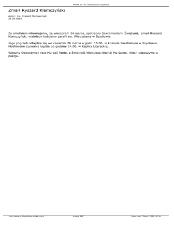 Parafia pw. Św. Władysława w Szydłowie Zmarł Ryszard Klamczyński Autor: ks. Ryszard Piwowarczyk 25.03.2015. Ze smutkiem informujemy, że wieczorem 24 marca, opatrzony Sakramentami Świętymi, zmarł Ryszard Klamczyński, wieloletni kościelny parafii św. Władysława w Szydłowie. Jego pogrzeb odbędzie się we czwartek 26 marca o godz. 15.00. w kościele Parafialnym w Szydłowie. Modlitwene czuwanie będzie od godziny 14.00. w Kaplicy Literackiej. Wieczny Odpoczynek racz Mu dać Panie, a Światłość Wiekuista niechaj Mu świeci. Niech odpoczywa w pokoju. http://www.szydlow.kielce.opoka.org.pl Kreator PDF Utworzono 7 March, 2017, 02:34