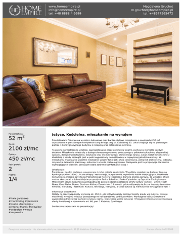 www.homeempire.pl [email protected] tel. +48 8888 4 6699 Magdalena Gruchot [email protected] tel. +48577565472 Jeżyce, Kościelna Powierzchnia: 52 m2 Cena: 2100 zł/mc Opłaty: 450 zł/mc Ilość pokoi: 2 Piętro: 1/4 #hala garażowa #monitoring #piekarnik #pralka #recepcja / ochrona #taras #telewizor #wideofon #winda #zmywarka Jeżyce, Kościelna, mieszkanie na wynajem Przedstawiam Państwu na wynajem luksusowe oraz bardzo stylowe mieszkanie o powierzchni 52 m2 usytuowane w prestiżowym kompleksie Long Bridge przy ul. Kościelnej 33. Lokal znajduje się na pierwszym piętrze 4-kondygnacyjnego budynku z recepcją oraz całodobową ochroną. To piękne i przestrzenne wnętrze, zaprojektowane przez architekta wnętrz, zachwyca niemalże każdym detalem. Mieszkanie składa się z dużego słonecznego salonu połączonego z półotwartą kuchnią, eleganckiej sypialni, designerskiej łazienki, korytarza oraz 16-metrowego, słonecznego tarasu. Lokal został wykończony z dbałością o każdy szczegół, jest w pełni wyposażony i umeblowany w najwyższej jakości materiały. W mieszkaniu znajdują się wszelkie niezbędne sprzęty takie jak: płyta ceramiczna, piekarnik elektryczny, lodówka, zmywarka, telewizor plazmowy, odkurzacz a także meble ogrodowe. Niebywale jest to propozycja dla bardzo wymagających klientów, ceniących sobie zarówno komfort jak i klasę ! Lokalizacja: Prestiżowe, bardzo zadbane, nowoczesne i ciche osiedle zamknięte. W pobliżu znajduje się kultowy targ na Rynku Jeżyckim (250m) , liczne sklepy i restauracje, burgerownie, wytwórnia lodów tradycyjnych, doskonała komunikacja miejska czy stacja Poznańskiego Roweru Miejskiego. Barwna okolica sprawia, że w każdej chwili można skorzystać z dobrodziejstw przyrody w Parku Sołackim, Parku Cytadela czy Ogrodzie Zoologicznym. Miłośnikom sztuki z pewnością przypadną do gustu niedaleko położone strefy kultury i sztuki – w tym Teatr Nowy, Kino Rialto, Opera, Centrum Kultury Zamek (ok. 15 minut), gdzie odbywają się liczne imprezy teatralnofilmowe, warsztaty i festiwale. Kultura, rekreacja, rozrywka, a także sztuka są niemalże na wyciągnięcie ręki ! Informacje dodatkowe: Opłaty na rzecz wspólnoty wynoszą ok. 450 zł., do których należy doliczyć koszty prądu wg zużycia. Istnieje możliwość wynajmu miejsca postojowego w hali garażowej pod budynkiem. Wymagana kaucja zwrotna w wysokości jednokrotnej wartości czynszu najmu. Mieszkanie wolne od zaraz ! Powyższe informacje nie stanowią oferty handlowej w rozumieniu art. 66, par. 1 Kodeksu Cywilnego. Serdecznie zapraszam na prezentację ! Powyższe informacje i nie stanowią oferty w rozumieniu art. 66 §1 Kodeksu Cywilnego. Numer oferty: he020008 Powered by TCPDF (www.tcpdf.org) www.homeempire.pl [email protected] tel. +48 8888 4 6699 Powyższe informacje i nie stanowią oferty w rozumieniu art. 66 §1 Kodeksu Cywilnego. Magdalena Gruchot [email protected] tel. +48577565472 Numer oferty: he020008