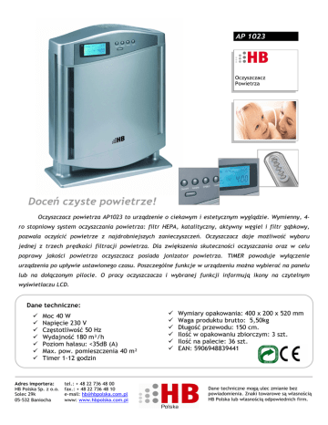 AP 1023 Oczyszczacz Powietrza Doceń czyste powietrze! Oczyszczacz powietrza AP1023 to urządzenie o ciekawym i estetycznym wyglądzie. Wymienny, 4ro stopniowy system oczyszczania powietrza: filtr HEPA, katalityczny, aktywny węgiel i filtr gąbkowy, pozwala oczyścić powietrze z najdrobniejszych zanieczyszczeń. Oczyszczacz daje moŜliwość wyboru jednej z trzech prędkości filtracji powietrza. Dla zwiększenia skuteczności oczyszczania oraz w celu poprawy jakości powietrza oczyszczacz posiada jonizator powietrza. TIMER powoduje wyłączenie urządzenia po upływie ustawionego czasu. Poszczególne funkcje w urządzeniu moŜna wybierać na panelu lub na dołączonym pilocie. O pracy oczyszczacza i wybranej funkcji informują ikony na czytelnym wyświetlaczu LCD. Dane techniczne: Moc 40 W Napięcie 230 V Częstotliwość 50 Hz Wydajność 180 m³/h Poziom hałasu: <35dB (A) Max. pow. pomieszczenia 40 m² Timer 1-12 godzin Adres importera: HB Polska Sp. z o.o. Solec 29k 05-532 Baniocha tel.: + 48 22 736 48 00 fax.: + 48 22 736 48 10 e-mail: [email protected] www: www.hbpolska.com.pl Wymiary opakowania: 400 x 200 x 520 mm Waga produktu brutto: 5,50kg Długość przewodu: 150 cm. Ilość w opakowaniu zbiorczym: 3 szt. Ilość na palecie: 36 szt. EAN: 5906948839441 Dane techniczne mogą ulec zmianie bez powiadomienia. Znaki towarowe są własnością HB Polska lub własnością odpowiednich firm.