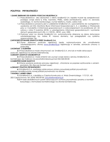 POLITYKA PRYWATNOŚCI 1.DANE ZBIERANE OD KLIENTA PODCZAS REJESTRACJI 1.1. Pożyczkobiorca aby skorzystać z oferty SmsBanQ S.A. będzie musiał się zarejestrować podając swoje dane tj. Imię, nazwisko, PESEL, adres zamieszkania, seria i nr. dowodu osobistego, nr. konta bankowego, numer telefonu, hasło, adres mail. 1.2. Pożyczkobiorca proszony jest o udzielenie SmsBanQ S.A. upoważnienia do wystąpienia i uzyskania od Info Monitora Biura Informacji Gospodarczej S. A. z siedzibą w Warszawie przy ul. Canaletta 4 informacji gospodarczych o zobowiązaniach na podstawie art. 24 ustawy z dnia 9 kwietnia 2010r. o udostępnianiu informacji gospodarczych i wymianie danych gospodarczych (Dz. U. Z 2010r., NR 81, poz. 530) 1.3. Podczas wizyt na stronie SmsBanQ S.A. automatycznie zbierane są dane dotyczące odwiedzającego np. Adres IP, nazwa domeny, typ przeglądarki czy systemu operacyjnego. Itp. 2.WYKORZYSTYWANIE DANYCH PRZEZ SmsBanQ S.A. 2.1. Dane zbierane podczas rejestracji będą wykorzystywane do umożliwienia odwiedzającemu stronę www.SmsBanQ.pl rejestrację w serwisie, zawarcie umowy o pożyczkę. 3.KONTAKT Z KLIENTEM 3.1.Pożyczkobiorca może otrzymywać od SmsBanQ S.A. sms lub e-maile dotyczące pożyczki, rejestracji na stronie internetowej. 4.ZMIANY DANYCH OSOBOWYCH 4.1.Pożyczkobiorca może zmienić lub usunąć swoje dane z serwisu SmsBanQ S.A. kontaktując się mailowo na [email protected] lub 034 343-00-00 5.ZABEZPIECZANIE DANYCH 5.1.Dane podane podczas procesu rejestracji , chronione sa poprzez szyfrowanie z użciem protokołu SSL (Secure Socket Layer) 6.ZMIANY POLITYKI PRYWATNOŚCI 6.1.SmsBanQ S.A. zastrzega sobie prawo zmiany powyższej polityki prywatności poprzez opublikowanie nowej polityki prywatności na stronie. 7.NAZWA I ADRES FIRMY 7.1.SmsBanQ S.A. z siedzibą w Częstochowie przy ul. Wały Dwernickiego 117/121, 42202 Częstochowa, tel. (034) 343-00-00, [email protected] 7.2.W razie dodatkowych pytań dotyczących ochrony prywatności prosimy o kontakt korzystając z formularza kontaktowego na stronie kontaktowej.