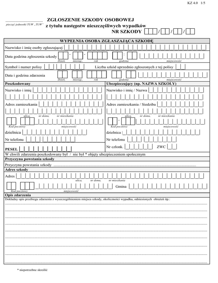 KZ 4.0 1/5 .................................. ZGŁOSZENIE SZKODY OSOBOWEJ pieczęć jednostki TUW „TUW” z tytułu następstw nieszczęśliwych wypadków NR SZKODY / / / WYPEŁNIA OSOBA ZGŁASZAJĄCA SZKODĘ Nazwisko i imię osoby zgłaszającej Data godzina zgłoszenia szkody |_|_|_|_|_|_|_|_|_|_|_|_|_|_|_|_|_|_|_|_|_|_|_|_|_|_|_|_|_|_|_| : |_|_|_|_|_|_|_|_|_|_|_|_|_|_| Dzień, Symbol i numer polisy miesiąc, |_|_| |_|_|_|_|_|_| rok godzina |_|_| |_|_|_|_|_|_|_|_|_|_|_|_|_|_|_| Liczba szkód uprzednio zgłoszonych z tej polisy Data i godzina zdarzenia Dzień, miesiąc, miejscowość rok Poszkodowany godzina miejscowość Ubezpieczający (np. NAZWA SZKOŁY) |_|_|_|_|_|_|_|_|_|_|_|_|_|_|_| Nazwisko i imię / Nazwa |_|_|_|_|_|_|_|_|_|_|_|_| |_|_|_|_|_|_|_|_|_|_|_|_|_|_|_|_|_|_|_|_|_| |_|_|_|_|_|_|_|_|_|_|_|_|_|_|_|_|_|_|_|_|_| Adres zamieszkania |_|_|_|_|_|_|_|_|_|_|_|_|_|_| Adres zamieszkania / Siedziba |_|_|_|_|_|_|_|_|_|_| |_|_|_|_|_|_|_|_|_|_|_|_|_|_|_|_|_|_|_|_|_| |_|_|_|_|_|_|_|_|_|_|_|_|_|_|_|_|_|_|_|_|_| Nazwisko i imię ulica, nr domu, nr mieszkania ulica, nr mieszkania _|_|_|_|_|_|_|_|_|_|_|_|_|_|_| - |_|_|_|_|_|_|_|_|_|_|_|_|_|_|_| miejscowość Kod pocztowy miejscowość Kod pocztowy dzielnica |_|_|_|_|_|_|_|_|_|_|_|_|_|_| Nr telefonu nr domu, _|_|_|_|_|_|_|_|_|_|_|_|_|_|_|_|_| Nr telefonu |_|_|_| |_|_|_|_|_|_|_| Nr członk. |_|_|_|_|_|_| ZWC |_|_| dzielnica | |_|_|_| |_|_|_|_|_|_|_| |_|_|_|_|_|_|_|_|_|_|_| PESEL W chwili zdarzenia poszkodowany był / nie był * objęty ubezpieczeniem społecznym Przyczyna powstania szkody Przyczyna powstania szkody ............................................................................................................................................. Adres szkody Adres |_|_|_|_|_|_|_|_|_|_|_|_|_|_|_|_|_|_|_|_|_|_|_|_|_|_|_|_|_|_|_|_|_|_|_|_|_|_|_|_|_| ulica, nr domu, nr mieszkania _|_|_|_|_|_|_|_|_|_|_|_|_|_|_|_|_| Kod pocztowy Gmina |_|_|_|_|_|_|_|_|_|_|_|_|_|_|_|_|_| miejscowość Opis zdarzenia Dokładny opis przebiegu zdarzenia z wyszczególnieniem miejsca szkody, okoliczności wypadku, odniesionych obrażeń itp.: ........................................................................................................................................................................................................ ........................................................................................................................................................................................................ ........................................................................................................................................................................................................ ........................................................................................................................................................................................................ ........................................................................................................................................................................................................ ........................................................................................................................................................................................................ ........................................................................................................................................................................................................ ........................................................................................................................................................................................................ ........................................................................................................................................................................................................ * niepotrzebne skreślić KZ 4.0 2/5 WYPEŁNIA OSOBA ZGŁASZAJĄCA SZKODĘ Roszczenie Roszczenie z tytułu szkody osobowej: 1. Z tytułu uszkodzenia ciała, rozstroju zdrowia Kwota roszczenia w zł .................................. 2. Z tytułu śmierci .................................. 3. ............................................................................................................................................. .................................. 4. ............................................................................................................................................. .................................. Łączna kwota roszczeń .................................. Czy są szkody rzeczowe ? TAK / NIE * Jeśli tak, jakie ? ................................................................................................ Zaistniałe zdarzenie zgłoszono następującym organom 1. Nazwa ............................................................................. 3. Nazwa ........................................................................... Adres / Siedziba ................................................................... Adres / Siedziba ................................................................. Miejscowość ........................................................................ Miejscowość ...................................................................... 2. Nazwa ............................................................................. 4. Nazwa ........................................................................... Adres / Siedziba ................................................................... Adres / Siedziba ................................................................. Miejscowość ........................................................................ Miejscowość ...................................................................... Świadkowie zdarzenia 1. Nazwisko i imię ......................................................... 2. Nazwisko i imię ...................