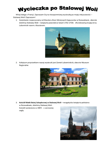 Witaj kolego z Francji. Zapraszam Cię na niezapomnianą wycieczkę po mojej miejscowości – Stalowej Woli! Zapraszam! 1. Zwiedzanie rozpoczynamy od Klasztoru Braci Mniejszych Kapucynów w Rozwadowie , obecnie dzielnicy Stalowej Woli – świątynia powstała w latach 1752-1754r. Ufundował ją książę Jerzy Lubomirski razem z klasztorem. 2. Kolejnym przystankiem naszej wycieczki jest Zamek Lubomirskich, obecnie Muzeum Regionalne 3. Kościół Matki Bożej Szkaplerznej w Stalowej Woli – neogotycka świątynia położona w Rozwadowie, dzielnicy Stalowej Woli. Kościół wzniesiono w 1907r. z czerwonej cegły. 4. Kolejną stacją jest Kościół Świętego Floriana w Stalowej Woli – drewniana świątynia z 1802 roku, przeniesiona w 1943 roku ze wsi Stany, obok drewniana dzwonnica z XIX wieku i ołtarz polowy. Do jego budowy użyto trzech rodzajów drewna: modrzewia, sosny stanowskiej i sosny pospolitej. Jeden z ciekawszych obiektów sakralnych w Polsce. Mieści się przy ulicy Floriaoskiej. 5. Huta Stalowa Wola – zakład przemysłu przetwórczego powstały w ramach Centralnego Okręgu Przemysłowego na północny zachód od miasta Nisko, w okolicach wsi Pławo – obecnie Stalowa Wola. 6. Na koniec naszej podróży zapraszam na poczęstunek do Hotelu Hutnik A teraz krótko o historii Stalowej Woli: Miasto powstało jako rezultat decyzji o zlokalizowaniu w pobliżu wsi Pławo między miasteczkami Nisko i Rozwadów w ramach budowy COP tzw. Zakładów Południowych. Pierwsze historyczne wzmianki na temat wsi Pławo, na terenie której powstało miasto, pochodzą z 1. połowy XV wieku. W pobliskim Przyszowie znajdował się dwór łowiecki króla Władysława Jagiełły, zbudowany przed 1358 rokiem przez Kazimierza Wielkiego. W koocu XV wieku Pławo było wsią królewską. Osiadła ludnośd trudniła się łowiectwem, wyrębem drzew, bartnictwem i uprawą roli. W czasie potopu szwedzkiego w roku 1656, widły Wisły i Sanu stały się miejscem bitwy wojsk hetmana Stefana Czarnieckiego z wojskami króla Karola Gustawa. W czasie I rozbioru Polski w 1772 r. królewska wieś Pławo weszła w skład kameralnego dominium Nisko, należącego do skarbu austriackiego. W latach 1837-1867dobra te stanowiły prywatną własnośd baronów Richenbachów. Następnie przeszły w ręce magnackiej rodziny Resseguier. Podczas I wojny światowej dobra zostały sprzedane obszarnikowi Maksymilianowi Franckemu. Przełomowym momentem dla mieszkaoców Pława było zatwierdzenie w 1937 roku planu Centralnego Okręgu Przemysłowego i budowa od 1938 roku Zakładów Południowych na terenach wsi. Głównym inicjatorem planu i autorem programu był ówczesny wicepremier i minister skarbu, budowniczy Gdyni, Eugeniusz Kwiatkowski. Przed wybuchem II wojny światowej powstała częśd zakładów oraz osiedla przyfabryczne nazwane Stalowa Wola. Nazwa miasta pochodzi od słów ówczesnego ministra spraw wojskowych, gen. Tadeusza Kasprzyckiego, który o planie budowy COP-u mówił, że jest to stalowa wola narodu polskiego wybicia się na nowoczesnośd[7]. W latach okupacji w osiedlu i hucie działał ruch oporu. Funkcjonowała tu Placówka AK "Stalowa Wola", "154" należąca do Obwodu AK Nisko. Za udział w konspiracji zginęło wielu mieszkaoców. Masowo wywożono tu więźniów z zamku w Rzeszowie na miejsca publicznych straceo, np. w Charzewicach w październiku 1943 r. rozstrzelano 20 osób. W sierpniu 1944 r. do Stalowej Woli wkroczyli Rosjanie i rozpoczęły się represje stosowane przez NKWD[8]. W dniu 1 kwietnia 1945 r. Stalowa Wola otrzymała prawa miejskie. W 1953 roku miasto zostało wydzielone jako odrębny powiat miejski. W 1973 przyłączono do niego Rozwadów, a w 1977 – Charzewice. W latach powojennych rozpoczął się dynamiczny rozwój miasta. Powstały nowe osiedla, ulice, budynki użyteczności publicznej, wiele zakładów przemysłowych i usługowych, szkoły podstawowe, średnie i wyższe, baza kulturalna i sportowa. Rozwój miasta był nierozerwalnie związany z Zakładami Południowymi, które w 1948 r. otrzymały nazwę Huty Stalowa Wola. Przez wiele lat huta była kombinatem obejmującym szereg zakładów, położonych również w innych miastach. Były to m.in.: Fabryka Maszyn w Radomsku, Fabryka Maszyn w Leżajsku, Fabryka Maszyn w Strzyżowie, Zakład Maszyn Budowlanych w Lubaczowie, Zakład Projektowania i Realizacji Inwestycji i Remontów Budowlanych w Stalowej Woli, Zakład ProjektowoTechnologiczny w Stalowej Woli, Odlewnia Żeliwa w Koluszkach. Kombinat zatrudniał w szczytowym okresie w zakładzie macierzystym i szeregu filii zamiejscowych około 35 tys. pracowników. Po zmianie ustroju polityczno-gospodarczego kraju dalsze istnienie i rozwój huty wymagały równoczesnego dokonania prywatyzacji, przeprowadzenia zmian organizacyjnych oraz utworzenia spółek z udziałem kapitału prywatnego. 15 lipca 1991 roku nastąpiło przekształcenie HSW Kombinatu Przemysłowego w HSW Spółkę Akcyjną. Huta Stalowa Wola SA specjalizuje się w produkcji i eksporcie maszyn budowlanych, maszyn do prac drogowych i ziemnych. Jest miejscem pracy dla kilku tysięcy mieszkaoców miasta i okolic. Drugim co do wielkości zakładem powstającym w Stalowej Woli w ramach Centralnego Okręgu Przemysłowego była Elektrownia Stalowa Wola. Początkowo elektrownia dostarczała energię elektryczną na potrzeby Huty, później w wyniku rozbudowy i modernizacji stała się podstawowym dostawcą energii cieplnej dla przemysłu i okolicznych miast. Przez wiele lat Elektrownia Stalowa Wola funkcjonowała w ramach Zakładów Energetycznych Okręgu Wschodniego jako tzw. Ozet od skrótu Okręgowy Zakład Energetyczny Tarnów, od 1989 roku stała się samodzielnym przedsiębiorstwem paostwowym, zaś od 1 października 1996 roku działa jako spółka akcyjna. W ciągu 60 lat Stalowa Wola z małego przyfabrycznego osiedla urosła do dużego miasta, dziś trzeciego pod względem ludności w województwie podkarpackim. Jes