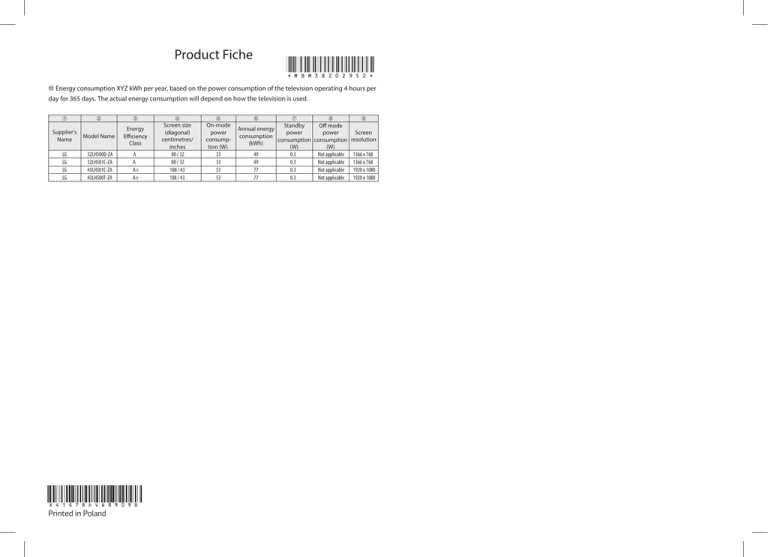 Product Fiche *MBM38202952* ➉ Energy consumption XYZ kWh per year, based on the power consumption of the television operating 4 hours per day for 365 days. The actual energy consumption will depend on how the television is used. ➀ ➁ Supplier’s Name Model Name LG LG LG LG 32LH500D-ZA 32LH501C-ZA 43LH501C-ZA 43LH500T-ZA ➂ Energy Class Printed in Poland A A A+ A+ ➃ Screen size (diagonal) centimetres/ inches 80 / 32 80 / 32 108 / 43 108 / 43 ➄ On-mode power consumption (W) 33 33 53 53 ➅ ➆ ➇ ➈ Standby Annual energy Screen power power consumption consumption consumption resolution (kWh) (W) (W) Not applicable 1366 x 768 49 0.3 Not applicable 1366 x 768 49 0.3 77 0.3 Not applicable 1920 x 1080 77 0.3 Not applicable 1920 x 1080 Language ➀ ➁ English Supplier's Name Model Name Netherlands Fabrikant Modelnaam Česky Název dodavatele Slovenčina ➃ ➄ ➅ ➆ Screen size (diagonal) centimetres/inches On mode power consumption(W) Annual energy consumption(kWh) Standby power consumption(W) Energieklasse Afmeting beeldscherm centimeters/inches Energieverbruik ingeschakeld(W) Jaarlijks energieverbruik(kWh) Energieverbruik standby(W) Energieverbruik uitgeschakeld(W) Název modelu Energetická třída učinnosti Velikost úhlopříčky Centimetry/Palce Spotřeba energie v režimu zapnuté TV(W) Roční spotřeba energie(kWh) Spotřeba energie v pohotovostním režimu(W) Spotřeba energie při vypnutí(W) Rozlišení obrazovky Spotřeba elektrické energie XYZ kWh za rok vycházející ze spotřeby elektrické energie televizního přijímače, který je v provozu 4 hodiny denně po dobu 365 dní. Skutečná spotřeba elektrické energie závisí na způsobu použití televizního přijímače.; Názov dodávateľa Názov modelu Trieda energetickej účinnosti Veľkosť obrazovky centimetrov/palcov Spotreba energie v režime zap(W) Ročná spotreba energie(kWh) Spotreba energie v pohotovostnom režime(W) Spotreba energie v režime vyp(W) Rozlíšenie obrazovky Spotřeba elektrické energie XYZ kWh za rok vycházející ze spotřeby elektrické energie televizního přijímače, který je v provozu 4 hodiny denně po dobu 365 dní. Skutečná spotřeba elektrické energie závisí na způsobu použití televizního přijímače.; Deutsch Hersteller Model Bilddiagonale Zentimeter/Zoll Leistungsaufname des Fernsehgerätes im EinZustand(W) Español Nombre de proveedor Nombre del modelo Energética tamaño de pantalla centímetros/pulgadas Consumo de Programa On Mode(W) Nom du fournisseur Référence du modèle énergétique Taille de l'écran centimètres/pouces Ελληνικά Όνομα προμηθευτή Ονομασία μοντέλου Κατηγορία Ενεργειακής Απόδοσης Μέγεθος Οθόνης Εκατοστά/Ίντσες Κατανάλωση ισχύος σε λειτουργία(W) Italiano Nome Fornitore Nome Modello Dimensione Schermo Centimetri/Pollici Consumo Acceso(W) Energetica Français ➂ ➇ Consumo anual de energía(kWh) Consommation électrique Consommation annuelle en mode marche(W) en marche(kWh) Consumo en Standby(W) Ετήσια κατανάλωση ενέργειας(kWh) Κατανάλωση ισχύος σε αναμονή(W) Κατανάλωση ισχύος απενεργοποίησης(W) Consumo Energetico Annuale(kWh) Consumo Standby(W) Consumo Spento(W) Risoluzione Schermo Consumo di energia XYZ kWh/anno calcolato sulla base del consumo di un televisore in funzione per 4 ore al Energiakulu sisselülitatud Energiakulu aastas(kWh) Energiakulu ooterežiimis(W) režiimis(W) Energiakulu väljalülitatud režiimis(W) Ekraani eraldusvõime Energiatarbimine XYZ kWh aastas, eeldusel et televiisor töötab neli tundi päevas ja 365 päeva aastas. Tegelik energiatarbimine oleneb televiisori kasutusviisist.; Enerģijas patēriņš izslēgtā stāvoklī(W) Latviešu Piegādātāja nosaukums Modeļa nosaukums Elektroenerģijas efektivitātes klase Ekrāna izmērs centimetri/collas Enerģijas patēriņš ieslēgtā stāvoklī(W) Enerģijas patēriņš gadā(kWh) Enerģijas patēriņš gaidstāves laikā(W) Lietuvių k. Tiekėjo pavadinimas Modelio pavadinimas Energijos naudojimo efektyvumo klasė Ekrano dydis centimetrai/(in) Energijos sąnaudos įjungus(W) Metinės energijos sąnaudos(kWh) energijos sąnaudos parengties energijos sąnaudos išjungus(W) būsenoje(W) Български Име на доставчик Име на модел Енергиен клас Размер на екрана сантиметра/инча Консумация при включен(W) Годишна консумация(kWh) Консумация при изчакване(W) Hrvatski Naziv dobavljača Naziv modela Energetski razred Veličina zaslona centimetara/inča Potrošnja energije u radu(W) Godišnja potrošnja energije(kWh) Magyar Szolgáltató neve Modell neve Energiahatékonysági osztály Kijelző mérete centiméter/inch Polski Nazwa dostawcy Model telewizora Klasa efektywności energetycznej Przekątna ekranu w centymetrach/w calach Pobór mocy (W) Energética Tamanho do Ecrã Centimetros/Polegadas Consumo em modo Ligado(W) Energetica Diagonala ecranului centimetri/inchi Nume Model Dansk Produkt navn Model name Suomi Toimittajan Nimi Mallinimi Norsk Produktnavn Modellnavn Skjermstørrelse centimeter/inch Svenska Produktnamn Modellnamn Skärmstorlek Centimeter/Tum Türkçe Üretici İsmi Energiatehokkuus luokka Consumo Energético XYZ kWh por año, basado en el consumo del televisor funcionando a 4 horas diarias, 365 días al año.EL consumo energético actual dependerá del modo de uso del TV. Consommation d'énergie en mode arrêt(W) Ekraani suurus sentimeetrid/tollid Producator Energieverbrauch XYZ kWh/Jahr, auf der Grundlage eines täglich vierstündigen Betriebs des Fernsehgeräts an 365 Tagen. Der tatsächliche Energieverbrauch hängt von der Art der Nutzung des Fernsehgerätes ab.; Consommation d'énergie en mode veille(W) Energiat