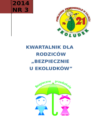 2014 NR 3 KWARTALNIK DLA RODZICÓW „BEZPIECZNIE U EKOLUDKÓW” KWARTALNIK DLA RODZICÓW „BEZPIECZNIE U EKOLUDKÓW” W marcu Raz śnieg pada, a raz deszczyk. Na jeziorze lód już trzeszczy. Błękit nieba lśni w kałuży, bałwan w słońcu oczy mruży. - Koniec zimy. Przerwa. Dzwonek. - To nie dzwonek, to skowronek! Drodzy rodzice! Oddajemy trzeci numer kwartalnika „Bezpieczne Przedszkole”, w którym chcemy informować o ważnych sprawach dotyczących zdrowia i bezpieczeństwa. Dzień Bezpiecznego Internetu Jak już Państwu wiadomo 10 lutego 2015 roku obchodziliśmy Dzień Bezpiecznego Internetu. Wszystkie działania podejmowane w ramach DBI realizowane były pod hasłem „Razem tworzymy lepszy Internet”. Wydarzenie to odbyło się w Kwartalnik dla Rodziców Publicznego Przedszkola nr 21 „Ekoludek” w Kaliszu Bezpieczne Przedszkole Strona 2 Polsce po raz jedenasty. W Polsce Dzień Bezpiecznego Internetu od 2005 roku organizowany jest przez Fundację Dzieci Niczyje oraz Naukową i Akademicką Sieć Komputerową (NASK) – realizatorów unijnego programu Safer Internet. Głównym partnerem wydarzenia jest Fundacja Orange. Partnerami byli w tym roku także Microsoft i Facebook. Wydarzenie zostało objęte honorowym patronatem przez Joannę Kluzik-Rostkowską, Minister Edukacji Narodowej, prof. Lenę Kolarską-Bobińską, Minister Nauki i Szkolnictwa Wyższego, Andrzeja Halickiego, Ministra Administracji i Cyfryzacji, Magdalenę Gaj, Prezes Urzędu Komunikacji Elektronicznej, Marka Michalaka, Rzecznika Praw Dziecka. Hasło tegorocznych obchodów „Razem tworzymy lepszy Internet” (“Let’s create a better Internet together”) zwracało uwagę na to, że każdy internauta może przyczynić się do tego, że Internet będzie miejscem bezpiecznym i pozytywnym. Każdy z nas ponosi odpowiedzialność za to, co robi w Sieci i w jaki sposób z niej korzysta. Zwracano uwagę na potencjał sieci oraz różne możliwości jej zastosowania - w edukacji, w kontaktach z rówieśnikami, a także jako formę twórczej rozrywki. A oto kilka rad dla Rodziców: Gdy dziecko wkracza w wirtualny świat Pamiętajcie o kilku podstawowych faktach: • Zalety Internetu znaczenie przeważają jego wady • Ciekawość dziecka jest rzeczą naturalną Kwartalnik dla Rodziców Publicznego Przedszkola nr 21 „Ekoludek” w Kaliszu Bezpieczne Przedszkole Strona 3 • Anonimowość w Sieci jest tylko pozorna • Internet jest dobry, źli bywają jedynie ludzie, którzy go używają. Rodzice nie muszą w każdej chwili kontrolować, w jakim zakątku Internetu przebywa ich dziecko. Wystarczy, że razem z nim stworzą zestaw dobrych praktyk korzystania z Sieci. Początkiem kształtowania pozytywnych nawyków może być zawarcie umowy z dzieckiem o bezpiecznym użytkowaniu Internetu. Kojarzy się poważnie, ale tak naprawdę jest to skuteczna, wychowawczai nieszablonowa metoda uwrażliwienia dziecka na właściwe korzystanie z Sieci. Przykładowe wzory umów 10 Porad dla rodziców Dotyczących bezpiecznego korzystania z Internetu przez dzieci 1. Odkrywaj Internet razem z dzieckiem. Bądź pierwszą osobą, która zapozna dziecko z Internetem. Odkrywajcie wspólnie jego zasoby. Spróbujcie znaleźć strony, które mogą zainteresować Wasze pociechy, a następnie zróbcie listę przyjaznych im stron (pomocny będzie edukacyjny serwis internetowy www.sieciaki.pl Jeśli Wasze dziecko sprawniej niż Wy porusza się po Sieci, nie zrażajcie się - poproście, by było Waszym przewodnikiem po wirtualnym świecie. 2. Naucz dziecko podstawowych zasad bezpieczeństwa w Internecie. Uczul dziecko na niebezpieczeństwazwiązane z nawiązywaniem nowych znajomości w Internecie. Podkreśl, że nie można ufać osobom poznanym w Sieci, ani też wierzyć we wszystko co o sobie mówią. Ostrzeż dziecko przed ludźmi, którzy mogą chcieć zrobić im krzywdę. Rozmawiaj z dzieckiem o zagrożeniach czyhających w Internecie i sposobach ich unikania. 3. Rozmawiaj z dziećmi o ryzyku umawiania się na spotkania z osobami poznanymi w Sieci. Dorośli powinni zrozumieć, że dzięki Internetowi dzieci mogą nawiązywać przyjaźnie. Jednakże spotykanie się z nieznajomymi poznanymi w Sieci może okazać się bardzo niebezpieczne. Dzieci muszą mieć świadomość,że mogą spotykać się z nieznajomymi wyłącznie po uzyskanej zgodzie rodziców i zawsze w towarzystwie dorosłych lub przyjaciół. Kwartalnik dla Rodziców Publicznego Przedszkola nr 21 „Ekoludek” w Kaliszu Bezpieczne Przedszkole Strona 4 4. Naucz swoje dziecko ostrożności przy podawaniu swoich prywatnych danych. Dostęp do wielu stron internetowych przeznaczonych dla najmłodszych wymaga podania prywatnych danych. Ważne jest, aby dziecko wiedziało, że podając takie informacje, zawsze musi zapytać o zgodę swoich rodziców. Dziecko powinno zdawać sobie sprawę z niebezpieczeństw, jakie może przynieść podanie swoich danych osobowych. Ustal z nim, żeby nigdy nie podawało przypadkowym osobom swojego imienia, nazwiska, adresu i numeru telefonu. 5. Naucz dziecko krytycznego podejścia do informacji przeczytanych w Sieci. Wiele dzieci używa Internetu w celu rozwinięcia swoich zainteresowań i rozszerzenia wiedzy potrzebnej w szkole. Mali internauci powinni być jednak świadomi, że nie wszystkie znalezione w Sieci informacje są wiarygodne. Naucz dziecko, że trzeba weryfikować znalezione w Internecie treści, korzystając z innych dostępnych źródeł (encyklopedie, książki, słowniki). 6. Bądź wyrozumiały dla swojego dziecka. Często zdarza się, że dzieci przypadkowo znajdują się na stronach adresowanych do dorosłych. Bywa, że w obawie przed karą, boją się do tego przyznać. Ważne jest, żeby dziecko Ci ufało i mówiło o tego typu sytuacjach; by wiedziało, że zawsze kiedy poczuje się niezręcznie coś je zawstydzi lub przestraszy, może się do Ciebie zwrócić. 7. Zgłaszaj nielegalne i szkodliwe treści. Wszyscy musimy 