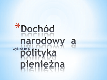 * Wykład nr 6 1. 2. 3. 4. 5. 6. Składniki popytu globalnego. Funkcja konsumpcji i krzywa skłonności do konsumpcji. Funkcja oszczędności , a wydatki konsumpcyjne. Krańcowa skłonność do konsumpcji i krańcowa skłonność do oszczędzania. Mnożnik inwestycyjny. Paradoks zapobiegliwości. WSTKiT mgr Wojciech Bugajski 2 Produkcja potencjalna – wielkość produkcji , którą można osiągnąć wykorzystując w danym czasie wszystkie dostępne środki produkcyjne ( założenie stricte teoretyczne). WSTKiT mgr Wojciech Bugajski 3 Popyt globalny – zapotrzebowanie na dobra i usługi w całej gospodarce narodowej. Popyt globalny – suma wydatków w całej gospodarce narodowej na dobra konsumpcyjne i inwestycyjne. WSTKiT mgr Wojciech Bugajski 4 ∆ D = C + I + G + Ex netto C – popyt konsumpcyjny I – popyt inwestycyjny przedsiębiorstw G – popyt państwa Ex netto = Export - Import WSTKiT mgr Wojciech Bugajski 5 Założenia: Płace i ceny = const.(stałe) Produkcja – określa ją popyt W modelu tym brak : państwa , wymiany z zagranicą , amortyzacji. Dochód narodowy (DN) = PNB = Dochody Rozporządzalne (DR) WSTKiT mgr Wojciech Bugajski 6 Wydatki 120 80 E C 40 ∆ D = C+ I B 40 dochód 80 120 WSTKiT mgr Wojciech Bugajski Produkcja , 7 Przy stałych cenach i płacach – krótkookresowa równowaga na rynku dóbr (E) istnieje wtedy gdy, ∆ D lub planowane wydatki = faktycznie wytworzonej produkcji. WSTKiT mgr Wojciech Bugajski 8 Dochód do dyspozycji ( D/D) = dochód po opodatkowaniu. Lp. D/D W/C 1 2 3000 4000 3110 4000 3 5000 4850 4 6000 5600 5 7000 6240 mgr Wojciech Bugajski KSK (4000 – 3110) / 1000 = 890/1000= 0,89 (4850 - 4000) /1000 = 850 /1000 = 0,85 ( 5600 – 4850) / 1000 = 750/1000= 0,75 ( 6240 – 5650) / 1000 = 640/1000= 0,64 WSTKiT 9 W/C 4000 3110 D/D B C KSK A 3000 4000 WSTKiT mgr Wojciech Bugajski 10 Im wyższy dochód , tym na konsumpcję wydaje się mniej (zgodnie z Prawem Engla) . B = punkt równowagi WSTKiT mgr Wojciech Bugajski 11 Definicja funkcji konsumpcji (C) – funkcja ukazująca poziom całkowitej zamierzonej konsumpcji przy każdym poziomie dochodów rozporządzalnych D/D. C = A + KSK Y Y – poziom dochodu bieżącego A – autonomiczny popyt konsumpcji WSTKiT mgr Wojciech Bugajski 12 Autonomiczny popyt konsumpcji (A) = wielkość popytu , która nie jest związana z dochodem bieżącym (Y). WSTKiT mgr Wojciech Bugajski 13 Współczynnik KSK – pokazuje ile przeznacza się na konsumpcję z dodatkowej jednostki dochodu. Im wyższy dochód , tym mniejszy współczynnik KSK. Jeżeli mniej się wydaje na konsumpcję , tym więcej się oszczędza. WSTKiT mgr Wojciech Bugajski 14 C C=A+KSKY B C A A Y WSTKiT mgr Wojciech Bugajski 15 BC = ∆ C AC = ∆ Y ∆ C / ∆ Y = KSK WSTKiT mgr Wojciech Bugajski 16 ∆D=C+I Inwestycje = środki , które prowadzą do powiększenia zdolności produkcyjnych. Inwestycje – środki służące powiększaniu majątku WSTKiT mgr Wojciech Bugajski 17 Inwestycje Autonomiczne Pobudzone Autonomiczne – niezależne od dochodu bieżącego WSTKiT mgr Wojciech Bugajski 18 Warunki i wymagania dotyczące konkurencji. 2. Nisza rynkowa. 3. Nowe technologie wytwarzania. 4. Prognozy zmian koniunktury gospodarczej. 1. WSTKiT mgr Wojciech Bugajski 19 Y Inwestycje autonomiczne D WSTKiT mgr Wojciech Bugajski 20 1. 2. Akcje. Pożyczki i oszczędności (źródła pierwotne). WSTKiT mgr Wojciech Bugajski 21 Oszczędności – część nie skonsumowanego dochodu WSTKiT mgr Wojciech Bugajski 22 1. 2. Ekonomiczne – część przyszłej konsumpcji. Psychologiczne – w naturze człowieka jest aby oszczędzać. WSTKiT mgr Wojciech Bugajski 23 Y = - A (1 – KSK ) Y Y=C+O O = Y – C = A + ( 1 – KSK ) Y O = - A + KSO Y Gdzie: O – oszczędności KSO – Krańcowa Skłonność do Oszczędności WSTKiT mgr Wojciech Bugajski 24 O O = - A + KSO Y Y WSTKiT mgr Wojciech Bugajski 25 Jest to liczba, która mówi nam ile razy wzrośnie lub zmaleje dochód wywołany impulsem, który uruchomił w gospodarce mechanizm mnożnikowy . WSTKiT mgr Wojciech Bugajski 26 Występowanie gospodarki rynkowej Muszą występować wolne czynniki produkcyjne Muszą występować nie wykorzystane moce wytwórcze Musi występować pełne zatrudnienie WSTKiT mgr Wojciech Bugajski 27 Zmiany w inwestycjach autonomicznych. 2. Zmiany w wydatkach państwa na dobra i usługi. 3. Zmiany wielkości Exportu netto (Ex netto). 1. WSTKiT mgr Wojciech Bugajski 28