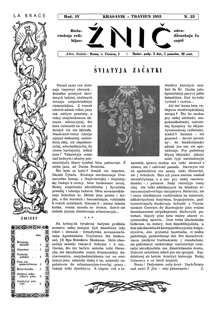 LA B RAC E A & Hod. IV Bielarnskaja relihijna- KRASAVIK - TRAVIEN 1953 ZMIČ Adres Redakc : Roma, v. Corsica, 1 SVIATYJA &^J Pierad nami voś dziünaje impresyi abrazok: žmierika prostych skromnych ludziej, atulenych čornaju nieprahladnaju ciemradździu. Z tvaraü ichnich adnak vidno, jany t a k niečym praniaty, u takoj znajchodziacca ekstazie adoracyjnaj, što heta ciemradź na ich nia dziejeć ich nia hłynuła. Naadvarot-tvary ichnija zijajuć mahutnaj usabiešniaj siłaj, ich napaüniajučaj, aduchaülajučaj, dy ciesna hurtujučaj. Adkul jana ? Vahnistyja znaki nad kožnym i ahulny pramianiejučy ühary symbal heta pakazvaje. Ź nieba jana, ad Ducha Śviatoha. Što heta za ludzi ł Znaješ ich napeüna, Darahi Čytaču. Śviataja* natchnionaja Dvanaccatka hetaja, z Najśviaciejšaj i Najmilejšaj Dušoju ü centry, heta fundamant novaj, Božaj, suspolnaści adrodžnaha j žyvučaha praüdaj i luboüju ludztva. Heta novanarodžanaja Subožnia śv. Hetak jana prosta i ścipła, a dla mnohich i bieznadziejna, vyhladała ü svaich začatkach. Siannia-ž - niama takoha kutka, niama narodu na śviecie, dzie-b nie siahała jejnaja zbaülennaja arhanizacyja... ZMIEST fl^a^tłiiw^ Na hetkaj-ža tytułovaj bačynie prošłaha nomieru našaj časopisi byü źmieščany inšy tekst i abrazok : fotozdymka novanaznačanaha Apostalskaha Vizytatara dla biełarusaü, J E Bpa Bolesłava Słoskansa. Heta abaznačaje začatki takoje-ž Subožni i ü nas.. Darma, što my bačym samoha tolki Herarcha, nie akružanaha svajoj dvanaccatkaj duchavienstva, znajchodziačahasia tut na emiliracyijano, zaüsiody dušoj ź im, zaüsiody napahatovie da arhanizacyjna-tvorčaj pracy ; čakaje tolki dyrektyvy. A ciapier voś u at- |l N . 23 adradzenskaja ča sopiś Hadav. padp. 3 dal., 1 paasobn. 30 cent. ZACATKl masfery haračych molbaü da Śv. Ducha jaho apostalskija paryvy jašče üzmahlisia. Dać imtolki vychad i razhon... Ale mo' kamu heta vydajecca nieździajśnialnaj mrojaj ? Što bo možna pry našaj ubohaści, niapoünaüładnaści, suśvietnaj dyaspory dy idejnavyznanniavaj raźbitaści, zrabić ? Sumniü - tre pryznać - davoli pavažn y ; da biaździejnaści adnak jon nas nie upavažniaje. Pry padobnaj ščyraj idejnaści, jakuju mieli tyja natchnionyja apostały, spravu možna nia tolki skranuć z ' miesca, ale i raźvivać pamału. Havorym tut ab apostalśćvie nie samaj tolki Herarchii, ale j śvieckich. Biez ich praca siannia naahuł niemahčymaja, a u nas pry našaj rasciarušanaści - i * pahatoü. Našy vieručyja masy chaj nia tolki adklikajucca na üsiakuju arhanizacyjnatvorčuju inicyjatyvu Herarchii, ale i samy ažyülajucca ruchlivaściu na miascoch, adšukvajučysia üzajemna, hrupujučysia, padtrymoüvajučy duchovuju łučnaść z Vizytatarskim Centram dy šturmujučy jaho svaimi damahanniami zaspakajennia duchovych patrebaü, dajučy praz heta realny abarot vizytatarskaj spravie... Dzie treba [duchoünika 'biełarusa, na miescy, dzie dajaždžajučaha, a dzie jakohaniebudź karespandencyjnaha dušpastyrstva, abo prynamś hazetnaha, ci niešta padobnaje, pasiaredniaje ihd. Nie źnieachvočvacca pieršymi trudnaściami j niaudačami, nie pałochacca zaskiemłaje maroziačaje ciemradzi akružajučaha nas źbiantežanaha śvietu. Dobrym začatkam nikoli jon nia spryjaü. Najdabitniej ab hetym śvietčyć historyja Božaj Ustanovy u va üsich krajoch. Braty ! Padymiem vočy üvyś : Duch Śviaty nad nami Ź Jim - usip pakanajem! Z. ŹNIC 2 N. 23 CHRYSTUS (praciah) Što dumali ab Chryście Apostały? Kali chočam raspaznać čałavieka, jaki źyü pierad sotniami hadoü, musim šukać śvietkaü, jakija ü t y m samym časie z im razam źyli, im cikavilisia, bačyli jaho j słuchali. Praciüniki Chryścijanstva časta ćviardziać, što Apostały j vucni Chrystovyja uvaźali Jaho adno za vialikaha Praroka, a tolki paśla biskupy j vučonyja Subožni z paboźnaj naiünstściu pradstaülali Jaho jak Syna Boźaha. Ale, kab mahČy tak ćviardzić, treba byłob chiba adkinuć Evanelii. Dyk štoź kaźuć Apostały 3 vučni Chrystovy japra Jahonuju Asobu ? Kalib chacieć usie fśviadoctvy Evanelistaü ab Asobie Chrysta tut zacytavać, dyk tre byłob blizu cełyja čatyry Evaneliji śpisać; vybieram t u t tolki niekatoryja. Evanelist Marak pačynaje svaju Evaneliju słovami: « Pačatak Evanelii Jezusa Chrysta Syna Boźaha» i raskazvaje dalej ab t y m hołasie z nieba, jaki pakazaü Chrysta : «Ty jošć moj Syn najmilejšy, jakoha spadabaü sabie » / Mk 1, 11 / Apostał Jan piša na pačatku svaje Evaneliji: « Napačatku było Słova - i Boham było Słova - a Słova stałasia Ciełam i źyło miź nami» ; i dalej piša : « My paznali dy üvieryli, što Ty jość Chrystus, Syn Boźy » / Jan 6, 76 /. Matavuš Marak i ł^ukaš raskazvajuć : «Vučyciel spytaü Apostałaü : za kaho majuć ludzi Syna Čałaviečaha ? Jany adkazali: «Adny üvažajuć Ciabie za Jana, druhija za Ilju, abo ürešcie za adnaho z prarokaü» ; tady spyt a ü Jon : « A vy što skaźacie, chto.. ja ? » Symon Piotr uračysta vyznaü : « Ty jość Chrystus Syn Boha žyvoha » ; i dalej raskazvajecca, jak Zbaviciel henaje vyznannie uračysta paćviardziü / Mat. 16, 16 / Kali Piotr chadziü pa voziary z Chrystom, maliü tady Jaho, kaźučy : «Ty sapraüdy Syn Boźy / Mar. 14, 33 / Sv. Apostał Pavał piša : « Chrystus jość Boham vysokaüzlublenym nad usim navieki » / Rom. 9, 5 / « U Im žyvie üsia üciełaülonaja ščodraść Bostva » / Kol. 2, 9/. « Pierad Imieniem Jezus chaj zhinajecca koźnaje kalena ü niebie, na ziamli j pad ziamloju» / Fil. 2, 10 / Tamaš Sv, nie chacieü vieryć u zhrobuüstannie Chrysta, i kali Jon sam skazaü ułaźyć palec u ranu jahonu, kryčma pryznaü t a d y : « Zbaviciel moj i Boh moj 1 » / Jan. 20, 28 /. Raskazvajecca ü Evanelijach, što mnohija pierad Chrystom nicpadali j malilisia da Jaho, što azdaraülalisia ad chvarobaü jahonym Imiam, što rymski vajenny staršy