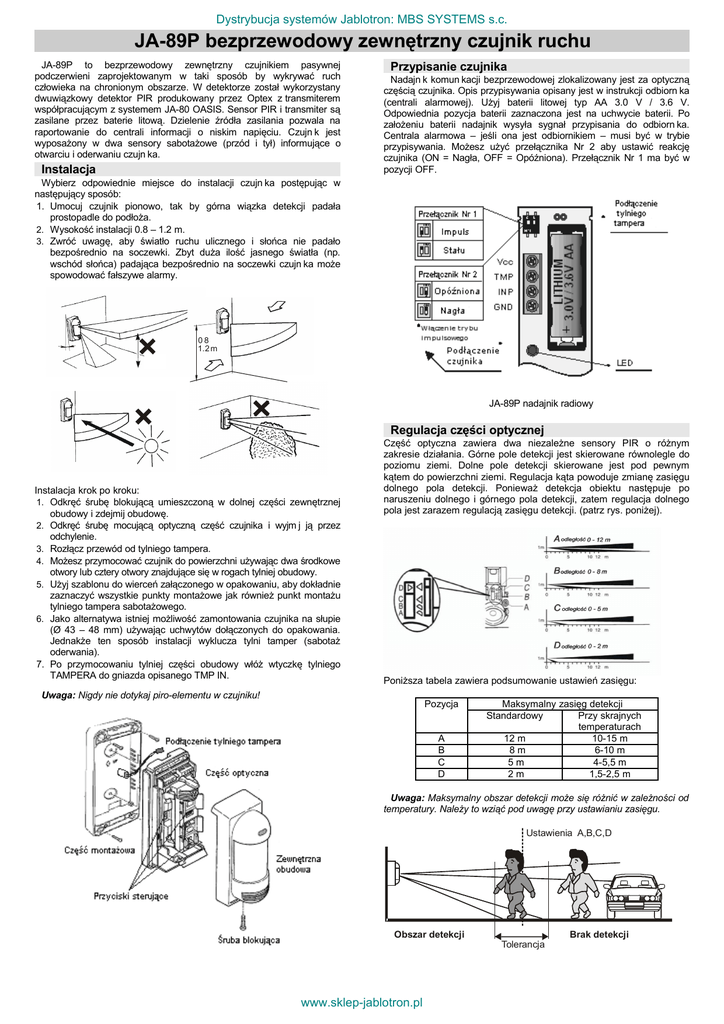 Dystrybucja systemów Jablotron: MBS SYSTEMS s.c. JA-89P bezprzewodowy zewnętrzny czujnik ruchu JA-89P to bezprzewodowy zewnętrzny czujnikiem pasywnej podczerwieni zaprojektowanym w taki sposób by wykrywać ruch człowieka na chronionym obszarze. W detektorze został wykorzystany dwuwiązkowy detektor PIR produkowany przez Optex z transmiterem współpracującym z systemem JA-80 OASIS. Sensor PIR i transmiter są zasilane przez baterie litową. Dzielenie źródła zasilania pozwala na raportowanie do centrali informacji o niskim napięciu. Czujn k jest wyposażony w dwa sensory sabotażowe (przód i tył) informujące o otwarciu i oderwaniu czujn ka. Instalacja Przypisanie czujnika Nadajn k komun kacji bezprzewodowej zlokalizowany jest za optyczną częścią czujnika. Opis przypisywania opisany jest w instrukcji odbiorn ka (centrali alarmowej). Użyj baterii litowej typ AA 3.0 V / 3.6 V. Odpowiednia pozycja baterii zaznaczona jest na uchwycie baterii. Po założeniu baterii nadajnik wysyła sygnał przypisania do odbiorn ka. Centrala alarmowa – jeśli ona jest odbiornikiem – musi być w trybie przypisywania. Możesz użyć przełącznika Nr 2 aby ustawić reakcję czujnika (ON = Nagła, OFF = Opóźniona). Przełącznik Nr 1 ma być w pozycji OFF. Wybierz odpowiednie miejsce do instalacji czujn ka postępując w następujący sposób: 1. Umocuj czujnik pionowo, tak by górna wiązka detekcji padała prostopadle do podłoża. 2. Wysokość instalacji 0.8 – 1.2 m. 3. Zwróć uwagę, aby światło ruchu ulicznego i słońca nie padało bezpośrednio na soczewki. Zbyt duża ilość jasnego światła (np. wschód słońca) padająca bezpośrednio na soczewki czujn ka może spowodować fałszywe alarmy. 08 1.2 m JA-89P nadajnik radiowy Regulacja części optycznej Instalacja krok po kroku: 1. Odkręć śrubę blokującą umieszczoną w dolnej części zewnętrznej obudowy i zdejmij obudowę. 2. Odkręć śrubę mocującą optyczną część czujnika i wyjm j ją przez odchylenie. 3. Rozłącz przewód od tylniego tampera. 4. Możesz przymocować czujnik do powierzchni używając dwa środkowe otwory lub cztery otwory znajdujące się w rogach tylniej obudowy. 5. Użyj szablonu do wierceń załączonego w opakowaniu, aby dokładnie zaznaczyć wszystkie punkty montażowe jak również punkt montażu tylniego tampera sabotażowego. 6. Jako alternatywa istniej możliwość zamontowania czujnika na słupie (Ø 43 – 48 mm) używając uchwytów dołączonych do opakowania. Jednakże ten sposób instalacji wyklucza tylni tamper (sabotaż oderwania). 7. Po przymocowaniu tylniej części obudowy włóż wtyczkę tylniego TAMPERA do gniazda opisanego TMP IN. Część optyczna zawiera dwa niezależne sensory PIR o różnym zakresie działania. Górne pole detekcji jest skierowane równolegle do poziomu ziemi. Dolne pole detekcji skierowane jest pod pewnym kątem do powierzchni ziemi. Regulacja kąta powoduje zmianę zasięgu dolnego pola detekcji. Ponieważ detekcja obiektu następuje po naruszeniu dolnego i górnego pola detekcji, zatem regulacja dolnego pola jest zarazem regulacją zasięgu detekcji. (patrz rys. poniżej). Poniższa tabela zawiera podsumowanie ustawień zasięgu: Uwaga: Nigdy nie dotykaj piro-elementu w czujniku! Pozycja A B C D Maksymalny zasięg detekcji Standardowy Przy skrajnych temperaturach 12 m 10-15 m 8m 6-10 m 5m 4-5,5 m 2m 1,5-2,5 m Uwaga: Maksymalny obszar detekcji może się różnić w zależności od temperatury. Należy to wziąć pod uwagę przy ustawianiu zasięgu. Ustawienia A,B,C,D Obszar detekcji www.sklep-jablotron.pl Tolerancja Brak detekcji Dystrybucja systemów Jablotron: MBS SYSTEMS s.c. Rozwiązywanie problemów Kąt widzenia wynosi 90o. Obracając zespół czujników można ustawić kąt w zakresie 180o ze skokiem co 15o. Problem Czujn k wzbudza fałszywe alarmy 45 45 Prawdopodobna przyczyna Dolne pole detekcji jest niepotrzebnie zbyt wydłużone Czujnik narażony jest na ostre wiązki jasnego światła (reflektor, wschód słońca, ruch uliczny, itp.). 90 Maskowanie pola widzenia – aby czujnik nie reagował na światła ruchu ulicznego lub odbicie światła podczas wschodu słońca, możliwe jest zamaskowanie pewnej części obszaru detekcji poprzez zastosowanie pasków dołączonych do zestawu. W obszarze detekcji znajduje się ruchomy przedmiot (sznur z praniem, gałęzie itp.). Obszar detekcji jest nieprawidłowo ustawiony. Od czasu do Czułość jest ustawiona za czasu brak nisko (L). detekcji Czujnik jest w trybie ruchu uśpienia. Słaba bateria. Dioda LED nie świeci. W czujniku możliwe jest ustawienie trzech poziomów czułości za pomocą przełącznika znajdującego się poniżej: Czujn k nie reaguje na ruch L – niska M – średnia H – wysoka Dioda LED świeci, ale nie ma żadnej reakcji w centrali alarmowej. Pozostałe parametry można ustawić posługując się przełącznikami: Sposób rozwiązania problemu Ustaw odpowiedni obszar detekcji. Przenieś reflektor, zamaskuj powierzchnie wystawioną na działanie światła lub zmień pozycje czujn ka. Usuń ruchomy obiekt z pola detekcji lub zmień pozycję czujnika Ustaw odpowiedni obszar detekcji Zmień czułość na średnią (M) lub wysoką (H). Dla przetestowania ustaw czas uśpienia czujnika na 5 sekund. Wymień baterię. Włącz przełącznikiem diodę LED. Centrala jest poza zasięgiem, sprawdź baterię, spróbuj zmienić lokalizację czujnika lub centrali. : 80 123 dioda LED wyłącz 120 s 4x 1 08 dioda LED włącz 5 s czas uśpienia czujnika 2x pobudzenie czujnika 1 98 Dioda LED jest używana w czasie testowania czujnika. W normalnym trybie pracy zaleca się jej wyłączenie (oszczędność baterii). W zależności od ustawienia czasu uśpienia czujnika 5/120s, po wykryciu ruchu zostanie on zablokowany na okres 5 lub 120s. W zależności od ustawienia przełącznika ilości wzbudzeń detektora, czujnik wyśle sygnał alarmowy po 2- lub 4-krotnym przecięciu obydwu pól de