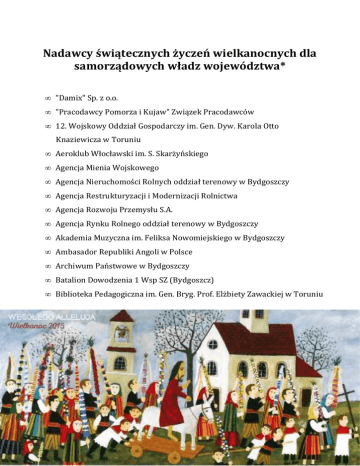 Nadawcy świątecznych życzeń wielkanocnych dla samorządowych władz województwa* • "Damix" Sp. z o.o. • "Pracodawcy Pomorza i Kujaw" Związek Pracodawców • 12. Wojskowy Oddział Gospodarczy im. Gen. Dyw. Karola Otto Knaziewicza w Toruniu • Aeroklub Włocławski im. S. Skarżyńskiego • Agencja Mienia Wojskowego • Agencja Nieruchomości Rolnych oddział terenowy w Bydgoszczy • Agencja Restrukturyzacji i Modernizacji Rolnictwa • Agencja Rozwoju Przemysłu S.A. • Agencja Rynku Rolnego oddział terenowy w Bydgoszczy • Akademia Muzyczna im. Feliksa Nowomiejskiego w Bydgoszczy • Ambasador Republiki Angoli w Polsce • Archiwum Państwowe w Bydgoszczy • Batalion Dowodzenia 1 Wsp SZ (Bydgoszcz) • Biblioteka Pedagogiczna im. Gen. Bryg. Prof. Elżbiety Zawackiej w Toruniu • Biskup Bydgoski Jan Tyrawa • Biskup Płocki Piotr Libera • Biskup Toruński Andrzej Suski • Biskup Włocławski Wiesław Alojzy Mering • Biuro Posła do Parlamentu Europejskiego Krzysztofa Hetmana (Lublin) • Burmistrz Ciechocinka • Burmistrz Miasta i Gminy Piotrków Trybunalski • Burmistrz Miasta Kowalewo Pomorskie • Bydgoska Izba Lekarska • Centrum Doktryn i Szkolenia Sił Zbrojnych w Bydgoszczy • Centrum Kształcenia Zawodowego i Ustawicznego • Centrum Kultury Dwór Artusa • Centrum Rozwoju Zasobów Ludzkich • Centrum Szkolenia Artylerii i Uzbrojenia w Toruniu • Centrum Wspierania Inicjatyw dla Życia i Rodziny w Warszawie • Cereal Partners Poland Toruń-Pacific • Diecezjalny Ośrodek Adopcyjno-Opiekuńczy w Toruniu • Dom Pomocy Społecznej dla Dzieci i Młodzieży w Kamieniu Krajeńskim • Dom Pomocy Społecznej w Piotrkowie Trybunalskim • Dom Pomocy Społecznej w Suchorączku • Dom Pomocy Społecznej we Włocławku • Dowódca 22. Ośrodka Dowodzenia i Naprowadzania płk dypl. pil. Arkadiusz Poluszyński • Dyrektor Aresztu Śledczego w Toruniu • Dyrektor Domu Pomocy Społecznej ks. Kazimierz Poręba (Izbica Kujawska) • Dyrektor Izby Celnej w Toruniu • Dyrektor Szpitala Wielospecjalistycznego w Inowrocławiu • Dziekan Inspektoratu Wsparcia Sił Zbrojnych ks. płk. Zenon Surma • Dziekan Wydziału Prawa i Administracji UMK w Toruniu Tomasz Justyński • East Poland House Dom Polski Wschodniej • Ekonom Diecezji Bydgoskiej ks. Przemysław Książek • Ekspozytura Służby Kontrwywiadu Wojskowego w Bydgoszczy • Firma "Gotowski" Budownictwo Komunikacyjne i Przemysłowe Sp. z o.o. • Fondazione Vaticana Joseph Ratzinger Benedetto XVI – Centrum Studiów Ratzingera w Bydgoszczy • Fundacja „Wiatrak” oraz Duszpasterstwo Akademickie „Martyria” • Fundacja Ducha na Rzecz Rehabilitacji Naturalnej Ludzi Niepełnosprawnych w Toruniu • Fundacja Nowe Pokolenie • Fundacja Przyjaciół Planetarium • Fundacja Społeczno Charytatywna „Pomoc Rodzinie i Ziemi” w Toruniu • Gimnazjum nr 21 Tony`ego Halika w Toruniu • Gimnazjum nr. 24 w Bydgoszczy • Główny Urząd Statystyczny w Bydgoszczy • Gmina Czernikowo • Gmina Inowrocław • Gmina Miasto Wąbrzeźno • Gmina Wielgie • Gminny Ośrodek Kultury w Unisławiu • Gminny Ośrodek Pomocy Społecznej w Łubiance • Gostyńsko-Włocławski Park Krajobrazowy w Kowalu • Grudziądzkie Poręczenie Kredytowe Sp. Z o.o. • Grupa Nowy Szpital Sp. z o.o w Szczecinie • Inspekcja Weterynaryjna – Wojewódzki Inspektorat Weterynarii w Bydgoszczy • Instytut Pamięci Narodowej Komisja Ścigania Zbrodni przeciwko Narodowi Polskiemu • Izba Skarbowa w Bydgoszczy • Joint Force Training Centre Commander w Bydgoszczy • Kancelaria Prezydenta RP Jaromir Sokołowski Podsekretarz Stanu • Kancelaria Prezydenta RP Krzysztof Hubert Łaszkiewicz Sekretarz Stanu • Kancelaria Prezydenta Rzeczpospolitej Polskiej • Katedra Międzynarodowych Stosunków Politycznych UMK • Kaufmann Sp. Z.o.o. • Kierownik oraz Społeczność Środowiskowego Domu Samopomocy w Kruszwicy • Klinika Uzdrowiskowa "Pod Tężniami" im. Jana Pawła II w Ciechocinku • Kolegium Jagiellońskie. Toruńska Szkoła Wyższa • Komenda Garnizonu Bydgoszcz • Komenda Główna Straży Pożarnej w Warszawie • Komenda Wojewódzka Państwowej Straży Pożarnej w Toruniu • Komenda Wojewódzka Policji w Bydgoszczy • Komendant Główny Policji • Komendant Straży Miejskiej w Toruniu • Komendant Wojewódzkiej Policji we Wrocławiu • Komisja Międzyzakładowa Pracowników Oświaty i Wychowania NSZZ "Solidarność" (Toruń) • Konsulat Honorowy Czarnogóry • Krajowe Stowarzyszenie Wspierania Przedsiębiorczości • Ks. Prałat Marek Rumiński • Kujawska Spółdzielnia Mleczarska we Włocławku • Kujawsko-Pomorska Izba Rolnicza z/s w Przysieku Biuro we Włocławku • Kujawsko-Pomorska Izba Rzemiosła i Przedsiębiorczości w Bydgoszczy • Kujawsko-Pomorska Sieć Informacyjna Sp. z o.o. • Kujawsko-Pomorska Szkoła Wyższa w Bydgoszczy • Kujawsko-Pomorski Ośrodek Adopcyjny w Toruniu • Kujawsko-Pomorski Transport Samochodowy SA • Kujawsko-Pomorski Urząd Wojewódzki w Bydgoszczy • Kujawsko-Pomorski Urząd Wojewódzki w Bydgoszczy • Kujawsko-Pomorski Urząd Wojewódzki w Bydgoszczy; Wojewódzka Inspekcja Geodezyjna i Kartograficzna • Kujawsko-Pomorski Zarząd Melioracji i Urządzeń Wodnych we Włocławku • Kujawsko-Pomorskie Centrum Edukacji Nauczycieli we Włocławku • Kujawsko-Pomorskie Inwestycje Medyczne • Kujawsko-Pomorskie Zrzeszenie Handlu i Usług w Bydgoszczy • Kuria Metropolitalna w Gnieźnie • Kwiaciarnia "Orchidea" w Rypinie • Marszałek Województwa Łódzkiego • Matbud Kujawy Trans Sp. z o.o. (Pakość) • Medyczno-Społeczne Centrum Kształcenia Zawodowego i Ustawicznego w Inowrocławiu • Medyczno-Społeczne Centrum Kształcenia Zawodowego i Ustawicznego w Toruniu • Miasto i Gmina Skępe • Miejski Ośrodek Edukacji i Profilaktyki Uzależnień w Toruniu • Miejsko-Gminny Ośrodek Kultury Sportu i Rekreacji w Gniewkowie • Miejsko-Gminny Ośrodek Kultury w