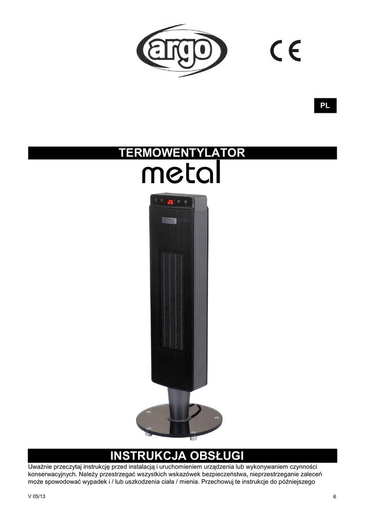 PL TERMOWENTYLATOR INSTRUKCJA OBSŁUGI Uważnie przeczytaj instrukcję przed instalacją i uruchomieniem urządzenia lub wykonywaniem czynności konserwacyjnych. Należy przestrzegać wszystkich wskazówek bezpieczeństwa, nieprzestrzeganie zaleceń może spowodować wypadek i / lub uszkodzenia ciała / mienia. Przechowuj te instrukcje do późniejszego wykorzystania. V 05/13 6 INFORMACJE DOTYCZĄCE BEZPIECZEŃŚTWA • Używaj urządzenia wyłącznie wg poniższej instrukcji. Każde inne zastosowanie nie zalecane przez producenta może spowodować pożar, porażenie prądem elektrycznym lub zranienia osób. • Upewnij się, że zasilanie sieciowe jest zgodne z napięciem podanym na tabliczce danych (230V ~ / 50Hz). • Produkt nie jest zabawką. Dzieci powinny być odpowiednio nadzorowane, aby nie bawiły się urządzeniem. • To urządzenie nie jest przeznaczone do użytku przez osoby (w tym dzieci) o ograniczonej sprawności fizycznej, sensorycznej lub psychicznej, lub bez odpowiedniego doświadczenia i wiedzy, chyba że są one odpowiednio nadzorowane podczas korzystania z tego urządzenia przez osobę odpowiedzialną za ich bezpieczeństwo. • Nie przykrywać urządzenia lub ograniczać wlotu i wylotu powietrza, aby zapobiec przegrzaniu. • Upewnij się, że wszystkie obiekty są co najmniej 1 metr od przodu i boków urządzenia. • Odłączyć zasilanie sieciowe, gdy urządzenie nie jest używane lub podczas konserwacji. • Unikaj używania termowentylatora w warunkach zapylenia lub w obecności łatwopalnych oparów (np. w warsztatach lub garażach, opary farby) • Nie wolno używać urządzenia do suszenia odzieży. • Używaj urządzenia w dobrze wentylowanym pomieszczeniu. • Nie wkładaj palców lub przedmiotów do wlotu / wylotu powietrza, gdyż może to doprowadzić do porażenia prądem lub pożaru lub uszkodzić urządzenie. Aby uniknąć ryzyka pożaru, nie należy zakrywać kratek lub manipulować nimi w jakikolwiek sposób podczas pracy urządzenia. • Nie należy używać urządzenia, jeśli kabel lub wtyczka są uszkodzone. Jeśli przewód zasilający jest uszkodzony, musi zostać wymieniony przez producenta, sprzedawcę lub wykwalifikowaną osobę w celu uniknięcia zagrożenia bezpieczeństwa. • Nie uruchamiaj urządzenia, jeśli spadło z wysokości lub poniosło szkodę w inny sposób. Skontaktuj się z wykwalifikowanym personelem technicznym do zbadania urządzenia. Nie wykonuj żadnych napraw elektrycznych i mechanicznych samodzielnie. • Najczęstszą przyczyną przegrzania jest zgromadzenie się pyłu w urządzeniu. Usuwaj kurz regularnie. Odłącz urządzenie i wyczyść wloty i wyloty powietrza i kratki przy pomocy odkurzacza. • Nie należy używać silnych detergentów do czyszczenia tego urządzenia. Czyścić urządzenia przy pomocy wilgotnej (ale nie mokrej) ściereczki wypłukanej w gorącej wodzie z mydłem. Zawsze wyjąć wtyczkę z gniazdka przed czyszczeniem. • Aby odłączyć termowentylator, przesuń przełącznik na OFF i wyjmij wtyczkę z gniazdka. Ciągnij za wtyczkę. Nie należy ciągnąć za przewód przy odłączaniu wentylatora. • Nie wolno umieszczać żadnych przedmiotów na przewodzie i nie wyginać ich. ` • Nie zaleca się używania przedłużaczy, ponieważ może się on przegrzać i spowodować ryzyko pożaru. Nie należy używać jednego przedłużacza do podłączenia wielu urządzeń. • Nie należy zanurzać przewodu, wtyczki lub jakiegokolwiek innego elementu urządzenia w wodzie lub innych cieczach. • Nie wolno dotykać wtyczki mokrymi rękami. • Nie należy umieszczać termowentylatora nad lub w pobliżu innego źródła ciepła. UWAGA ! UNIKAJ ZAKRYWANIA URZĄDZENIA CELEM UNIKNIĘCIA RYZYKA PRZEGRZANIA Mówi o tym również poniższy symbol: • Urządzenie może spowodować pożar, jeżeli, w czasie pracy, jest objęty lub styka się z materiałami palnymi (zasłony, firany, koce) itp. Przechowywać termowentylator Z DALA OD TYCH MATERIAŁÓW. • Nie należy podłączać urządzenia do źródła zasilania, zanim nie zostało ono prawidłowo zmontowane i ustawione. • Urządzenie nagrzewa się nieznacznie w czasie użytkowania. Aby uniknąć oparzeń, nie dotykaj powierzchni !!! • Nie należy układać kabla pod dywanami. Nie zakrywać przewodu kocami, dywanami lub podobnymi materiałami. Umieść przewód z dala od ruchliwych miejsc lub tam, gdzie może być przypadkowo pociągnięty. • Nie wolno używać grzałki wentylatora w bliskim sąsiedztwie wanny, prysznica, umywalki. • Nie ustawiaj grzejnika wentylatora poniżej gniazda zasilającego. • Nie używać urządzenia na zewnątrz. OSTRZEŻENIE: nie używać termowentylator z kontrolerem lub innym zewnętrznym urządzeniem który uruchamia urządzenie automatycznie, gdyż może spowodować pożar, szczególnie kiedy urządzenie jest przykryte w/w materiałami lub niewłaściwie ustawione. • Po pierwszym uruchomieniu, urządzenie może wydzielać lekki, nieszkodliwy zapach. Zapach ten jest efektem wstępnego podgrzewania wewnętrznych elementów grzejnych, i nie powtarza się później. OSTRZEŻENIE: PRZYCISK ON / OFF, nie jest jedynym środkiem odłączenia zasilania. Podczas serwisowania lub przesuwania GRZEJNIK, Zawsze wyłączaj kabel z gniazdka. ` INSTRUKCJA MONTAŻU Otwórz opakowanie i wyciągnij 3 części, urządzenie, podstawę i pilota zdalnego sterowania. 1. Umieść urządzenie w podstawie i dokręć śrubę mocującą Urządzenie Element łączący Podstawa 2. Przed włączeniem ustaw urządzenie na płaskiej i stabilnej powierzchni OPIS URZĄDZENIA 1. Panel kontrolny 2. Wyświetlacz 3. Kratka wylotu powietrza 4.Podstawa 5. Wlot powietrza 6. Przycisk WŁĄCZ / WYŁĄCZ PRZÓD BOK TYŁ JAK UŻYWAĆ URZĄDZENIA? Ustaw urządzenie na płaskiej i stabilnej powierzchni Podłącz przewód do gniazdka sieciowego (220-240V~/50Hz). Przycisk WŁ / WYŁ (ON/OFF) (z tyłu urządzenia poniżej kratki wlotowej) Przełącz do pozycji “