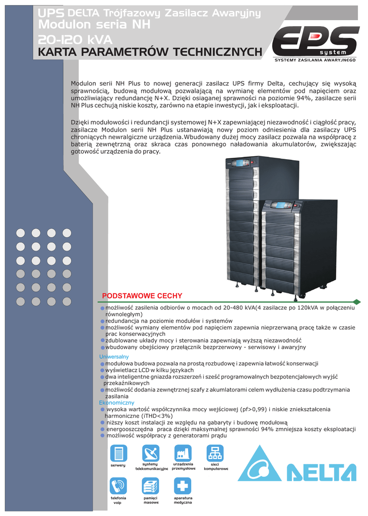 UPS DELTA Trójfazowy Zasilacz Awaryjny Modulon seria NH 20-120 kVA KARTA PARAMETRÓW TECHNICZNYCH Modulon serii NH Plus to nowej generacji zasilacz UPS firmy Delta, cechuj¹cy siê wysok¹ sprawnoœci¹, budow¹ modu³ow¹ pozwalaj¹c¹ na wymianê elementów pod napiêciem oraz umo¿liwiaj¹cy redundancjê N+X. Dziêki osiaganej sprawnoœci na poziomie 94%, zasilacze serii NH Plus cechuj¹ niskie koszty, zarówno na etapie inwestycji, jak i eksploatacji. Dziêki modu³owoœci i redundancji systemowej N+X zapewniaj¹cej niezawodnoœæ i ci¹g³oœæ pracy, zasilacze Modulon serii NH Plus ustanawiaj¹ nowy poziom odniesienia dla zasilaczy UPS chroni¹cych newralgiczne urz¹dzenia.Wbudowany du¿ej mocy zasilacz pozwala na wspó³pracê z bateri¹ zewnêtrzn¹ oraz skraca czas ponownego na³adowania akumulatorów, zwiêkszaj¹c gotowoœæ urz¹dzenia do pracy. PODSTAWOWE CECHY mo¿liwoœæ zasilenia odbiorów o mocach od 20-480 kVA(4 zasilacze po 120kVA w po³¹czeniu równoleg³ym) redundancja na poziomie modu³ów i systemów mo¿liwoœæ wymiany elementów pod napiêciem zapewnia nieprzerwan¹ pracê tak¿e w czasie prac konserwacyjnych zdublowane uk³ady mocy i sterowania zapewniaj¹ wy¿sz¹ niezawodnoœæ wbudowany obejœciowy prze³¹cznik bezprzerwowy - serwisowy i awaryjny Uniwersalny modu³owa budowa pozwala na prost¹ rozbudowê i zapewnia ³atwoœæ konserwacji wyœwietlacz LCD w kilku jêzykach dwa inteligentne gniazda rozszerzeñ i szeœæ programowalnych bezpotencja³owych wyjœæ przekaŸnikowych mo¿liwoœæ dodania zewnêtrznej szafy z akumlatorami celem wyd³u¿enia czasu podtrzymania zasilania Ekonomiczny wysoka wartoœæ wspó³czynnika mocy wejœciowej (pf>0,99) i niskie zniekszta³cenia harmoniczne (iTHD<3%) ni¿szy koszt instalacji ze wzglêdu na gabaryty i budowê modu³ow¹ energooszczêdna praca dziêki maksymalnej sprawnoœci 94% zmniejsza koszty eksploatacji mo¿liwoœæ wspó³pracy z generatorami pr¹du serwery systemy telekomunikacyjne urz¹dzenia przemys³owe telefonia voip pamiêci masowe aparatura medyczna sieci komputerowe UPS Modulon seria NH 20-120 kVA Dane techniczne Model ul. Harcerska 16 32-540 Trzebinia tel. +48 32 623 66 88, fax. +48 32 623 69 53 [email protected] www.epssystem.pl NHP20 NHP40 NHP60 NHP80 NHP100 NHP120 UPS (moc w KVA) 20 40 60 80 100 120 Moc znamionowa - kW 16 32 48 64 80 96 Napiêcie znamionowe Wejœcia 380/220,400/230,415/240 V pr. zm. (3 fazy,4-¿y³y+uziemienie ochronne) Zakres napiêciowy 208~477 V pr.zm. (miêdzyfazowo)/120~276V pr.zm.(jednofazowe) Wspó³czynnik mocy Wejœcia >0,99 Czêstotliwoœæ wejœciowa -Hz 50 lub 60Hz (+-5Hz) Zniekszta³cenia harmoniczne Napiêcia Wyjœciowego <3% (obci¹¿enie liniowe) Stabilizacja napiêcia wyjœciowego +1% Czêstotliwoœæ wyjœciowa -Hz 50 lub 60Hz Stabilizacja czêstotliwoœci Przeci¹¿alnoœæ Interfejs +-0,05Hz (przy oscylatorze wewnêtrznym) +-5Hz(przy synchronizacji,regulowana skokowo co 0,1Hz) 125%:10minut; Standart Urz¹dzenia standartowe do zarz¹dzania 150%:1minuta RS 232 X 1,gniazdo SNMP X 2, bezpotencja³owe wyjœcia przekaŸnikowex6, bezpotencja³owe wejœcia przekaŸnikowex2,pomiar temp.szafy akumulatorów x 4,sygnalizacja stanu szafy akumulatorów x 1, port równoleg³y x 2,REPO x 1 karta SNMP,karta Modbus,karta sterowania we/wy przekaŸnikowymi,Enviro Probe,SNMP+koncentrator 5-portowy,czujnik temperatury szafy akumulatorów,przewód do czujnika stanu szafy Normy Bezpieczeñstwo EMC CE, EN62040-1-1;CISPR 22 Class A Sprawnoœæ AC-AC 94% Tryb ECO Zakres temperatur pracy 97% Wilgotnoœæ wzglêdna 90%(bez kondensacji) Ha³as w paœmie akustycznym w odl. 1 metra 65dBA Pozosta³e cechy Wymiary Masa (Kg) 0~40C 68dBA 70dBA 70dBA 72dBA Redundancja przez zrównoleglenie i mo¿liwoœci rozbudowy Redundancja na poziomie modu³ów i systemów; Maksymalne 4 zasilacze równoleg³e zapewniaj¹ce moc 480kVA Wy³¹cznik po¿arowy zasilania Lokalny i zdalny Dziennik zdarzeñ w pamiêci SRAM 500 wpisów 73dBA 520x975x1695 520x910x1165 UPS szafka 520x910x1165 akumulatorów (26Ahx40szt.) 520x975x1695 (40Ahx40szt.) 170 200 230 260 320 350
