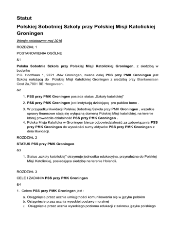 Statut Polskiej Sobotniej Szkoły przy Polskiej Misji Katolickiej Groningen Wersja ostateczna: maj 2016 ROZDZIAŁ 1 POSTANOWIENIA OGÓLNE &1 Polska Sobotnia Szkoła przy Polskiej Misji Katolickiej Groningen, z siedzibą w budynku P.C. Hooftlaan 1, 9721 JMw Groningen, zwana dalej PSS przy PMK Groningen jest Szkołą należącą do Polskiej Misji Katolickiej Groningen z siedzibą przy Blankenslaan Oost 2a,7901 BE Hoogeveen. &2 1. PSS przy PMK Groningen posiada status „Szkoły katolickiej" 2. PSS przy PMK Groningen jest instytucją działającą pro publico bono . 3. W przypadku likwidacji Polskiej Sobotniej Szkoła przy PMK Groningen , wszelkie sprawy finansowe stają się wyłączną domeną Polskiej Misji katolickiej, na terenie której prowadziła działalność PSS przy PMK Groningen . 4. Polska Misja Katolicka w Groningen bierze odpowiedzialność za zobowiązania PSS przy PMK Groningen do wysokości sumy aktywów PSS przy PMK Groningen z dnia likwidacji. ROZDZIAŁ 2 STATUS PSS przy PMK Groningen &3 1. Status „szkoły katolickiej" otrzymuje jednostka edukacyjna, przynależna do Polskiej Misji Katolickiej, posiadająca siedzibę na terenie Holandii. ROZDZIAŁ 3 CELE I ZADANIA PSS przy PMK Groningen &4 1. Celem PSS przy PMK Groningen jest : a. Osiągnięcie przez ucznia umiejętności komunikowania się w języku polskim b. Osiągnięcie przez ucznia wysokiej postawy moralnej c. Osiągnięcie przez ucznia wysokiego poziomu edukacji z zakresu języka polskiego d. Budowanie pomostu pomiędzy rodakami w Polsce i innych krajach Europy e. Integracja polskiego społeczeństwa na emigracji f. Promowanie katolickiego modelu wychowania oraz katolickich wartości poprzez nauczanie religii g. Rozwijanie u uczniów wartości patriotycznych h. Zapoznawanie dzieci z kulturą polską i dziedzictwem kulturowym Polski 2. Cele, o których mowa w ust. 1 osiągane są przez: a. przekazywanie uczniom wiedzy w oparciu o jak najwyższe standardy nauczania oraz przy użyciu skutecznych i sprawdzonych technik nauczania b. zachęcanie uczniów do prezentowania pozytywnych cech charakteru, zwłaszcza poprzez edukację, udział w projektach społecznych i edukacyjnych, organizowanych przez PSS przy PMK Groningen c. zachęcanie uczniów do nawiązywania pozytywnych relacji międzyludzkich, w szczególności poprzez aktywne uczestnictwo w życiu i działalności PSS przy PMK Groningen oraz integrację ze społecznością lokalną d. rozwijanie w młodzieży poczucia odpowiedzialności i okazywania wrażliwości na sprawy społeczne e. naukę szacunku dla przekonań i kultur innych społeczności f. promocję języka i historii Polski g. naukę religii katolickiej h. organizowanie lokalnych, krajowych i międzynarodowych projektów z udziałem uczniów, ich rodziców/opiekunów oraz innych osób.ROZDZIAŁ 4 ORGANIZACJA EDUKACYJNA PSS przy PMK §5 PSS przy PMK prowadzi swoja działalność edukacyjną i wychowawczą w oparciu o program zatwierdzony przez Zarząd Szkoły. Program ten uwzględniając wartości katolickie i patriotyczne powinien w szczególności obejmować następujące przedmioty: język polski, historia Polski, geografia Polski i katecheza. §6 1. Nadrzędną ideą szkoły jest dobro ucznia . 2. Szkoła ma być miejscem bezpiecznym dla dzieci, dlatego każdy nauczyciel powinien posiadać odpowiednie kwalifikacje merytoryczne, moralne. 3. Działalność dydaktycznowychowawcza szkoły oraz działalność organizacji wspomagających prace regulują następujące dokumenty: Regulamin PSS /załącznik nr 1/; Siedzibą PSS przy PMK Groningen może być szkoła lub inne pomieszczenie dostosowane do prowadzenia zajęć edukacyjnych. ROZDZIAŁ 5 ORGANY PSS przy PMK Groningen I ich zadania §7 Organami PSS przy PMK Groningen są: ● Zarząd PSS przy PMK Groningen ; ● Rada Pedagogiczna ; ● Rada Rodziców. §8 1. Zarząd PSS przy PMK Groningen jest organem wykonawczym Szkoły . 2. W skład Zarządu PSS przy PMK Groningen wchodzą: a. Przewodniczący -Proboszcz Polskiej Misji Katolickiej w Groningen, na terenie której powołana jest szkoła b. Dyrektor PSS przy PMK Groningen c. Sekretarz - Przedstawiciel rodziców 3. Zarząd zarządza wewnętrznymi sprawami Szkoły. W szczególności, Zarząd: a. opiniuje i dokonuje zmian statutu Szkoły ; b. kontroluje funkcjonowanie Szkoły poprzez zatwierdzenie kalendarza roku szkolnego, c. organizuje wynajem pomieszczeń dydaktycznych d. opiniuje skład kadry dydaktycznej Szkoły, e. uchwala limit przyjęć do Szkoły na dany rok szkolny, f. dokonuje okresowej kontroli poziomu nauczania w Szkole , g. uchwala opłaty pobierane za naukę w Szkole, h. bierze odpowiedzialność za sprawdzanie nauczycieli oraz asystentów nauczycieli , i. podejmuje inicjatywy służące rozwojowi Szkoły, a także dobru dzieci, 4.Przewodniczący PSS przy PMK Groningen sprawuje funkcję reprezentacyjną. Reprezentuje Szkołę w kontaktach zewnętrznych i sprawuje piecze nad bieżącą działalnością Szkoły we współpracy z Zarządem Szkoły, Gronem Pedagogicznym i Radą Rodziców. Do zadań Przewodniczącego PSS przy PMK Groningen należy: a. reprezentowanie Szkoły na spotkaniach w środowisku Polonii b. nawiązywanie relacji partnerskich z polskimi i holenderskimi organizacjami zewnętrznymi, partnerami oraz mediami c. poszukiwanie możliwości uzyskania dotacji lub pozyskania sponsorów d. uczestnictwo w spotkaniach Zarządu e. poszukiwanie innowacyjnych rozwiązań dla rozwoju szkoły f. współuczestnictwo w przygotowywaniu materiałów promocyjno - marketingowych szkoły g. współuczestnictwo w promocji Szkoły na terenie Polskiej Misji Katolickiej Groningen h. Kontrolowanie finansów szkoły oraz zdawanie relacji Zarządowi z sytuacji finansowej szkoły. 5. Dyrektor PSS przy PMK Groningen koordynuje funkcje dydaktyczne oraz sprawuje pieczę nad organizacją . Do zadań Dyrektora PSS przy PMK Groningen należy: a. reprezentowanie Szkoły na spotkaniach w środowisku Polonii b. n