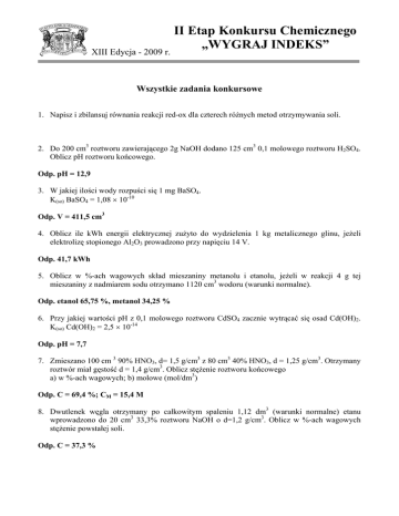 XIII Edycja - 2009 r. II Etap Konkursu Chemicznego „WYGRAJ INDEKS” Wszystkie zadania konkursowe 1. Napisz i zbilansuj równania reakcji red-ox dla czterech różnych metod otrzymywania soli. 2. Do 200 cm3 roztworu zawierającego 2g NaOH dodano 125 cm3 0,1 molowego roztworu H2SO4. Oblicz pH roztworu końcowego. Odp. pH = 12,9 3. W jakiej ilości wody rozpuści się 1 mg BaSO4. K(so) BaSO4 = 1,08 10-10 Odp. V = 411,5 cm3 4. Oblicz ile kWh energii elektrycznej zużyto do wydzielenia 1 kg metalicznego glinu, jeżeli elektrolizę stopionego Al2O3 prowadzono przy napięciu 14 V. Odp. 41,7 kWh 5. Oblicz w %-ach wagowych skład mieszaniny metanolu i etanolu, jeżeli w reakcji 4 g tej mieszaniny z nadmiarem sodu otrzymano 1120 cm3 wodoru (warunki normalne). Odp. etanol 65,75 %, metanol 34,25 % 6. Przy jakiej wartości pH z 0,1 molowego roztworu CdSO4 zacznie wytrącać się osad Cd(OH)2. K(so) Cd(OH)2 = 2,5 10-14 Odp. pH = 7,7 7. Zmieszano 100 cm 3 90% HNO3, d= 1,5 g/cm3 z 80 cm3 40% HNO3, d = 1,25 g/cm3. Otrzymany roztwór miał gęstość d = 1,4 g/cm3. Oblicz stężenie roztworu końcowego a) w %-ach wagowych; b) molowe (mol/dm3) Odp. C = 69,4 %; CM = 15,4 M 8. Dwutlenek węgla otrzymany po całkowitym spaleniu 1,12 dm3 (warunki normalne) etanu wprowadzono do 20 cm3 33,3% roztworu NaOH o d=1,2 g/cm3. Oblicz w %-ach wagowych stężenie powstałej soli. Odp. C = 37,3 % 9. Do reaktora wprowadzono równe objętości CO2 i CH4. 10% objętości metanu rozpadło się z utworzeniem sadzy i wodoru, a reszta przereagowała tworząc tlenek węgla(II) i wodór. Oblicz w %-ach objętościowych skład mieszaniny gazów po reakcji. Odp. H2 – 51,28 %, CO – 46,15 %, CO2 – 2,56 % 10. Działając nadmiarem kwasu na równomolową mieszaninę węglików wapnia i glinu otrzymano 8,96 dm3 (warunki normalne) produktów gazowych reakcji. Oblicz wyjściową masę mieszaniny węglików. Odp. m = 20,8 g 11. Stechiometryczną mieszaninę azotu i wodoru przepuszczono przez aparat kontaktowy do syntezy amoniaku, w wyniku czego przereagowało 30% użytego do rekcji azotu. Oblicz w % obj. Skład mieszaniny gazów po wyjściu z aparatu kontaktowego. Odp. H2 – 61,76 %, N2 – 20,59 %, NH3 – 17,65% 12. Oblicz ile jonów wodorowych zawiera 1 cm3 chemicznie czystej wody w temperaturze pokojowej. Odp. N = 6 1013 jonów 13. Jaką objętość metanalu (warunki normalne) należy rozpuścić w wodzie, aby otrzymać 1 dm3 formaliny (36% roztwór o gęstości 1,1 g/cm3)? Odp. V = 295,7 dm3 14. Jaką objętość etanolu (stężenie 96,5%, gęstość 0,8 g/cm3) można otrzymać w wyniku fermentacji alkoholowej 1 kg glukozy, która przebiega z wydajnością 80% ? Odp. V = 529,6 cm3 15. Źródłem azotu wypełniającego poduszkę powietrzną w samochodzie jest detonacyjny rozkład NaN3 do pierwiastków. Oblicz masę tego związku potrzebną do napełnienia poduszki o obj. 60 dm3 do ciśnienia 1,15 atm., w temperaturze 25C. Odp. m = 122,3 g