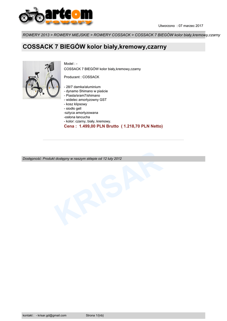 Utworzono : 07 marzec 2017 ROWERY 2013 > ROWERY MIEJSKIE > ROWERY COSSACK > COSSACK 7 BIEGÓW kolor biały,kremowy,czarny COSSACK 7 BIEGÓW kolor biały,kremowy,czarny Model : COSSACK 7 BIEGÓW kolor biały,kremowy,czarny Producent : COSSACK - 28/7 damka/aluminium - dynamo Shimano w piaście - Piasta/sram7/shimano - widelec amortyzowny GST - kosz klipsowy - siodło gell -sztyca amortyzowana -osłona łancucha - kolor: czarny, biały, kremowy. Cena : 1.499,00 PLN Brutto ( 1.218,70 PLN Netto) R A Dostępność: Produkt dostępny w naszym sklepie od 12 luty 2012 K kontakt : - [email protected] S I R Strona 1/{nb}