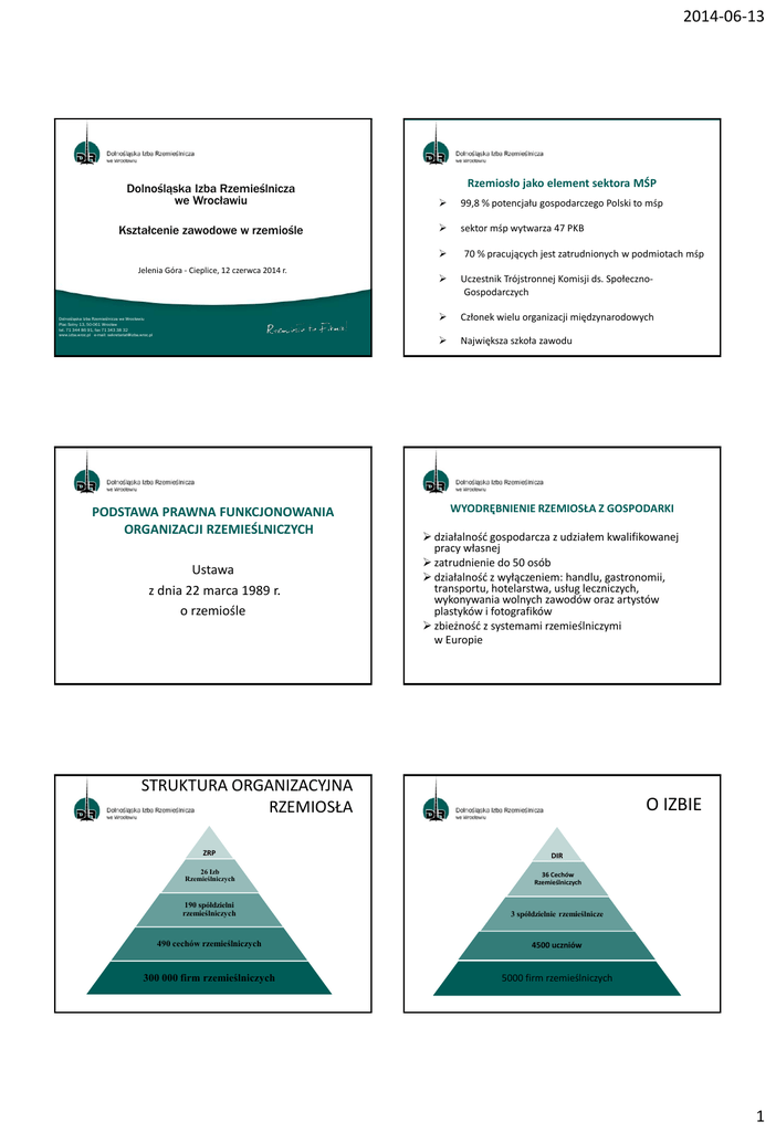 2014-06-13 Rzemiosło jako element sektora MŚP Dolnośląska Izba Rzemieślnicza we Wrocławiu 99,8 % potencjału gospodarczego Polski to mśp Kształcenie zawodowe w rzemiośle sektor mśp wytwarza 47 PKB Jelenia Góra - Cieplice, 12 czerwca 2014 r. Dolnośląska Izba Rzemieślnicza we Wrocławiu Plac Solny 13, 50-061 Wrocław tel. 71 344 86 91, fax 71 343 38 32 www.izba.wroc.pl e-mail: [email protected] PODSTAWA PRAWNA FUNKCJONOWANIA ORGANIZACJI RZEMIEŚLNICZYCH Ustawa z dnia 22 marca 1989 r. o rzemiośle 70 % pracujących jest zatrudnionych w podmiotach mśp Uczestnik Trójstronnej Komisji ds. SpołecznoGospodarczych Członek wielu organizacji międzynarodowych Największa szkoła zawodu WYODRĘBNIENIE RZEMIOSŁA Z GOSPODARKI działalność gospodarcza z udziałem kwalifikowanej pracy własnej zatrudnienie do 50 osób działalność z wyłączeniem: handlu, gastronomii, transportu, hotelarstwa, usług leczniczych, wykonywania wolnych zawodów oraz artystów plastyków i fotografików zbieżność z systemami rzemieślniczymi w Europie STRUKTURA ORGANIZACYJNA RZEMIOSŁA O IZBIE ZRP DIR 26 Izb Rzemieślniczych 36 Cechów Rzemieślniczych 190 spółdzielni rzemieślniczych 3 spółdzielnie rzemieślnicze 490 cechów rzemieślniczych 4500 uczniów 300 000 firm rzemieślniczych 5000 firm rzemieślniczych 1 2014-06-13 Rzemieślnicza rodzina • Uczy zawodu • projekty wymian zawodowych, 80 uczniów na praktykach w Niemczech od 2011 r. • Nadaje tytuły czeladnika i mistrza • Wspiera przedsiębiorczość • projekty wymiany doświadczeń dla przedsiębiorców z obu państw: „Energooszczędne budownictwo w rzemiośle – saksońsko-dolnośląska wymiana doświadczeń” • Reprezentuje rzemieślników, mikroprzedsiębiorców i MŚP Wymiany z Niemcami Partnerzy w Niemczech • Realizacja projektu QUICK z ang. Kwalifikacje, Innowacje, Kooperacje i Kluczowy Biznes w MŚP, • Realizacja międzynarodowej konferencji „Zasobooszczędne Technologie Budowlane”, • Uczestnictwo w Konferencjach Hanzeatyckich. Grupa z Polski w Dreźnie Grupa z Niemiec we Wrocławiu • Współpraca w ramach międzynarodowych inicjatyw m.in. wizyty studyjne dla niemieckich przedsiębiorców z polskimi firmami, • Realizacja projektu GIB8! – Zdrowie w życiu zawodowym - kompetencje zdrowotne jako czynnik jakości. Partnerzy w Niemczech • Realizacja wspólnych działań w ramach projektu „Kariera bez Granic”. - warsztaty orientacji zawodowej dla uczniów z Niemiec i Polski, - warsztaty dla niemieckich i polskich nauczycieli, - spotkania eksperckie, - polsko-niemiecka gazeta uczniowska „Kropka.Punkt”, - podręcznik dla nauczycieli do zajęć z transgranicznej orientacji zawodowej. USTAWOWE ZADANIA ORGANIZACJI RZEMIOSŁA W OBSZARZE OŚWIATY cechy i izby rzemieślnicze sprawują nadzór nad procesem nauki zawodu zorganizowanej u pracodawców, będących rzemieślnikami, izby rzemieślnicze przeprowadzają egzaminy kwalifikacyjne czeladnicze i mistrzowskie i potwierdzają je świadectwami czeladniczymi i dyplomami mistrzowskimi, opatrzonymi pieczęcią z godłem Państwa, Związek Rzemiosła Polskiego sprawuje nadzór nad działalnością komisji egzaminacyjnych izb rzemieślniczych 2 2014-06-13 Nauka zawodu u rzemieślników Nadawanie tytułów zawodowych Oświata w rzemiośle PODSTAWA PRAWNA KSZTAŁCENIA ZAWODOWEGO U PRACODAWCY kodeks pracy – dział IX akty wykonawcze do Kodeksu pracy Kształcenie ustawiczne Szkolnictwo niepubliczne KSZTAŁCENIE W RZEMIOŚLE KSZTAŁCENIE PRAKTYCZNE W ZAKŁADZIE PRACY KSZTAŁCENIE TEORETYCZNE KSZTAŁCENIE DUALNE (PRZEMIENNE) alternate training (apprenticeship) FORMY PRZYGOTOWANIA ZAWODOWEGO nauka zawodu przyuczenie do wykonywania określonej pracy UMOWA O PRACĘ W CELU PRZYGOTOWANIA ZAWODOWEGO pracodawca – rzemieślnik młodociany pracownik • kwalifikacje zawodowe • przygotowanie pedagogiczne • odpowiednie warunki technicznoorganizacyjne • ukończone gimnazjum • wiek 16 – 18 lat • odpowiedni do zawodu stan zdrowia Czego można się uczyć? dokształcanie teoretyczne zasadnicza szkoła zawodowa (95%) kursy pracodawca zawodowe • Dzięki działalności izby rzemieślniczej oraz cechów rzemieślniczych można kształcić się na specjalistę w wielu zawodach. • Największą popularnością cieszą się niezmiennie takie zawody jak: fryzjer, mechanik pojazdów samochodowych, cukiernik, piekarz czy stolarz. Oprócz wymienionych można wybrać jeszcze wiele innych z katalogu ponad 120 zawodów. • Można też kształcić się w nowoczesnych zawodach jak monter elektronik, mechanik maszyn i urządzeń, operator obrabiarek skrawających. 3 2014-06-13 ZALETY NAUKI ZAWODU PRAKTYKA U RZEMIEŚLNIKA to DLACZEGO RZEMIOSŁO? indywidualny tok nauczania praktycznego uczenie się zawodu w warunkach naturalnej pracy poznawanie nowych technologii, materiałów i urządzeń poznawanie warunków i zasad funkcjonowania firmy na rynku Posiadanie zawodu to większe szanse na zatrudnienie Możliwość podjęcia pracy za granicą Własny biznes tworzenie więzi emocjonalnych Zawody związane ze sferą rzemieślniczą zawsze będą potrzebne funkcjonowanie na rynku pracy rozwój kompetencji społecznych Jakie są szanse rozwoju? • Uczniowie kształcący się w rzemiośle w trakcie nauki mają możliwość wyjazdu na staż zagraniczny np. do Francji, Niemiec lub Wielkiej Brytanii. • W trakcie nauki dla uczniów organizowane są konkursy i turnieje zawodowe. • Naukę w zakładzie rzemieślniczym kończy egzamin zawodowy na tytuł czeladnika. • Na zakończenie nauki w szkole - świadectwo ukończenia szkoły zasadniczej → możliwość podjęcia nauki w liceum ogólnokształcącym w kl. II. • Po dalszych trzech latach pracy można przystąpić do egzaminu na tytuł mistrza. • Dzięki Izbie można również dokształcać się na szkoleniach, uczestniczyć w biznesowych wyjazdach lub brać udział w giełdach kontaktów zagranicznych. LICZBA PRACODAWCÓW LICZBA M