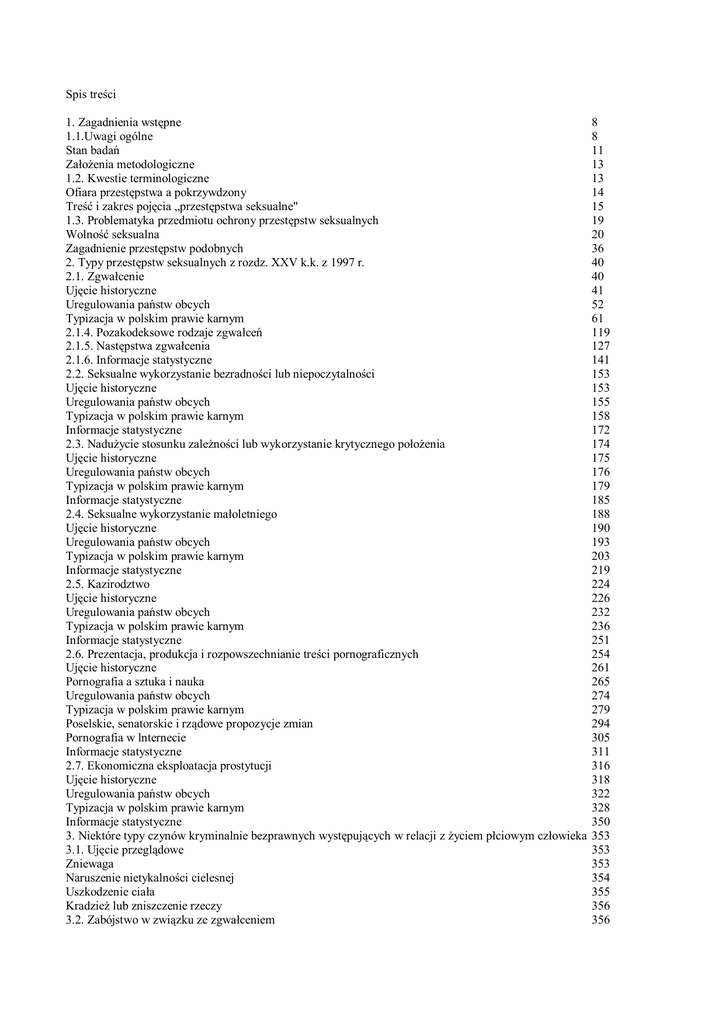 Spis treści 1. Zagadnienia wstępne 1.1.Uwagi ogólne Stan badań Założenia metodologiczne 1.2. Kwestie terminologiczne Ofiara przestępstwa a pokrzywdzony Treść i zakres pojęcia „przestępstwa seksualne" 1.3. Problematyka przedmiotu ochrony przestępstw seksualnych Wolność seksualna Zagadnienie przestępstw podobnych 2. Typy przestępstw seksualnych z rozdz. XXV k.k. z 1997 r. 2.1. Zgwałcenie Ujęcie historyczne Uregulowania państw obcych Typizacja w polskim prawie karnym 2.1.4. Pozakodeksowe rodzaje zgwałceń 2.1.5. Następstwa zgwałcenia 2.1.6. Informacje statystyczne 2.2. Seksualne wykorzystanie bezradności lub niepoczytalności Ujęcie historyczne Uregulowania państw obcych Typizacja w polskim prawie karnym Informacje statystyczne 2.3. Nadużycie stosunku zależności lub wykorzystanie krytycznego położenia Ujęcie historyczne Uregulowania państw obcych Typizacja w polskim prawie karnym Informacje statystyczne 2.4. Seksualne wykorzystanie małoletniego Ujęcie historyczne Uregulowania państw obcych Typizacja w polskim prawie karnym Informacje statystyczne 2.5. Kazirodztwo Ujęcie historyczne Uregulowania państw obcych Typizacja w polskim prawie karnym Informacje statystyczne 2.6. Prezentacja, produkcja i rozpowszechnianie treści pornograficznych Ujęcie historyczne Pornografia a sztuka i nauka Uregulowania państw obcych Typizacja w polskim prawie karnym Poselskie, senatorskie i rządowe propozycje zmian Pornografia w lnternecie Informacje statystyczne 2.7. Ekonomiczna eksploatacja prostytucji Ujęcie historyczne Uregulowania państw obcych Typizacja w polskim prawie karnym Informacje statystyczne 3. Niektóre typy czynów kryminalnie bezprawnych występujących w relacji z życiem płciowym człowieka 3.1. Ujęcie przeglądowe Zniewaga Naruszenie nietykalności cielesnej Uszkodzenie ciała Kradzież lub zniszczenie rzeczy 3.2. Zabójstwo w związku ze zgwałceniem 8 8 11 13 13 14 15 19 20 36 40 40 41 52 61 119 127 141 153 153 155 158 172 174 175 176 179 185 188 190 193 203 219 224 226 232 236 251 254 261 265 274 279 294 305 311 316 318 322 328 350 353 353 353 354 355 356 356 Sterylizacja na żądanie Transseksualizm - dopuszczalność zabiegów korekcyjnych Narażenie na zarażenie chorobą weneryczną lub AIDS 4. Problematyka karalności niektórych form i sposobów osiągania satysfakcji seksualnej Uwagi wstępne Homoseksualizm Sadyzm i masochizm Zwierzęta i rośliny jako obiekty seksualne Nekrofilia Ekshibicjonizm i inne publiczne czynności seksualne 5. Wybrane zagadnienia związane z zapobieganiem i zwalczaniem przestępczości seksualnej Edukacja seksualna Wykrywanie i ujawnianie sprawców przestępstw seksualnych Badania sądowo-lekarskie Syndrom sztokholmski 5.3. Kastracja przestępców seksualnych Kastracja chirurgiczna Kastracja chemiczna 6. Podsumowanie Literatura przedmiotu Aneks Zestawienia statystyczne -ujęcie przekrojowe Wybór orzecznictwa Sądu Najwyższego i sądów apelacyjnych w zakresie przestępstw seksualnych Wybór aktów prawnych Spis rysunków, tabel i wykresów Sexual offences in Polish criminal law (summary) 364 372 383 391 391 392 400 401 403 405 420 421 423 424 424 425 426 430 434 436 457 458 469 487 519 523