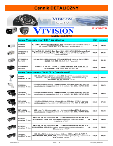 Cennik DETALICZNY 2013.V1DETAL KAMERY KOLOROWE Kamery Wewnętrzne typu " BOX " bez obiektywu cena netto cena brutto VTV-621R Day-Night 0,1 lux/F1.2, 600 linii; CCD-Sony Super HAD; przechodzi w tryb czarno-biały przy ok. 1 lux; zasilanie: 12V DC; AES, AGC, AWB, BLC; AutoIris-video & DC; 243,00 298,89 VTV-512 WDR Day-Night 0,01 lux/F1.2, 650 linii; CCD-Sony Super HAD; OSD, D-WDR, 3DNR, Sens-up, Strefy Prywatności, Detekcja Ruchu, ATW, AWB, zasilanie: 12V DC; BackLightControl; AutoIris-video & DC; 322,00 396,06 VTV-514 WDR Day-Night 0,03 lux / F1.2, 680 linii KOLOR, CCD-SONY EFFIO-E, zasilanie 12V DC, 2DNR, D-WDR, AWB, OSD, DC, BLC, Strefy Prywatności 408,00 501,84 VTV-513 WDR Day-Night 0,05 lux/F1.2, 620 linii / 720 linii, CCD-Sony Super Had, WDR, 2DNR, FILTR MECHANICZNY, ATW, AWB, OSD, DC, BLC, 12V 454,00 558,42 LED-0 lux, 420 linii; obiektyw: 3.6mm; CCD-Sharp 1/3"; obudowa zewnętrzna z daszkiem i uchwytem (możliwość montażu do sufitu) - wodoszczelna; zasięg podczerwieni: do 15m; zasilanie: 12V DC 146,00 179,58 LED-0 lux, 650 linii; obiektyw 2.8 mm - 12.0 mm; CCD-Sony Super Had; obudowa wandaloodporna; zasięg podczerwieni: 30 m; zasilanie: 12V, OSD, D-WDR, 3DNR 312,00 383,76 CDR-805JC oświetlacz IR 30m LED-0 lux, 650 linii; obiektyw 2.8 mm - 12.0 mm; CCD-Sony Super Had; obudowa wandaloodporna; zasięg podczerwieni: 30 m; zasilanie: 12V, OSD, D-WDR, 3DNR 312,00 383,76 CDR-805JX oświetlacz IR 30m LED-0 lux, 700 linii; obiektyw 4.0 mm - 9.0 mm; CCD-Sony EFFIO-E ; obudowa wandaloodporna; zasięg podczerwieni: 30 m; zasilanie: 12V, OSD, D-WDR, DNR 306,00 376,38 CDR-805JXL oświetlacz IR 30m LED-0 lux, 700 linii; obiektyw 2.8 mm - 12.0 mm; CCD-Sony EFFIO-E ; obudowa wandaloodporna; zasięg podczerwieni: 30 m; zasilanie: 12V, OSD, D-WDR, 3DNR 328,00 403,44 VTV-906X oświetlacz IR 30m LED-0 lux, 650 linii; obiektyw 2.8 mm - 12.0 mm; CCD-Sony Super Had; FILTR IR MECHANICZNY, WDR, OSD, obudowa wandaloodporna; zasięg podczerwieni: 30 m; zasilanie: 12V/24V 568,00 698,64 VTV-906XL oświetlacz IR 30m LED-0 lux, 700 linii; obiektyw 2.8 mm - 12.0 mm; CCD-Sony Super Had; FILTR IR MECHANICZNY, WDR, OSD, obudowa wandaloodporna; zasięg podczerwieni: do 30 m; zasilanie: 12V/24V 614,00 755,22 LED-0 lux, 700 linii; obiektyw 2.8 mm - 12.0 mm; CCD-Sony Effio-E; FILTR IR VTV-907XL MECHANICZNY, WDR, 3DNR, OSD, obudowa wandaloodporna; zasięg podczerwieni:do oświetlacz IR 50m 50m; zasilanie: 12V/24V 675,00 830,25 Kamery Zewnętrzne typu " BULLET " z Oświetlaczem IR VTV-647 oświetlacz IR 15m VV-705X V.3 oświetlacz IR 30m www.vidicon.pl Strona 1 z 19 cctv_sswin_detaliczny KAMERY KOLOROWE Kamery Szybkoobrotowe VTVision cena netto cena brutto VTV-HSD-30X Kamera szybkoobrotowa dzień-noc CCD 1/4" Sony Super HAD, 650linii, 0.1lux Day/0.01lux Night, WDR, DNR, obiektyw 3,4-102mm F1.6, zoom optyczny 30X, obudowa zewnętrzna. ( kamera bez zasilacza i uchwytu ) 3229,00 3971,67 VTV-HSD-36X Kamera szybkoobrotowa dzień-noc CCD 1/4" Sony Super HAD, 650linii, 0.1lux Day/0.01lux Night, WDR, DNR, obiektyw 3,4-122mm F1.6, zoom optyczny 36X, obudowa zewnętrzna. ( kamera bez zasilacza i uchwytu ) 3383,00 4161,09 UCHWYT W-MINI Uchwyt ścienny mini 20 cm 183,00 225,09 UCHWYT S25CM Uchwyt sufitowy 25cm 175,00 215,25 UCHWYT S50CM Uchwyt sufitowy 50cm 192,00 236,16 UCHWYT N-BOX Uchwyt narożny z miejscem na zasilacz (wymaga zastosowania dodatkowo UCHWYTU MINI) 362,00 445,26 Uchwyt do montażu na słupie (wymaga zastosowania dodatkowo UCHWYTU MINI) 208,00 255,84 ZASILACZ 24V Zasilacz do głowic 24V AC 3A 208,00 255,84 VTV-K31 PLUS Klawiatura do sterowania DVR N31/21 oraz GŁOWIC PTZ po RS485 z joystikiem 1677,00 2062,71 254,00 312,42 638,00 784,74 UCHWYT SP Kamery płytkowe kolorowe VTV-501N Day-Night 0.2lux; 600 linii; 32x32; obiektyw: pinhole 3,6mm; CCD-Sony, OSD, tor audio, zasilanie 12V Kamera miniaturowa typu "wizjer", kolorowa KPC-190/PHDV door viewer 0.05lux, 550 linii, CCD-SONY SUPER HAD II, obudowa o regulowanej długości od 30 do 67mm, średnica 20 mm, Kąt widzenia 170 st. (typu wizjer do drzwi), zasilanie 12V Kamery kopułkowe kolorowe wewnętrzne VTV-D6A3 0.1lux, 520 linii; obiektyw 3.6mm, CCD-Sony; AES, AGC, AWB; obudowa plastikowa; zasilanie 12V 137,00 168,51 VTV-D6A4 0.01lux, 600 linii; obiektyw 3.6mm, CCD-Sony Super HAD ; AES, AGC, AWB; obudowa plastikowa; zasilanie 12V 183,00 225,09 CDR-100WDR 0.01lux , 700 linii ; obiektyw : 3.6mm, CCD-Sony EFFIO-E; OSD, D-WDR, DNR, strefy prywatności 8 ; obudowa plastikowa; zasilanie 12V 245,00 301,35 www.vidicon.pl Strona 2 z 19 cctv_sswin_detaliczny CDR-105K 0,001lux ( Sense -UP ON), 540 linii, obiektyw 3.5 - 8.0mm, CCD-Sony Super HAD, AES, ATW, AGC, 12V, obudowa plastikowa, zasilanie 12V 223,00 274,29 CDR-105JC V.3 0,001lux ( Sense -UP ON), 650 linii, obiektyw 2.8 - 12.0mm, CCD-Sony Super HAD, OSD, 3DNR, DWDR, obudowa plastikowa, zasilanie 12V 275,00 338,25 CDR-105J 0,001lux ( Sense -UP ON), 600 linii, obiektyw 3.5 - 8.0mm, CCD-Sony Super HAD, 2 DNR, AES, ATW, AGC, 12V, obudowa plastikowa, zasilanie 12V 245,00 301,35 CDR-105JX 0,01lux , 700 linii, obiektyw 4.0 - 9.0mm, CCD-Sony EFFIO-E, OSD, WDR, DNR, AES, ATW, AGC, 12V, obudowa plastikowa, zasilanie 12V 291,00 357,93 0,001lux ( Sense -UP ON), 650 linii, obiektyw 2.8 - 12.0mm, CCD-Sony Super HAD, OSD, 3DNR, DWDR, oświetlacz IR 20m,obudowa plastikowa, o zasilanie 12V 306,00 376,38 CDR-106JX 0,01lux , 700 linii, obiektyw 4.0 - 9.0mm, CCD-Sony EFFIO-E, OSD, WDR, DNR, AES, ATW, AGC, 12V, oświetlacz IR 20m, obudowa plastikowa, zasilanie 12V 322,00 396,06 VTV-607WDRn 0,03 lux/F1.2, 600 linii, obiektyw 2.8-12.0mm, CCD-Sony Super Had, 12V, WDR, DNR, ATW, AWB, OSD, DC, BLC, 12V, obudowa plastikowa 368,00 452,64 CDR-106JC V.3 www.vidicon.pl Strona 3 z 19 cctv_sswin_detaliczny KAMERY KOLOROWE Kamery kopułkowe kolorowe zewnętrzne cena netto cena brutto VTV-617WDRn 0,03 lux/F1.2, 600 linii, obiektyw 2.8-12.0mm, CCD-Sony Super Had, 12V, WDR, DNR, ATW, AWB, OSD, DC, BLC, 12V, obudowa zewnętrzna wandaloodporna 414,00 509,22 V