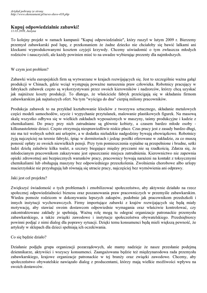 Artykuł pobrany ze strony http://www.ekonsument.pl/news-show-418.php Kupuj odpowiedzialnie zabawki! 11.03.2009, Justyna To kolejny projekt w ramach kampanii "Kupuj odpowiedzialnie", który ruszył w lutym 2009 r. Bierzemy przemysł zabawkarski pod lupę, z przekonaniem że żadne dziecko nie chciałoby się bawić lalkami ani klockami wyprodukowanymi kosztem czyjejś krzywdy. Chcemy uświadomić o tym zwłaszcza młodych rodziców i nauczycieli, ale każdy powinien mieć to na uwadze wybierając prezenty dla najmłodszych. W czym jest problem? Zabawki wielu europejskich firm są wytwarzane w krajach rozwijających się. Jest to szczególnie ważna gałąź produkcji w Chinach, gdzie wciąż występują poważne naruszenia praw człowieka. Robotnicy pracujący w fabrykach zabawek często są wykorzystywani przez swoich kierowników i nadzorców, którzy chcą uzyskać jak najniższe koszty produkcji. To dlatego, że właściciele fabryk prześcigają się w składaniu firmom zabawkarskim jak najtańszych ofert. Na tym "wyścigu do dna" cierpią miliony pracowników. Produkcja zabawek to na przykład kształtowanie klocków z tworzywa sztucznego, składanie metalowych części modeli samochodów, szycie i wypychanie przytulanek, malowanie plastikowych figurek. Na masową skalę wszystko odbywa się w wielkich zakładach wyposażonych w maszyny, taśmy produkcyjne i kadzie z chemikaliami. Do pracy przy nich zatrudniane są głównie kobiety, a czasem bardzo młode osoby kilkunastoletnie dzieci. Często otrzymują niesprawiedliwie niskie płace. Czas pracy jest z zasady bardzo długi, nie ma też wolnych sobót ani urlopów, a w dodatku nieludzkie nadgodziny bywają obowiązkowe. Robotnicy żyją najczęściej na terenie fabryki, śpiąc w dormitoriach i jedząc posiłki oferowane w zakładzie, za co muszą ponosić opłaty ze swoich niewielkich pensji. Przy tym pomieszczenia sypialne są przepełnione i brudne, setki ludzi dzielą zaledwie kilka toalet, a szczury biegające między pryczami nie są rzadkością. Zdarza się, że młodocianym pracownikom zakazywane jest opuszczanie miejsca zatrudnienia. Kierownictwo nie zapewnia opieki zdrowotnej ani bezpiecznych warunków pracy, pracownicy bywają narażeni na kontakt z toksycznymi chemikaliami lub obsługują maszyny bez odpowiedniego przeszkolenia. Zwolnienia chorobowe albo urlopy macierzyńskie nie przysługują lub równają się utracie pracy, najczęściej bez wymówienia ani odprawy. Jaki jest cel projektu? Zwiększyć świadomość o tych problemach i zmobilizować społeczeństwo, aby aktywnie działało na rzecz społecznej odpowiedzialności biznesu oraz poszanowania praw pracowniczych w przemyśle zabawkarskim. Wiedza pomoże rodzicom w dokonywaniu lepszych zakupów, podobnie jak pracownikom przedszkoli i innych instytucji wychowawczych. Firmy importujące zabawki z krajów rozwijających się będą miały motywację, aby stawiać swoim dostawcom odpowiednie wymagania oraz właściwie kontrolować, czy zakontraktowane zakłady je spełniają. Ważną rolę mogą tu odegrać organizacje patronackie przemysłu zabawkarskiego, a także związki zawodowe i instytucje społeczeństwa obywatelskiego. Przedsiębiorcy powinni podjąć z nimi dialog dla poprawy sytuacji. Dzięki temu konsumenci będą mieli większą pewność, że artykuły w sklepach dla dzieci spełniają ich oczekiwania. Co się będzie działo? Działanie podjęła grupa organizacji pozarządowych, ale mamy nadzieje że nasze przesłanie podejmą dziennikarze, aktywiści i wszyscy konsumenci. Zaangażowana będzie też międzynarodowa rada przemysłu zabawkarskiego, krajowe organizacje patronackie w tej branży oraz związki zawodowe. Chcemy, aby społeczeństwo obywatelskie nawiązało dialog z producentami, którzy mają wielkie możliwości wpływu na swoich dostawców. Aby to osiągnąć, stworzymy kampanię społeczną. Wydamy ulotki i poradniki dla aktywistów, uruchomimy też stronę internetową oraz neweslettery z informacjami, których będzie nam dostarczać nam partnerska organizacja z Hong-Kongu. Będziemy na bieżąco informować o pilnych apelach do firm, jeśli pojawią się doniesienia o poważnych nadużyciach. Wraz z partnerskimi organizacjami z Europy będzie prowadzony lobbing i bezpośrednie negocjacje z branżą zabawkarską, wsparty waszymi podpisami pod petycją, którą opracujemy. Chcemy, żeby nasza akcja dotarła do jak największej liczby osób. Dlatego liczymy na zaangażowanie aktywistów i multiplikatorów, dla których przewidziane są ciekawe szkolenia. Zapraszamy chętnych do współpracy przy organizacji eventów! Im więcej osób się zaangażuje jako organizatorzy, uczestnicy i widzowie, tym więcej zastanowi się sięgając w sklepie po zabawkę. Tak damy producentom do myślenia. Partnerzy projektu: - Suedwind Agentur, Austria - Peuples Solidaires, Francja - Fair Trade Society, Czechy - Polska Zielona Sieć, Polska - AUR, Rumunia